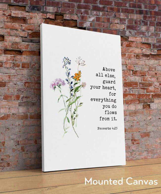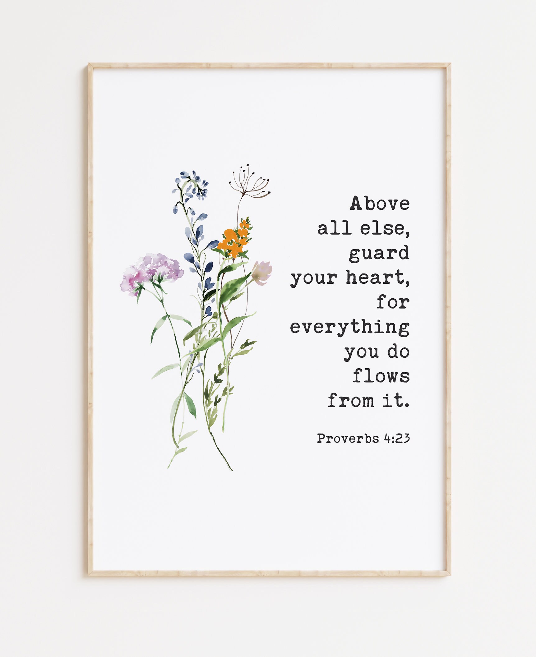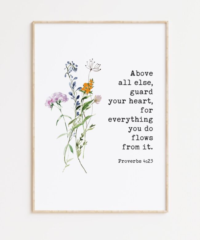 This art print is more than just decor; it’s a visual representation of the profound wisdom found in Proverbs 4:23. The verse, “Above all else, guard your heart, for everything you do flows from it,” is elegantly rendered in typography, surrounded by a whimsical bouquet of wildflowers.
