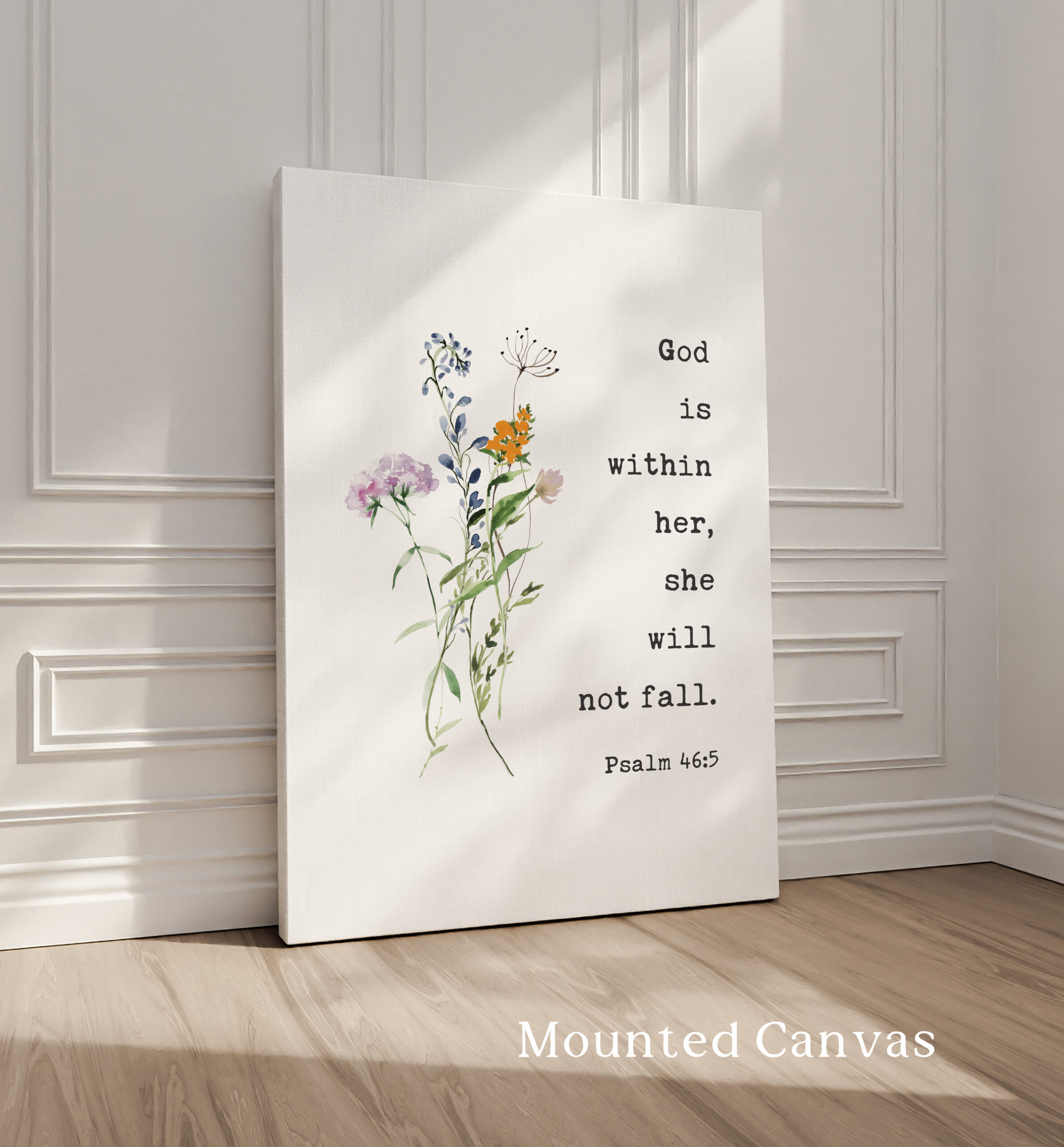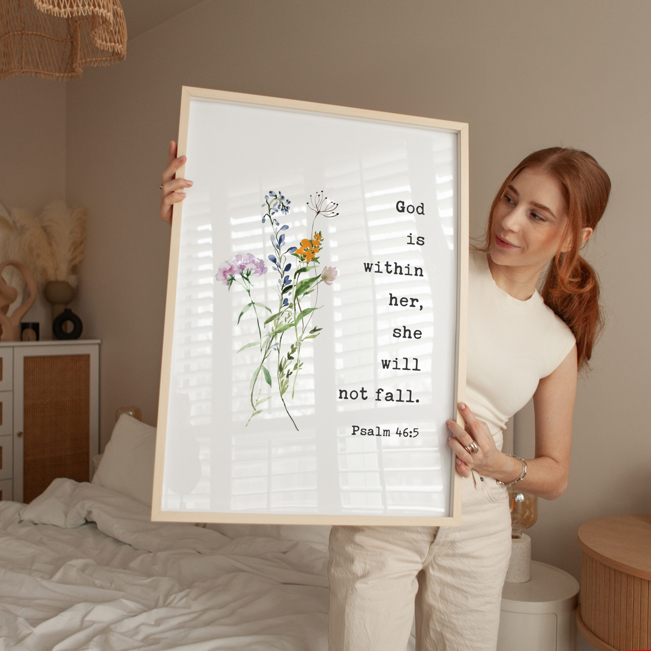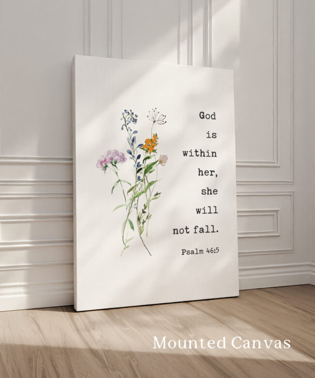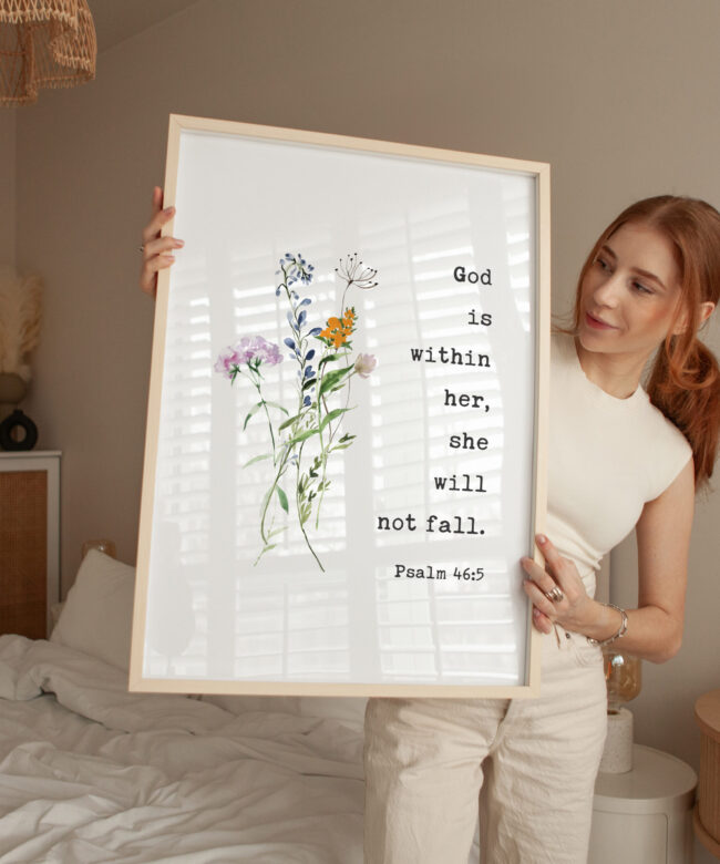 Embodying strength and faith, this “God is Within Her” typography print showcases Psalm 46:5, “she will not fall.” The delicate floral illustration adds a touch of elegance and serenity, while the words inspire resilience and inner peace. This meaningful print will uplift any space, reminding those who see it of the divine support and unshakeable strength within them. Perfect for personal spaces, women’s rooms, or as a thoughtful gift.