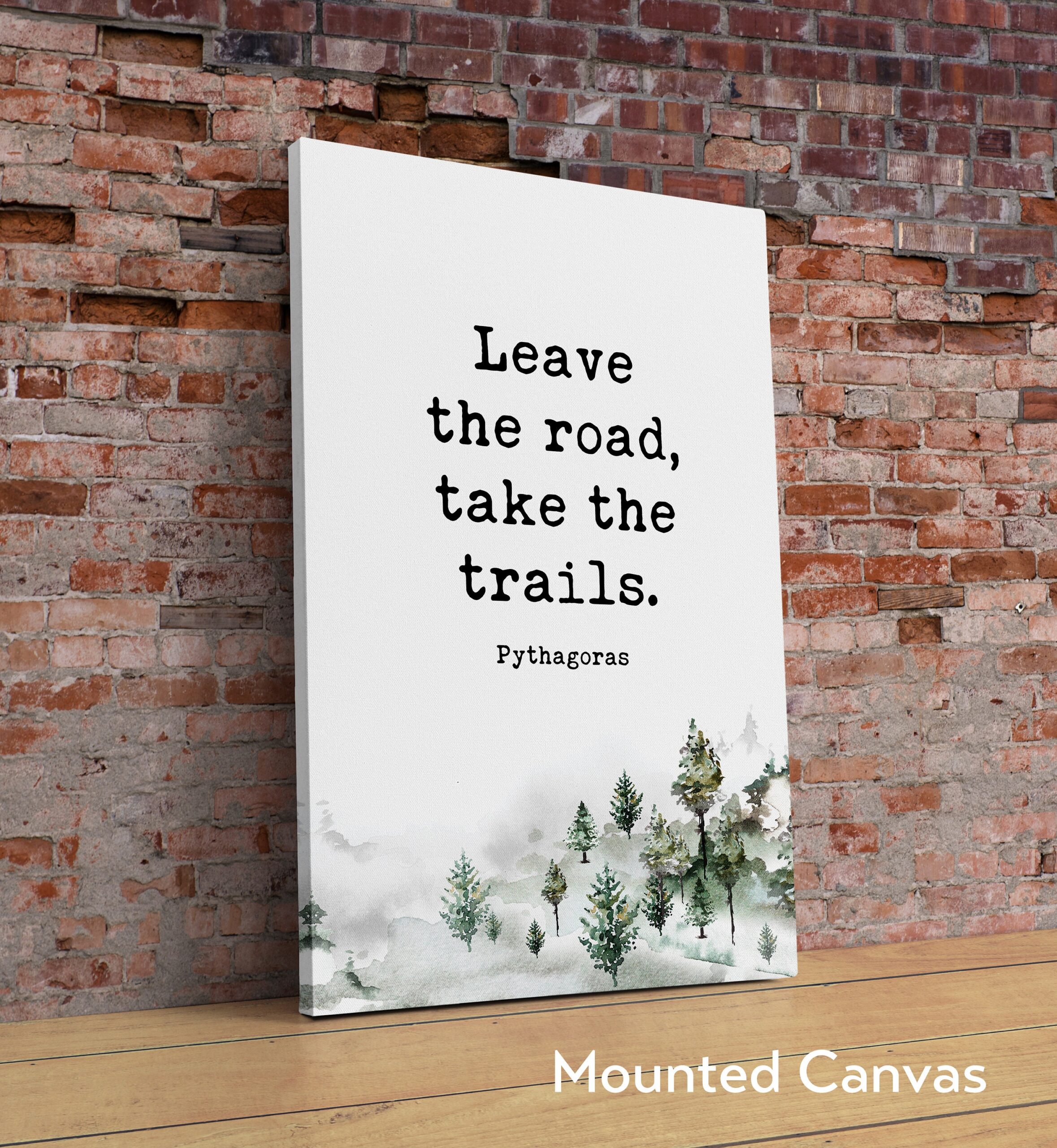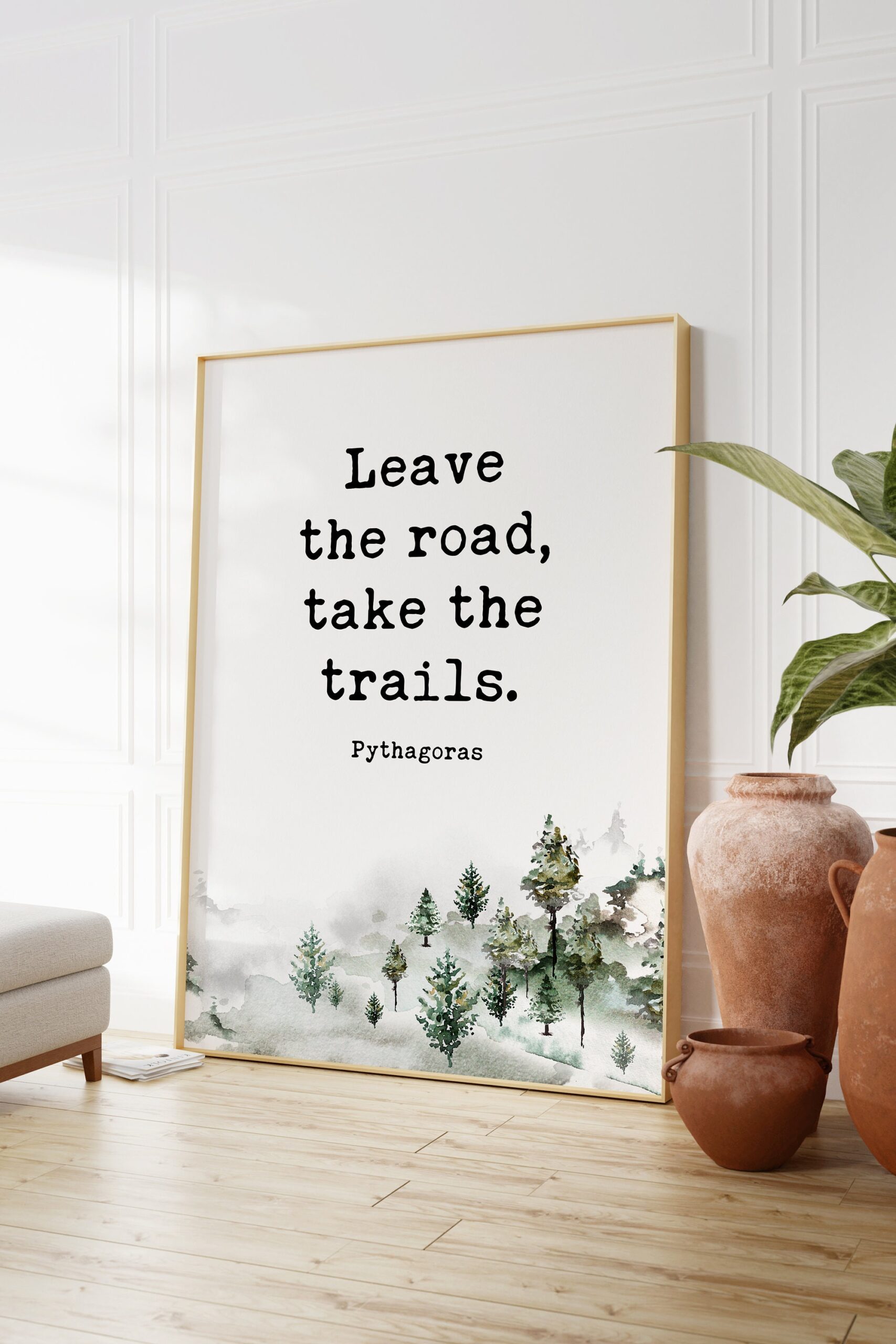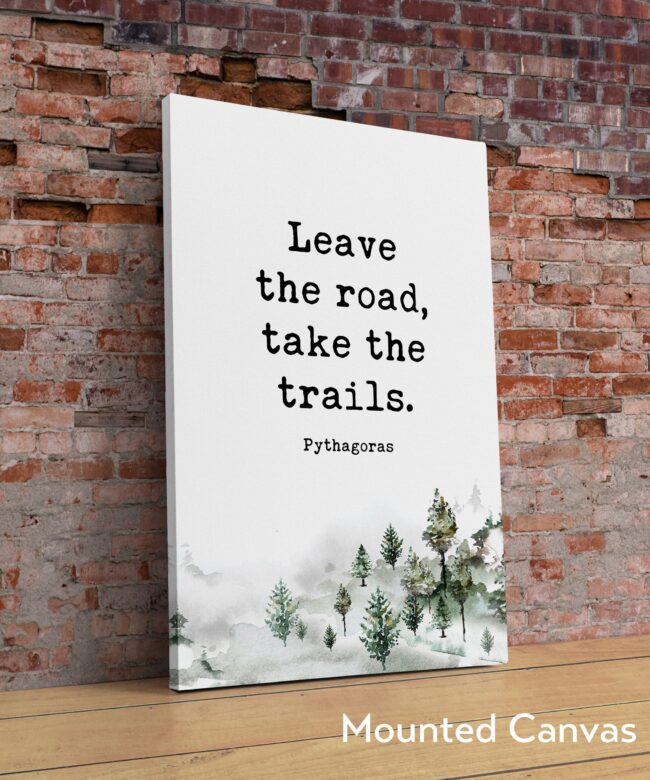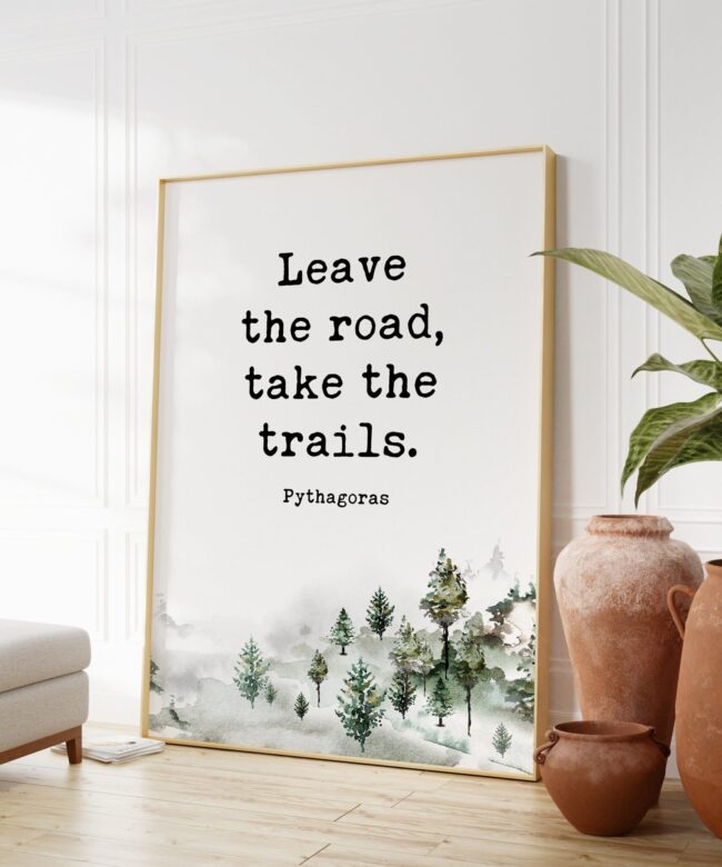 Escape the ordinary and embrace the adventure with this stunning artwork that combines the wisdom of Pythagoras and the beauty of nature. “Leave the road, take the trails” – these words inspire you to explore new paths and find your own way in life.