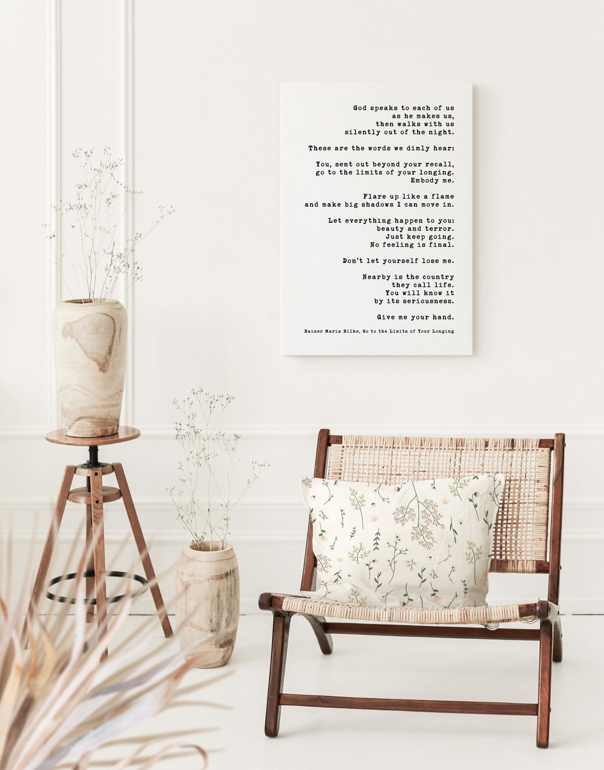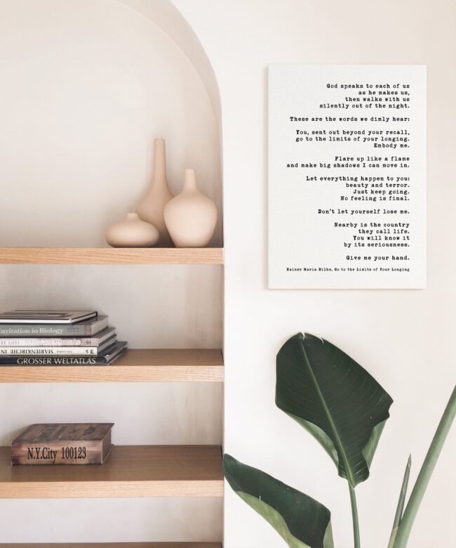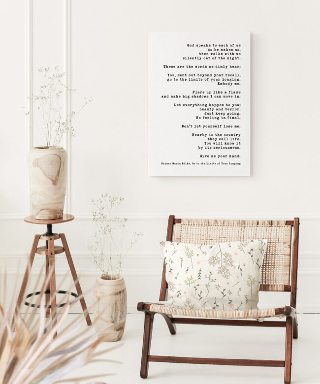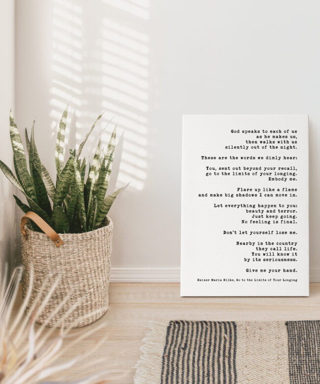 Immerse yourself in the profound wisdom of Rainer Maria Rilke with this captivating low-profile mounted canvas featuring his evocative poem “Go to the Limits of Your Longing”