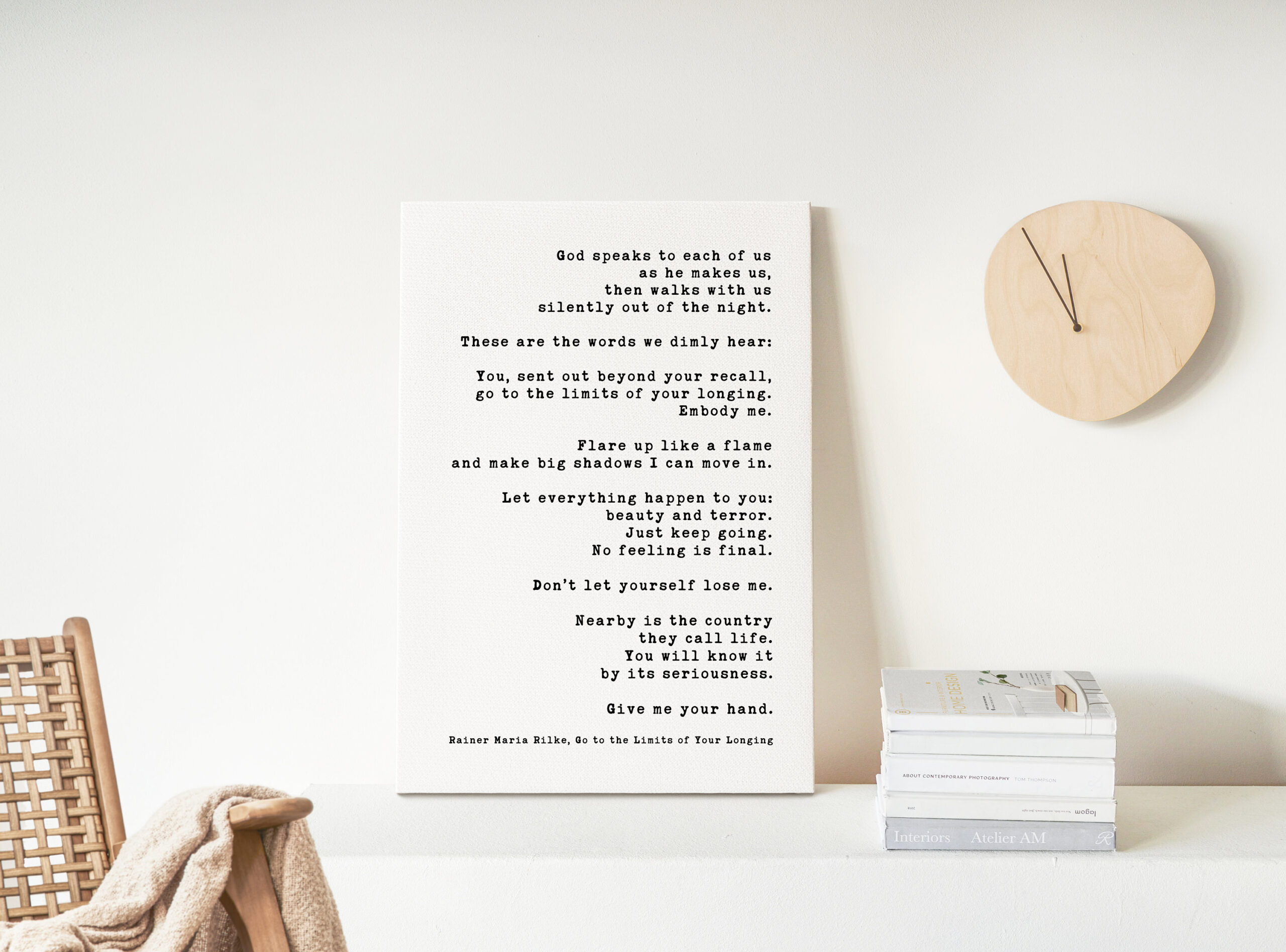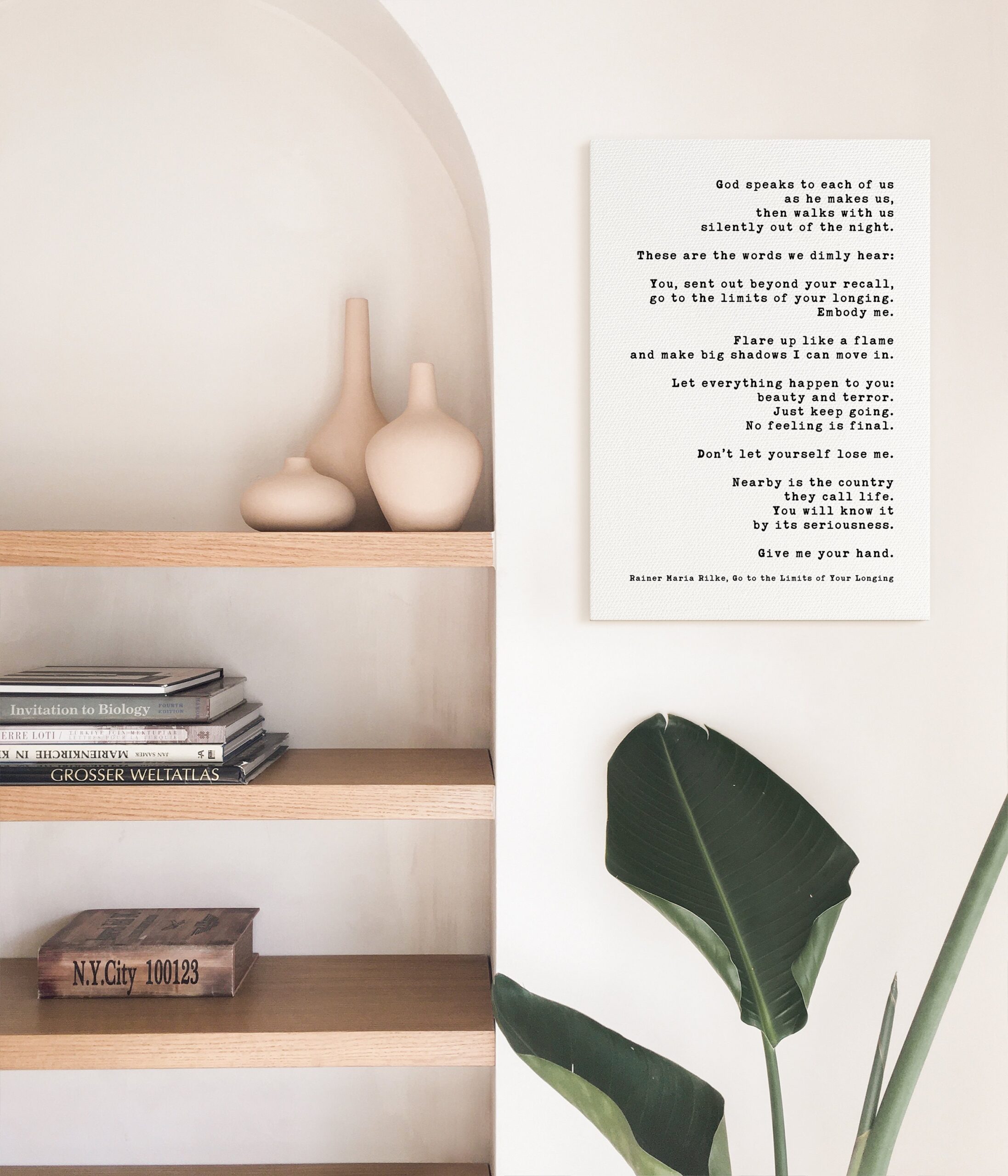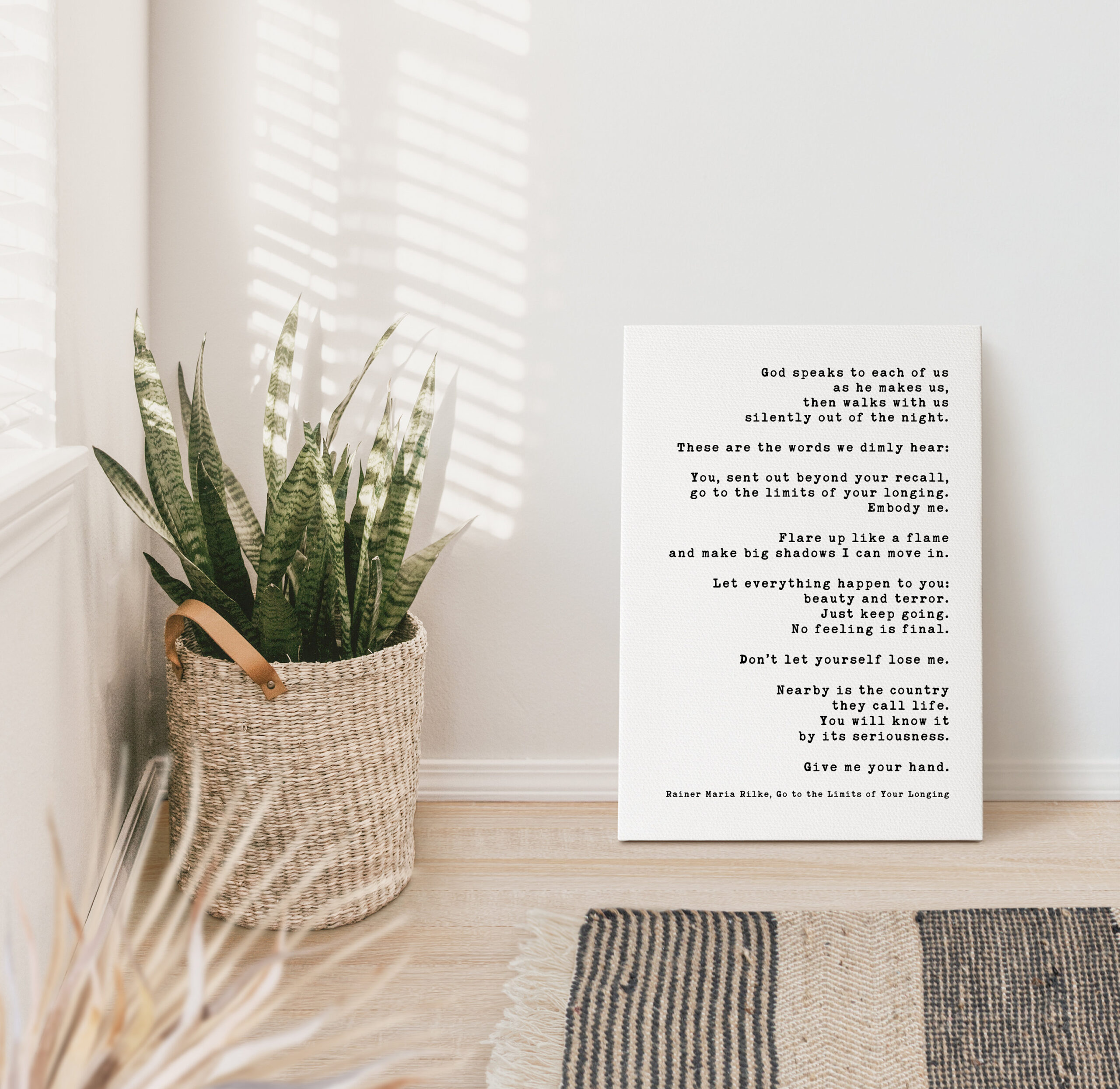 Immerse yourself in the profound wisdom of Rainer Maria Rilke with this captivating low-profile mounted canvas featuring his evocative poem “Go to the Limits of Your Longing”