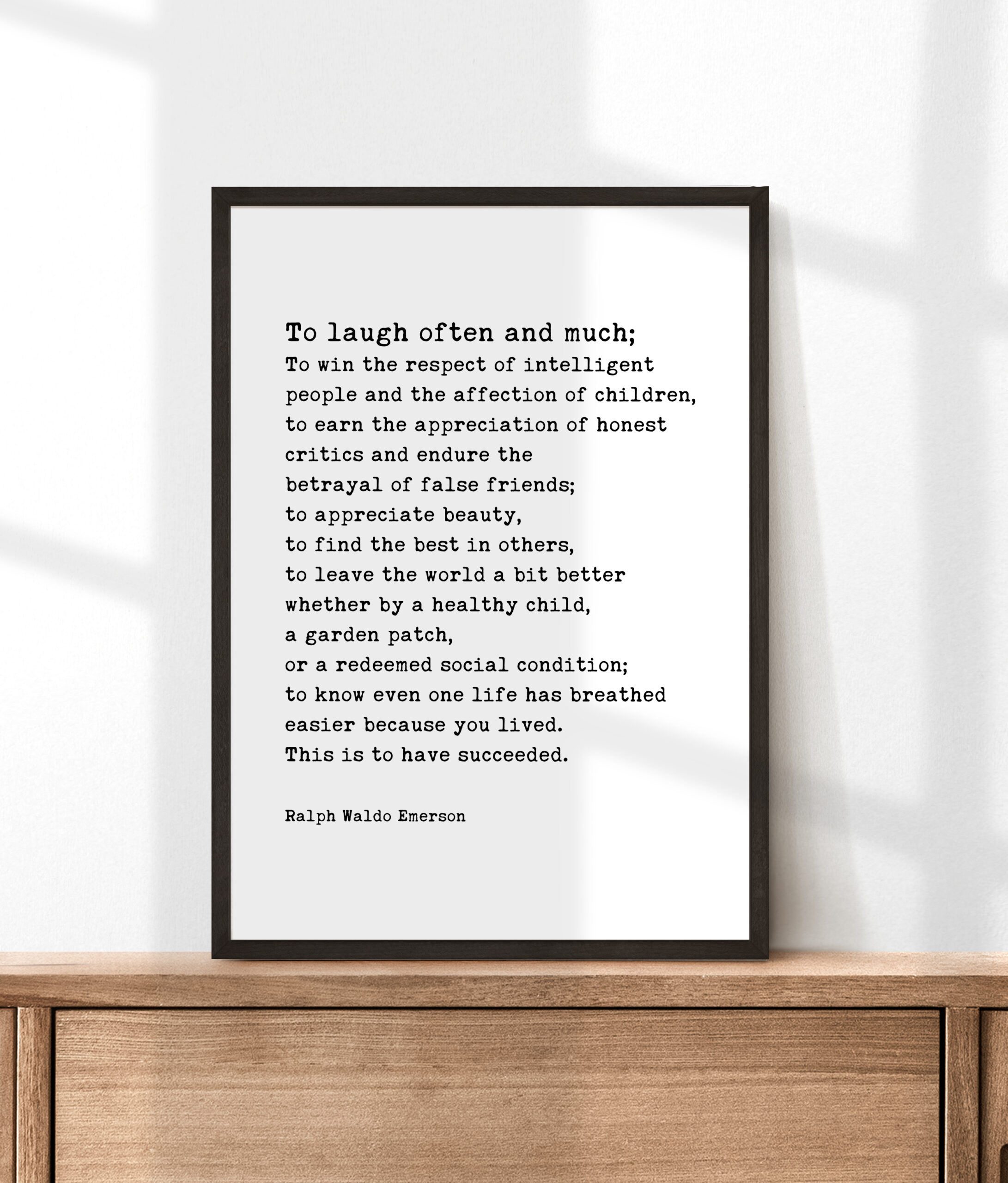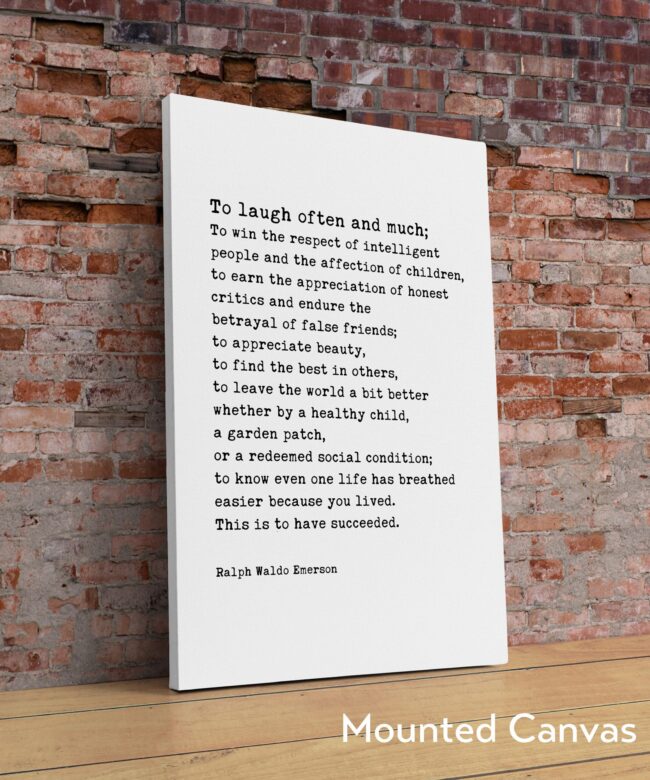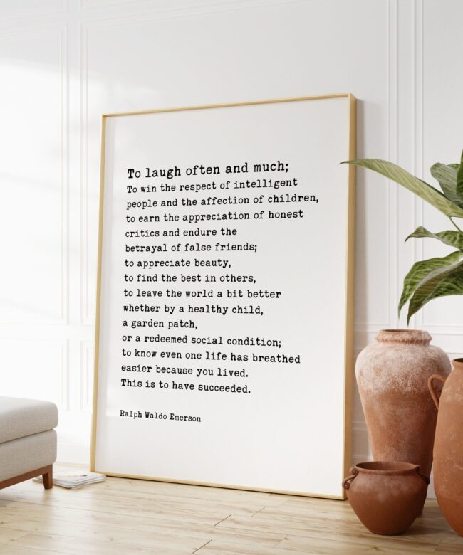 Embrace the essence of life with this artful print, “To laugh often and much; to win the respect of the intelligent” by Ralph Waldo Emerson. These words resonate with the heart and soul, reminding us of life’s true treasures.