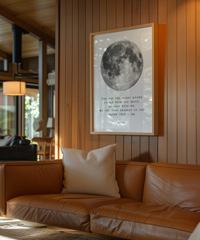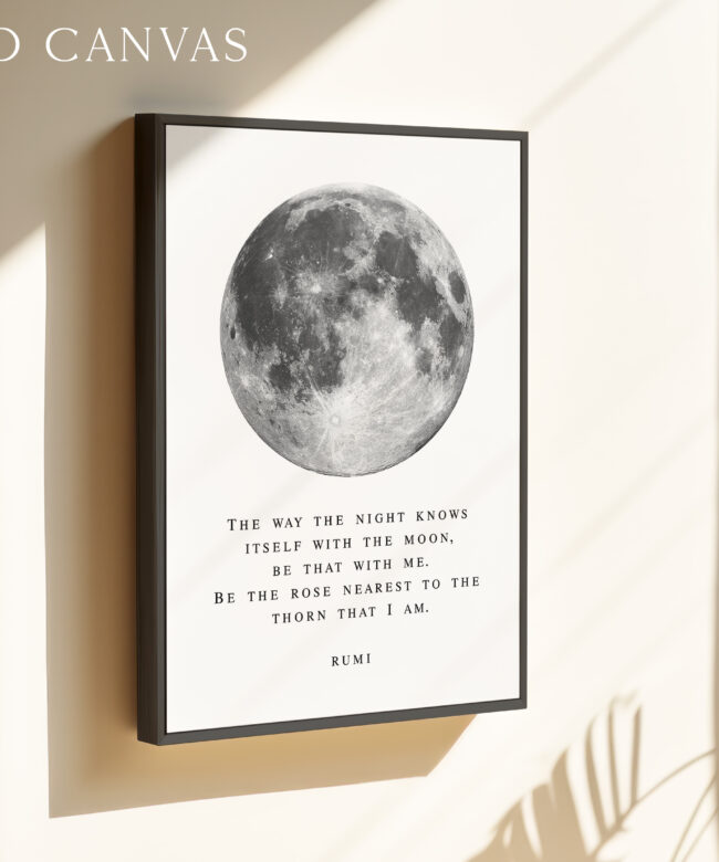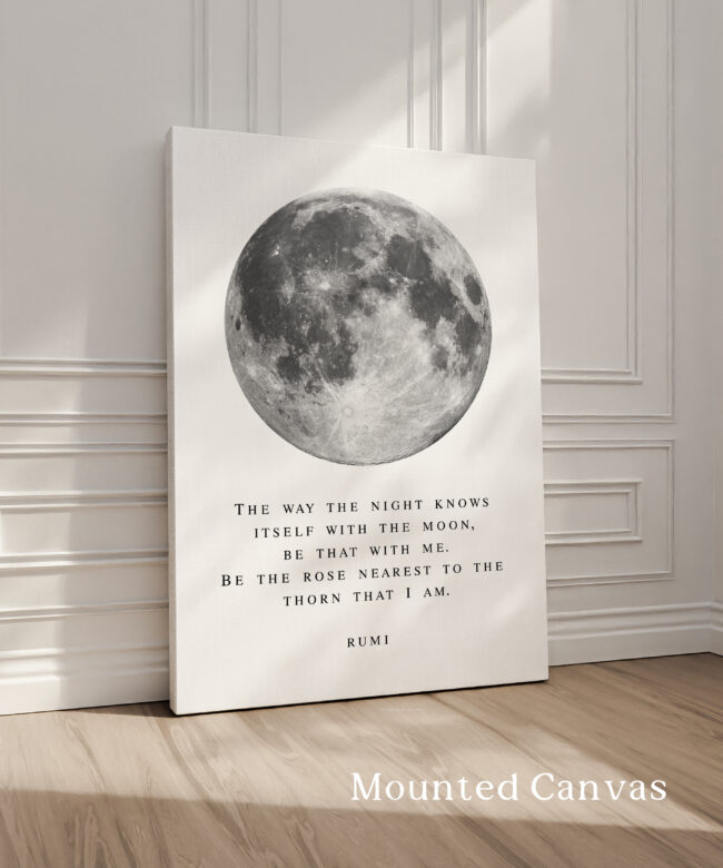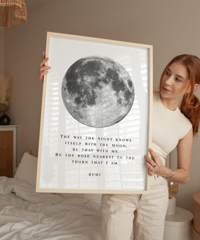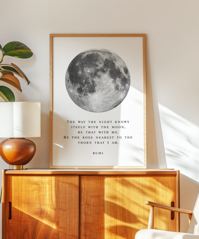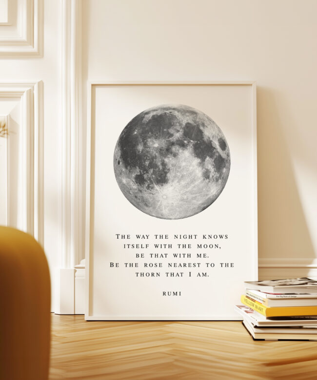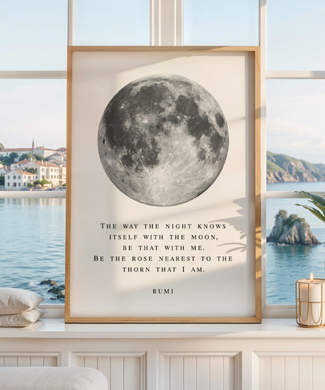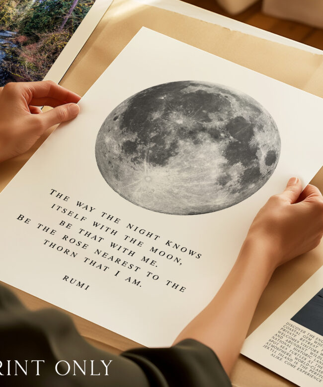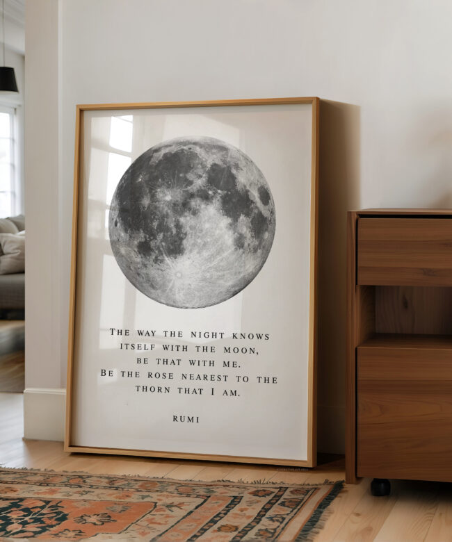 Bring a sense of calm and wonder into your space with this Rumi typography art print. Featuring a striking full moon illustration paired with a poetic quote, this piece blends minimal design with deep meaning.