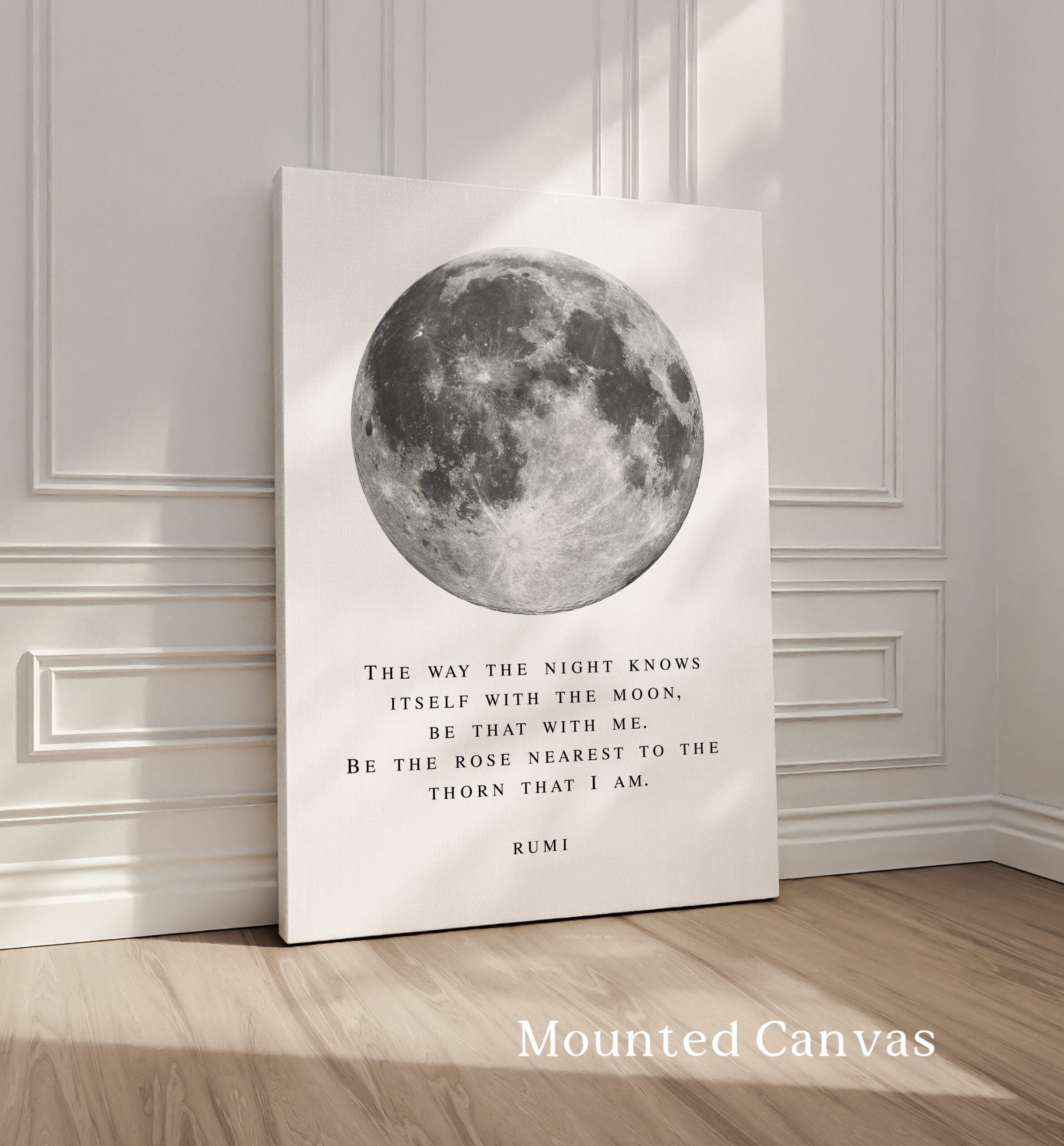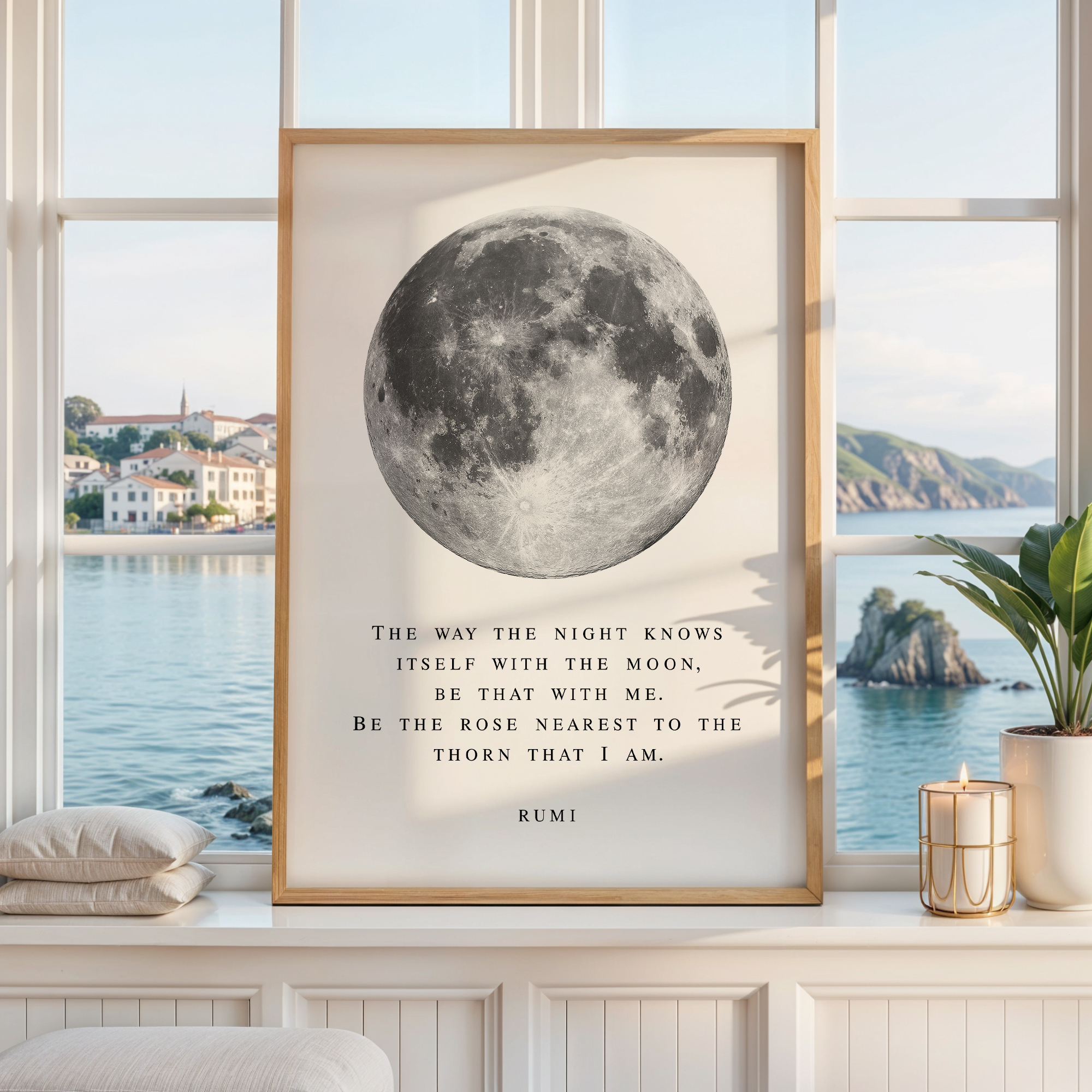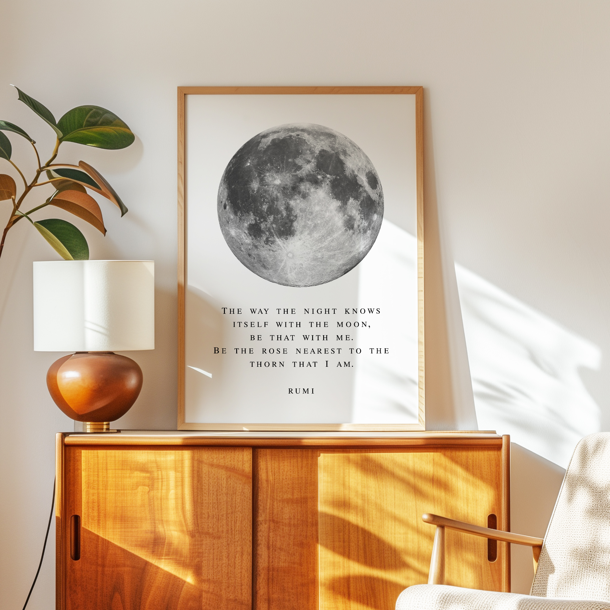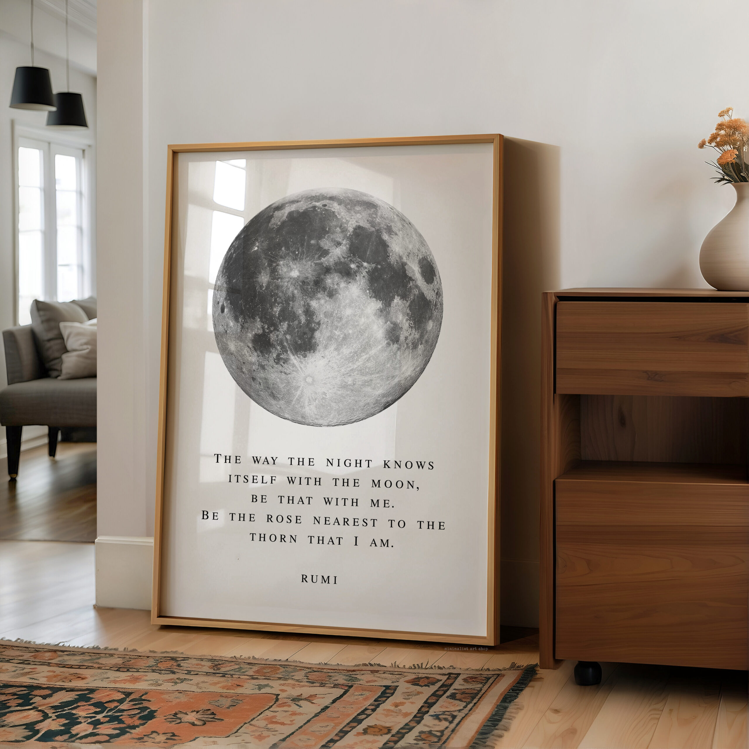 Bring a sense of calm and wonder into your space with this Rumi typography art print. Featuring a striking full moon illustration paired with a poetic quote, this piece blends minimal design with deep meaning.