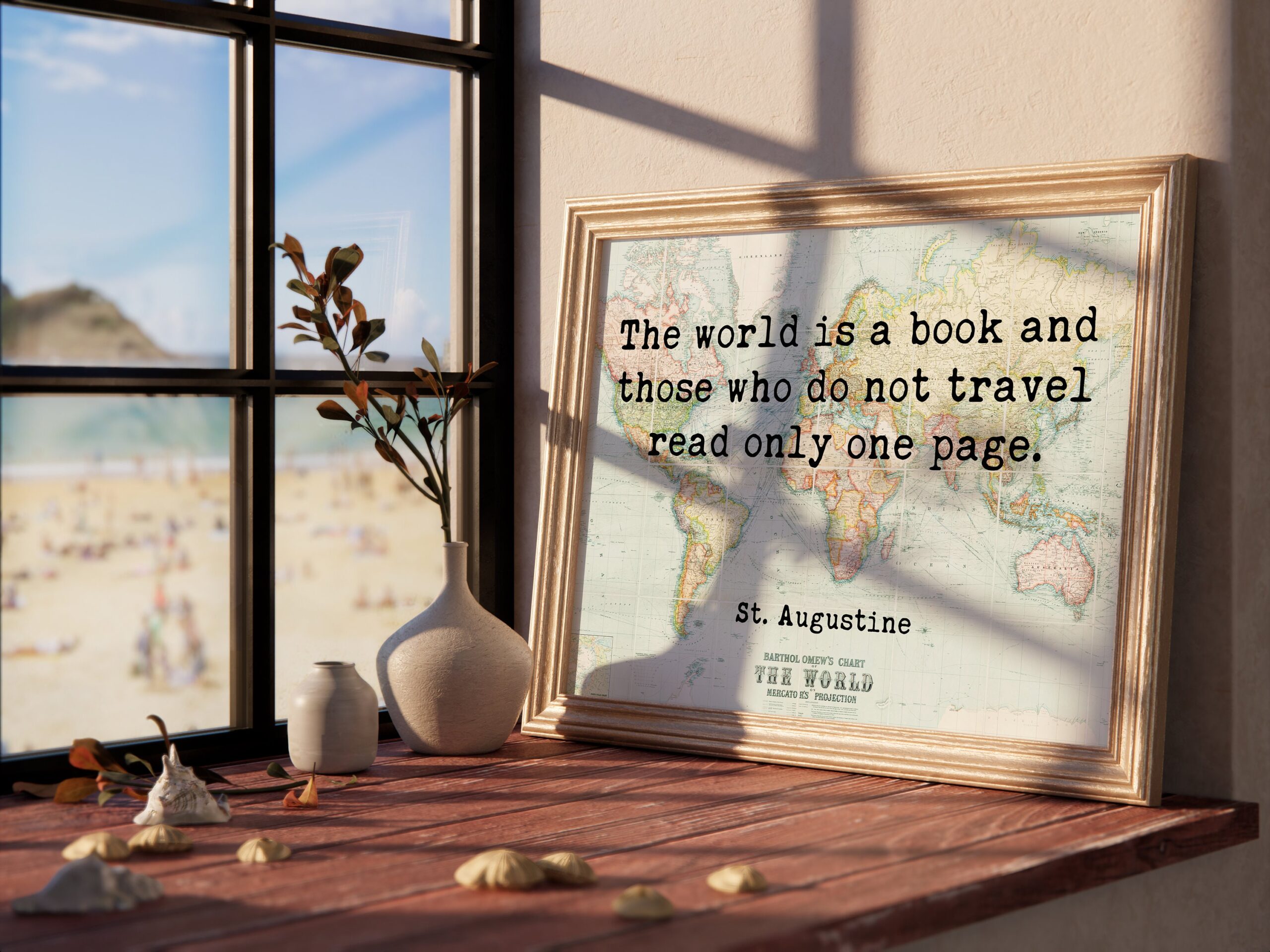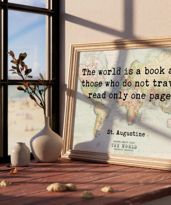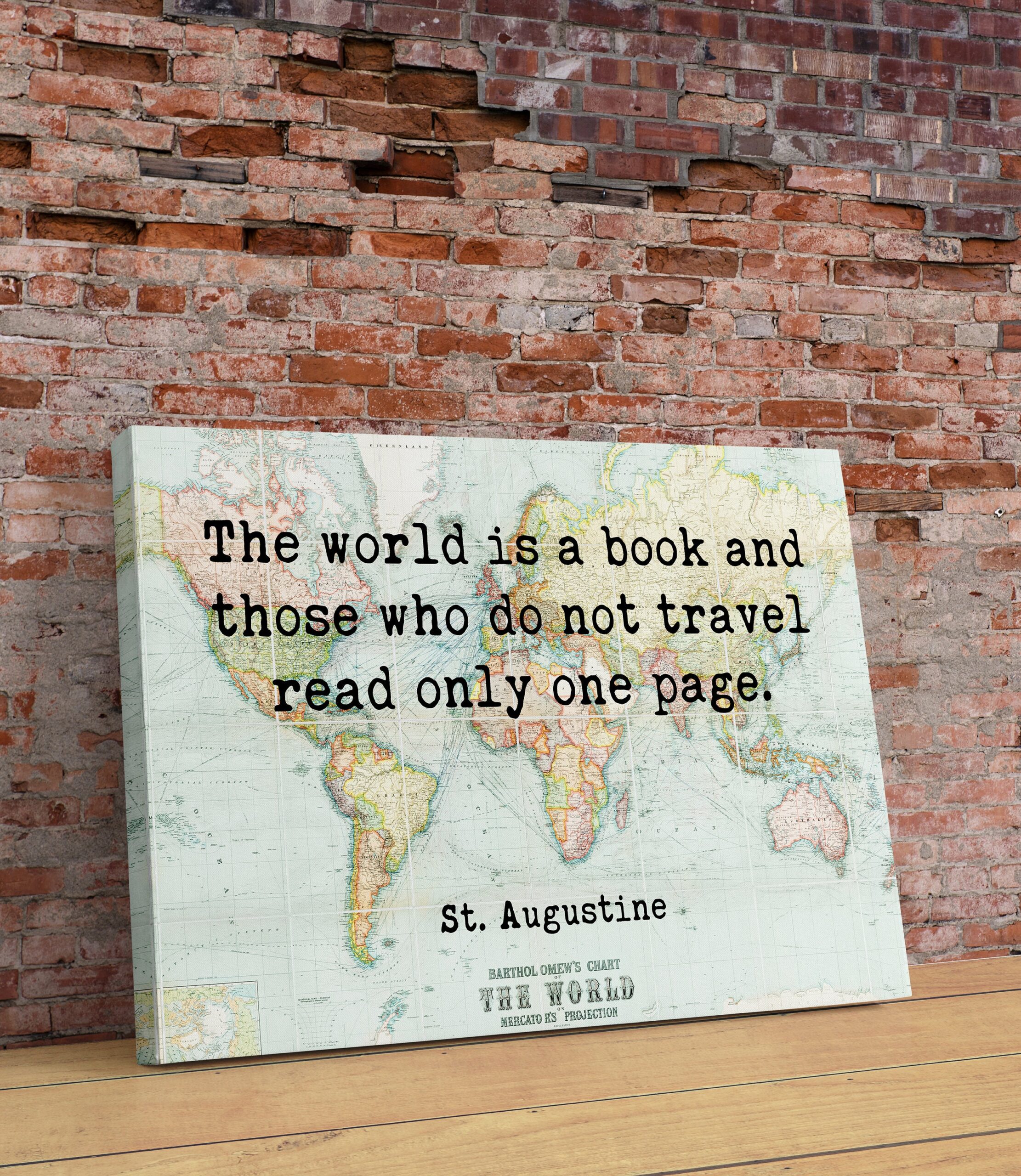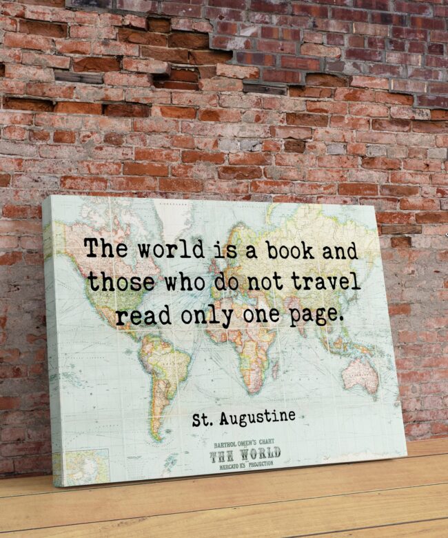 Saint Augustine Quote – The world is a book, and those who do not travel read only a page. With World Map – Minimalist Typography Art Print