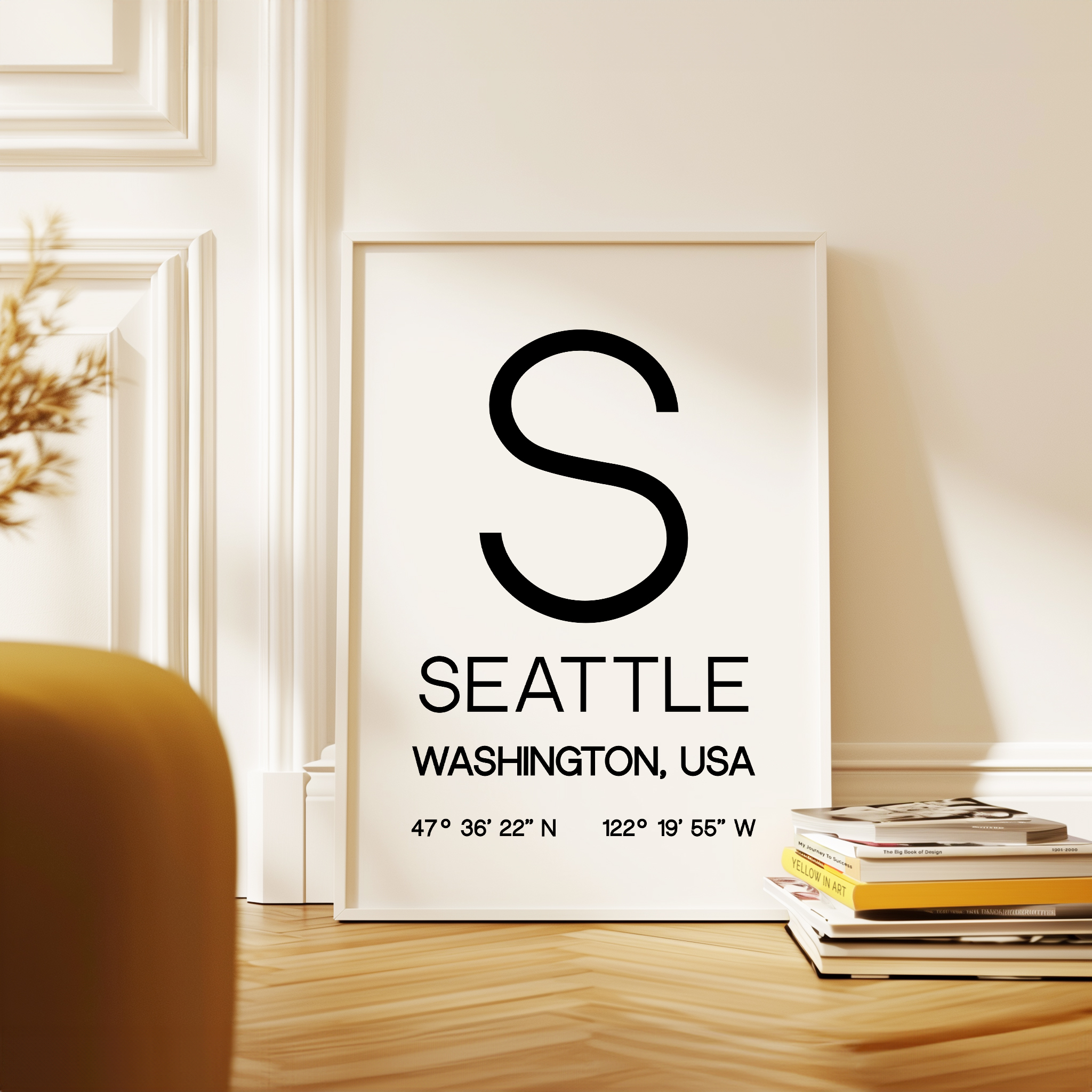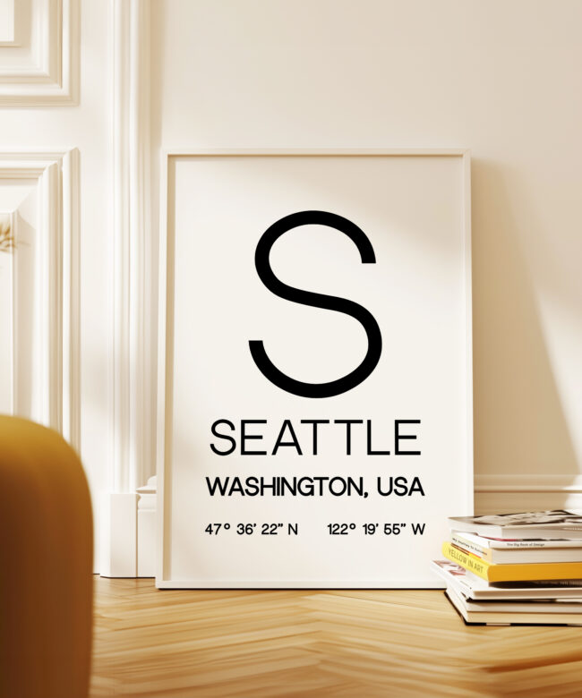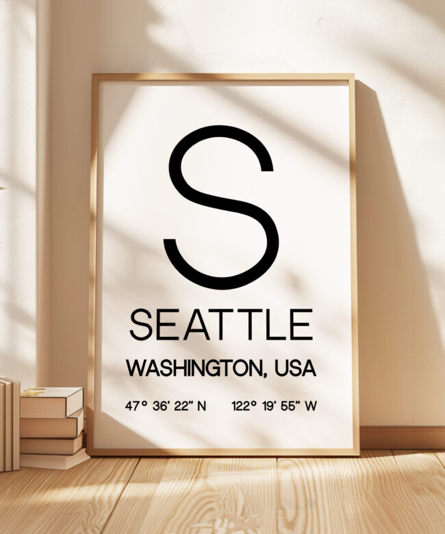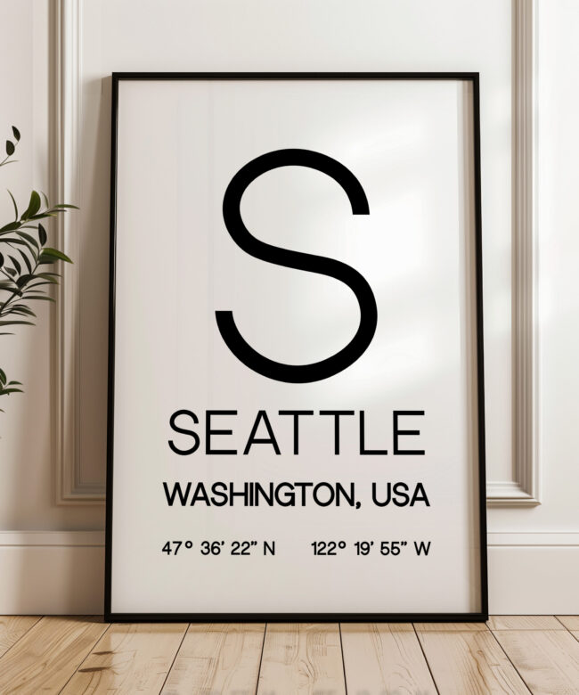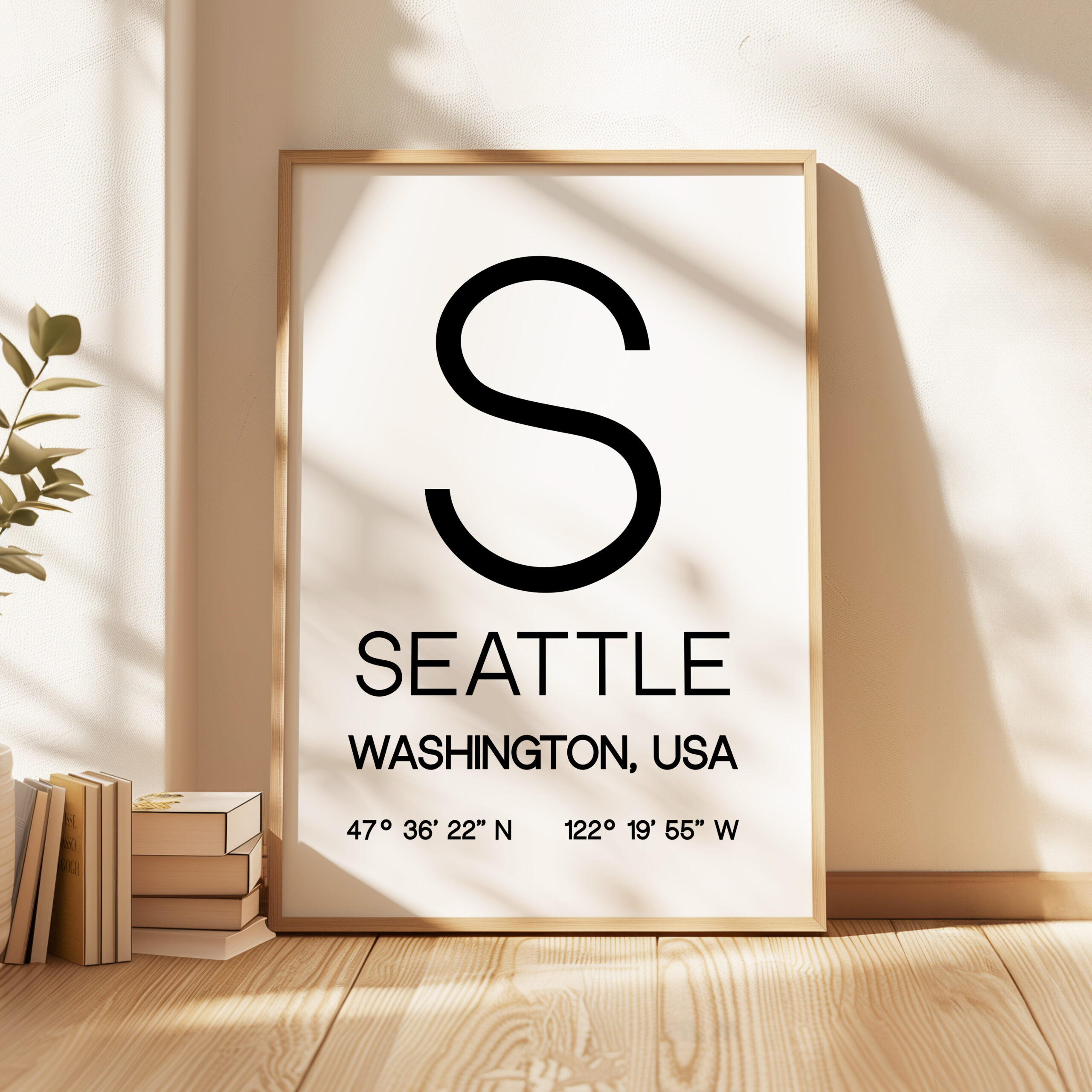 Celebrate the city of coffee, culture, and creativity with this clean and modern Seattle typography art print. Featuring bold lettering that reads “S Seattle, Washington, USA” along with GPS coordinates, this minimalist print is perfect for locals, travelers, or Seattle lovers. It makes a thoughtful gift for housewarmings, long-distance friends, or anyone who calls the Emerald City home.