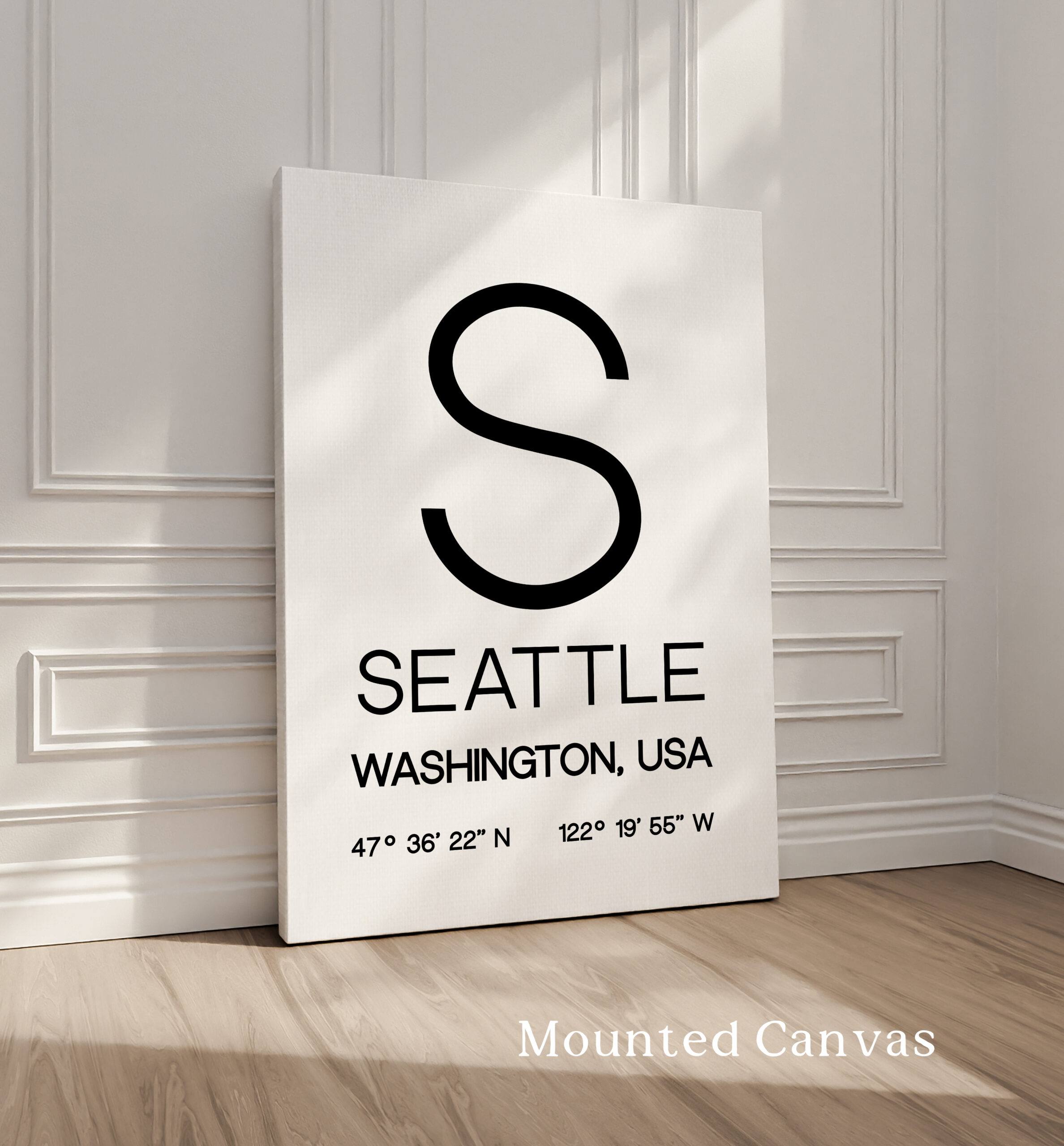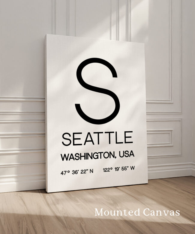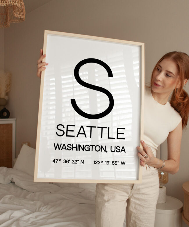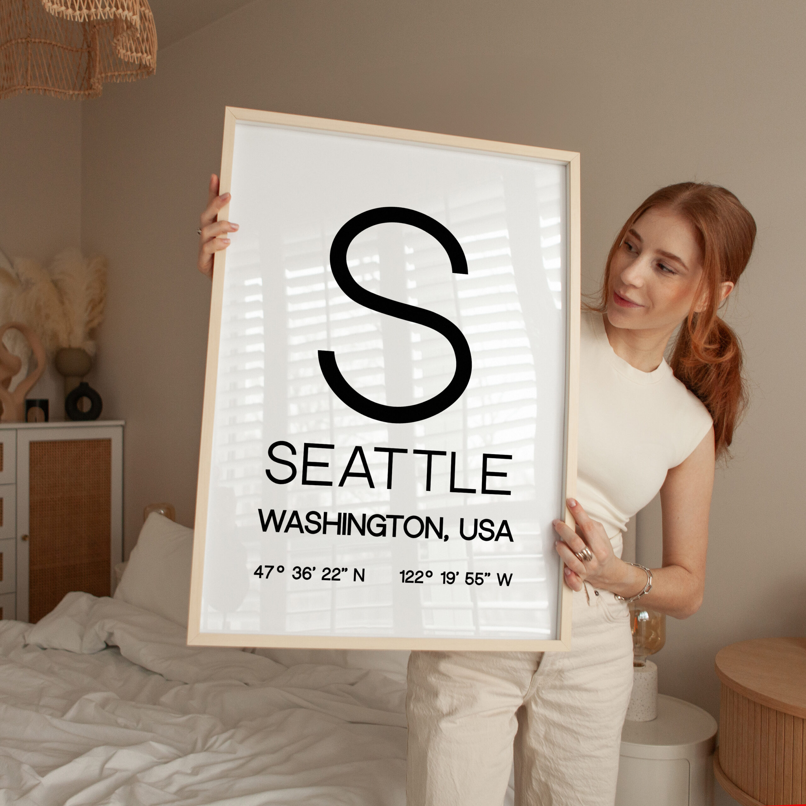 Celebrate the city of coffee, culture, and creativity with this clean and modern Seattle typography art print. Featuring bold lettering that reads “S Seattle, Washington, USA” along with GPS coordinates, this minimalist print is perfect for locals, travelers, or Seattle lovers. It makes a thoughtful gift for housewarmings, long-distance friends, or anyone who calls the Emerald City home.