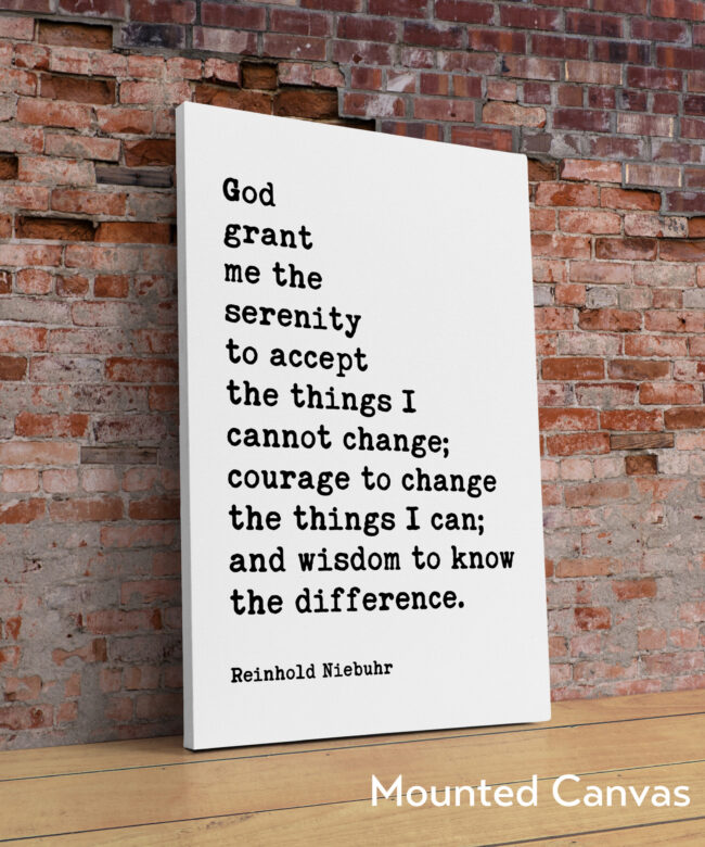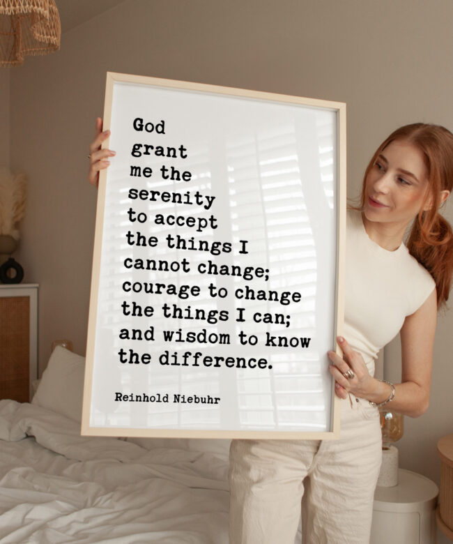 Transform your space with our Typography Art Print featuring the timeless quote by Reinhold Neibuhr: “God grant me the serenity to accept the things I cannot change; courage to change the things I can; and wisdom to know the difference.” This piece serves as a daily reminder to embrace life’s challenges with grace and strength.