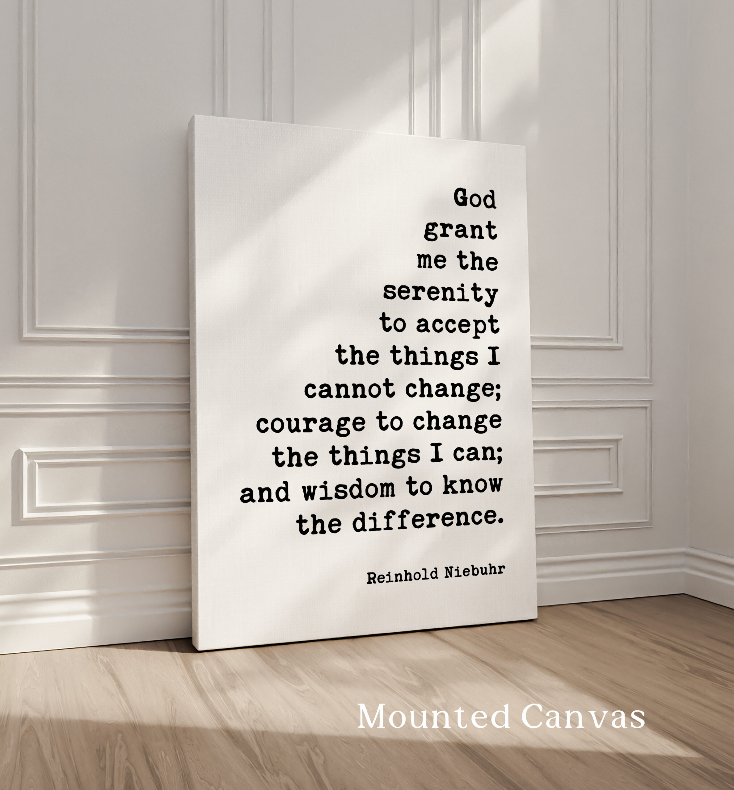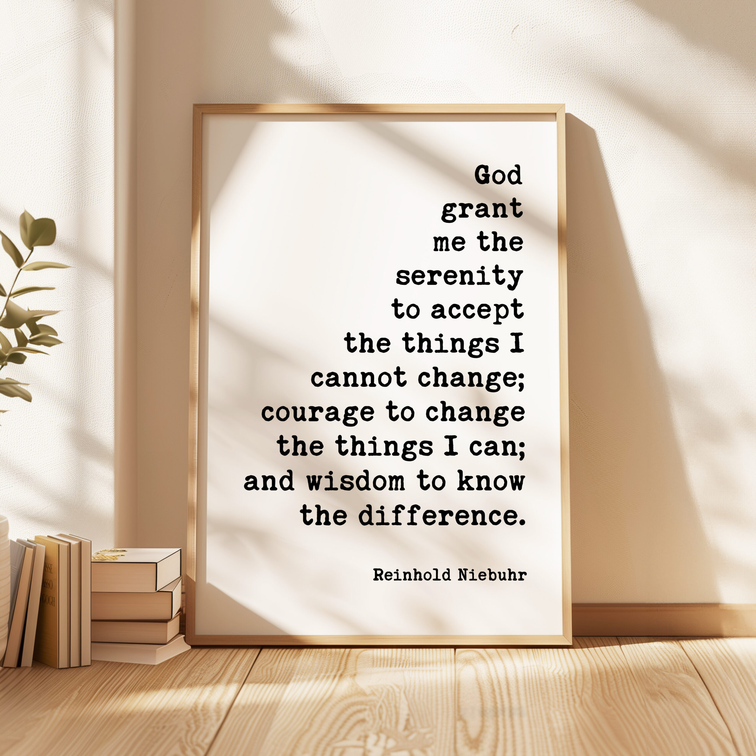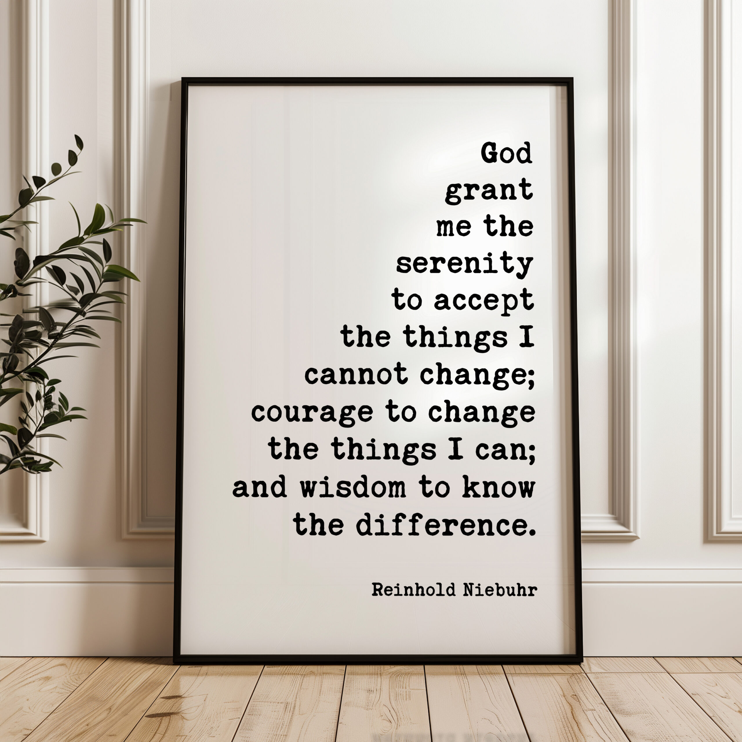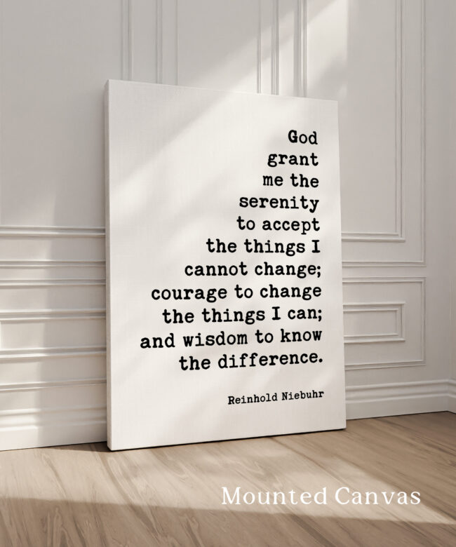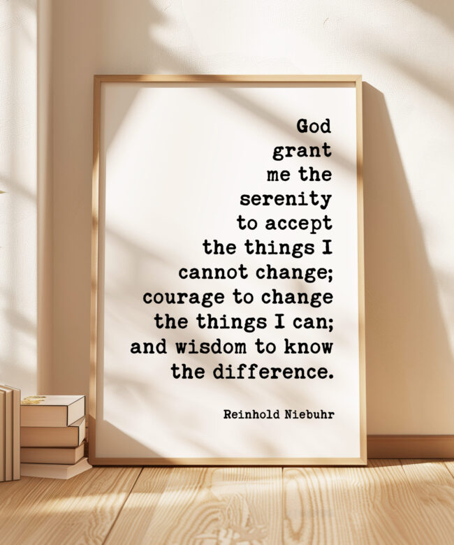 Transform your space with our Typography Art Print featuring the timeless quote by Reinhold Niebuhr: “God grant me the serenity to accept the things I cannot change; courage to change the things I can; and wisdom to know the difference.” This piece serves as a daily reminder to embrace life’s challenges with grace and strength.