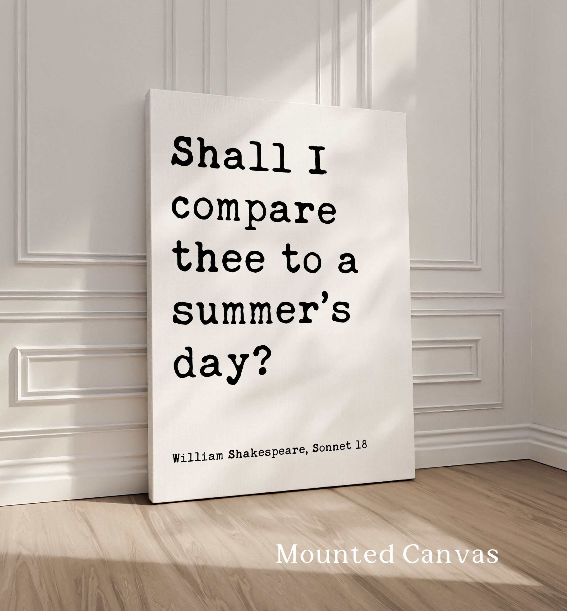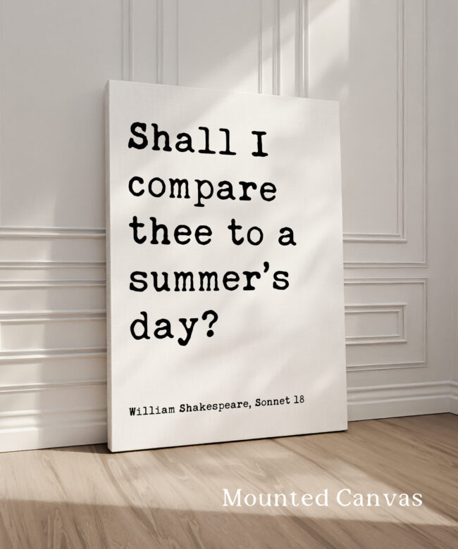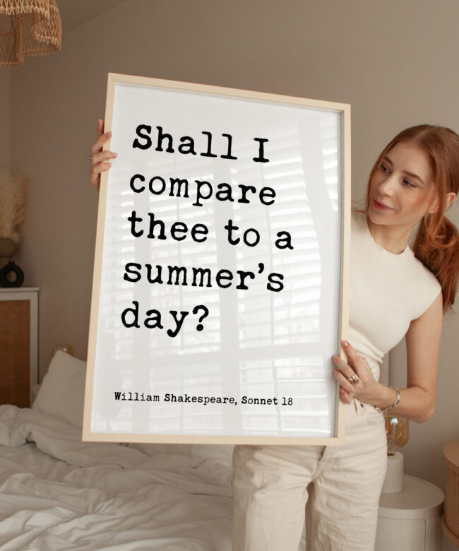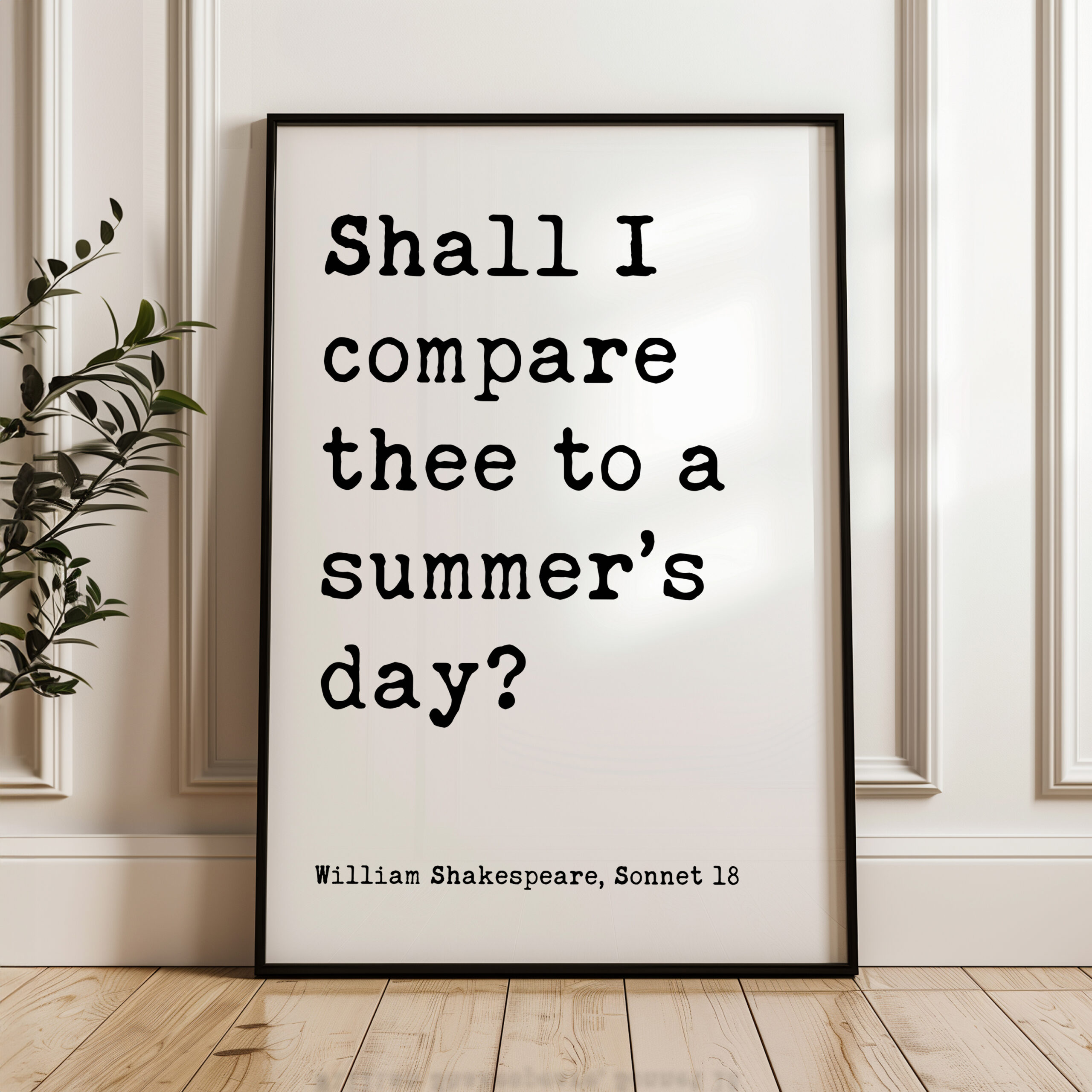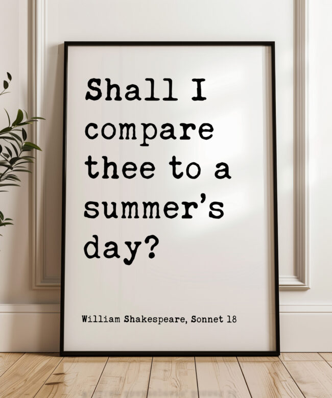 Capture the essence of timeless romance with this elegant Typography Art Print featuring Shakespeare’s iconic line: “Shall I compare thee to a summer’s day?” from Sonnet 18. The minimalist design highlights the beauty of the Bard’s words, making it a sophisticated addition to any space—whether a cozy reading nook, sunlit bedroom, or literary-inspired office. A perfect gift for weddings, anniversaries, or anyone who adores classic poetry, this print transforms fleeting moments into everlasting art.