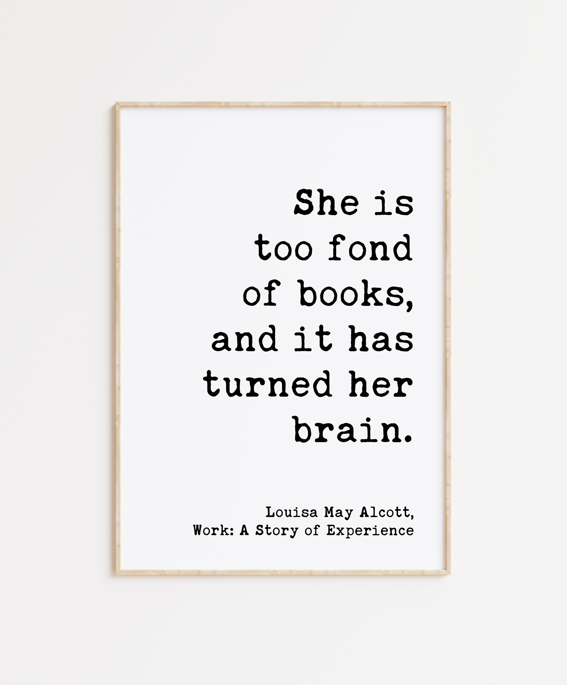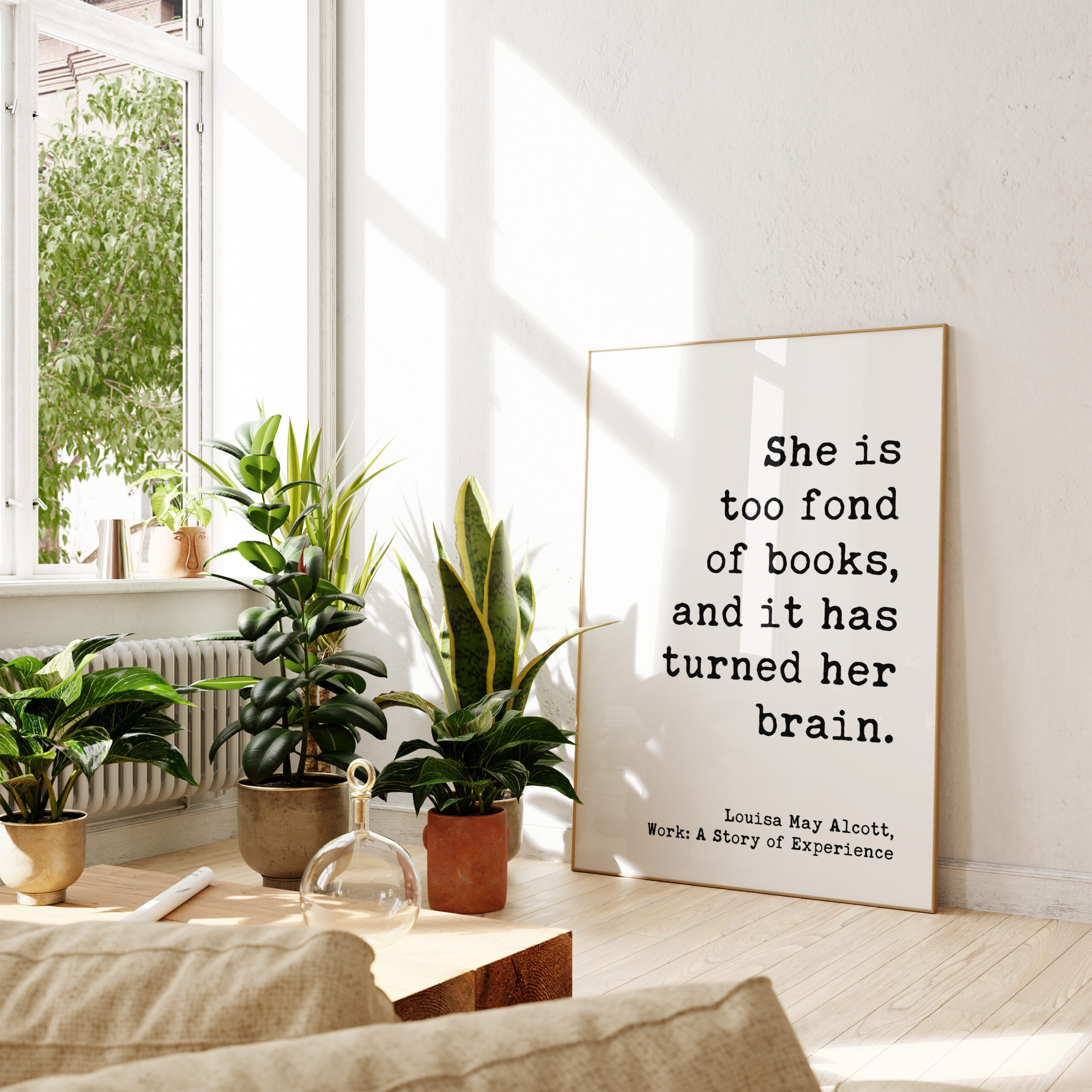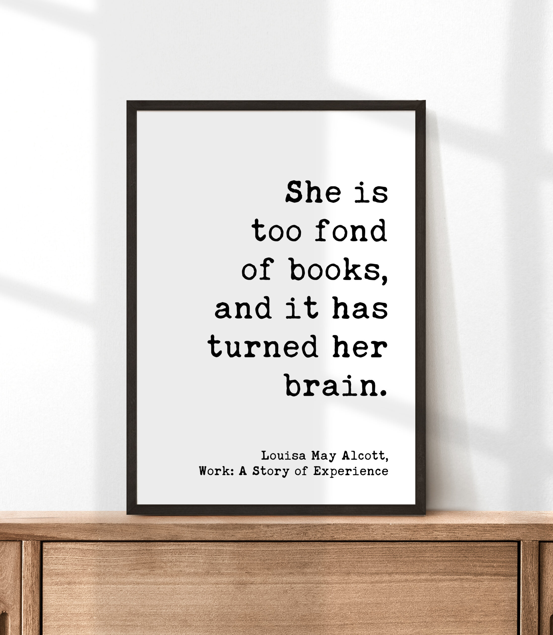 Celebrate the love of literature with our Typography Art Print featuring the whimsical Louisa May Alcott quote: “She is too fond of books, and it has turned her brain.”