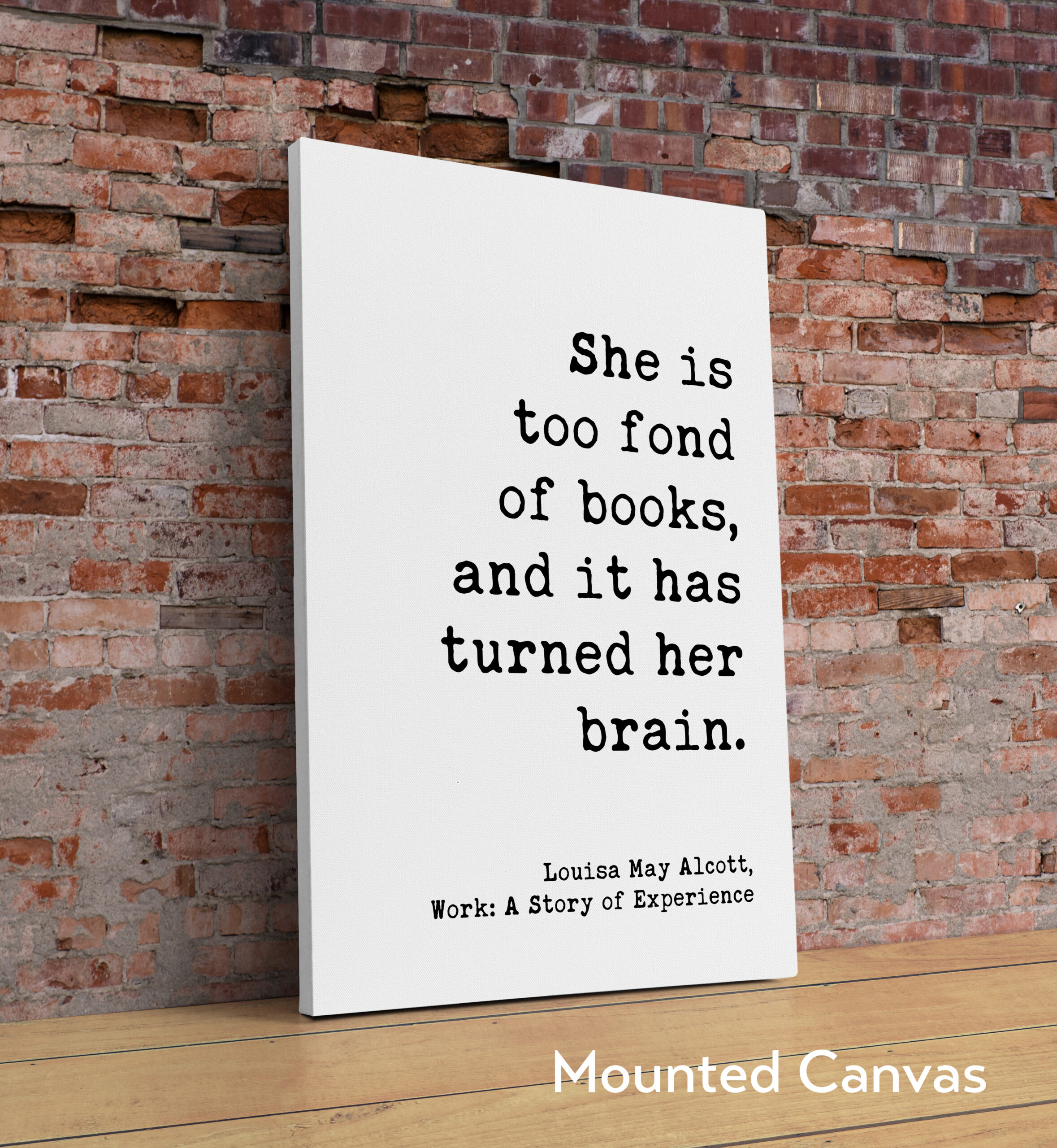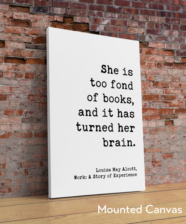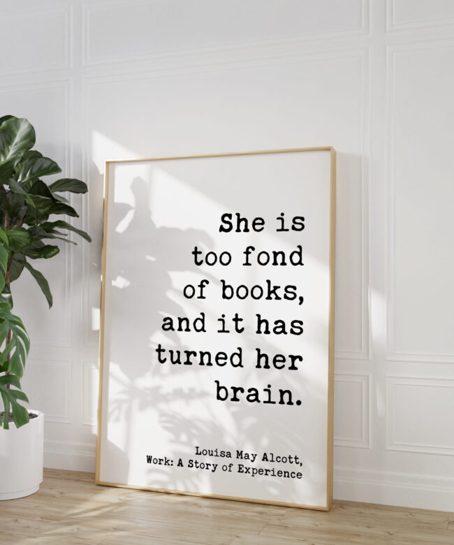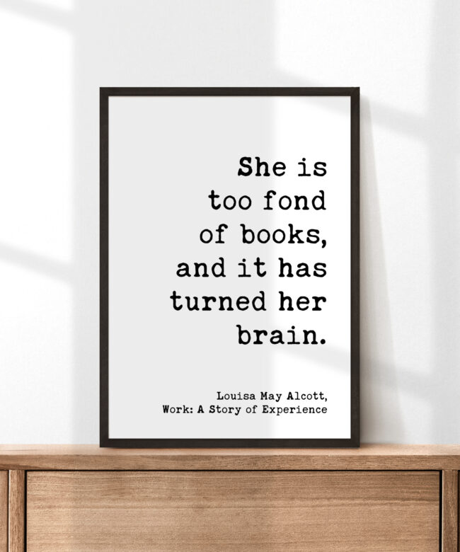 Celebrate the love of literature with our Typography Art Print featuring the whimsical Louisa May Alcott quote: “She is too fond of books, and it has turned her brain.”