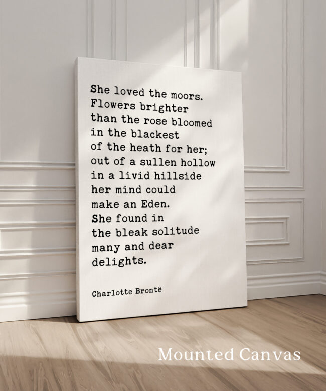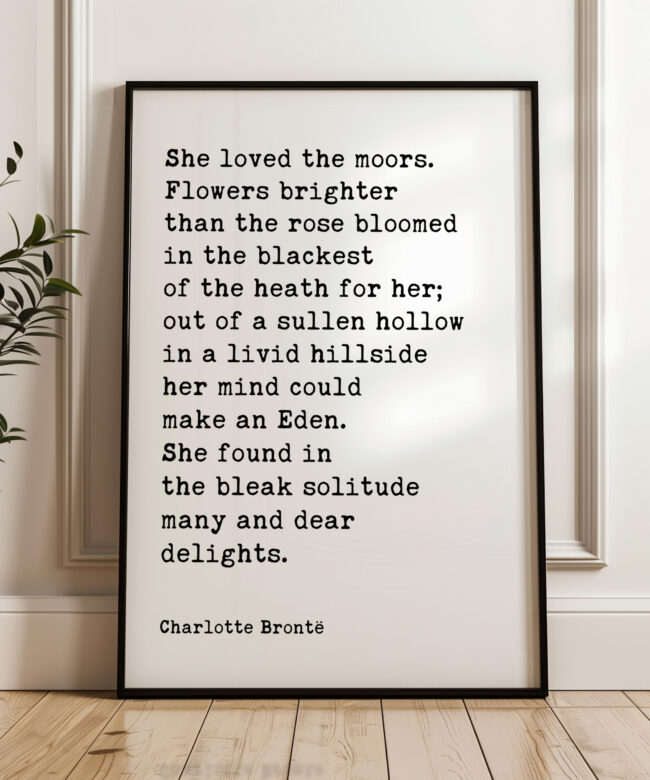 Celebrate quiet strength and introspective beauty with this Charlotte Brontë Typography Art Print. Featuring the quote, “She loved the moors. Flowers brighter than the rose bloomed in the blackest of the heath for her…”, this literary artwork captures the romantic spirit and resilience of a woman who finds delight in solitude. A perfect gift for book lovers, nature enthusiasts, or anyone who cherishes poetic solitude and Brontë’s timeless voice.