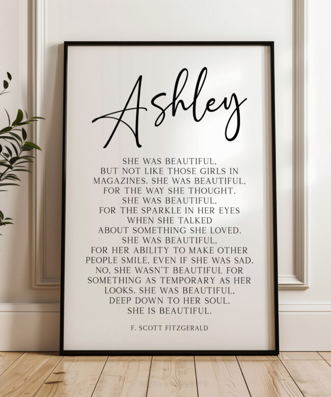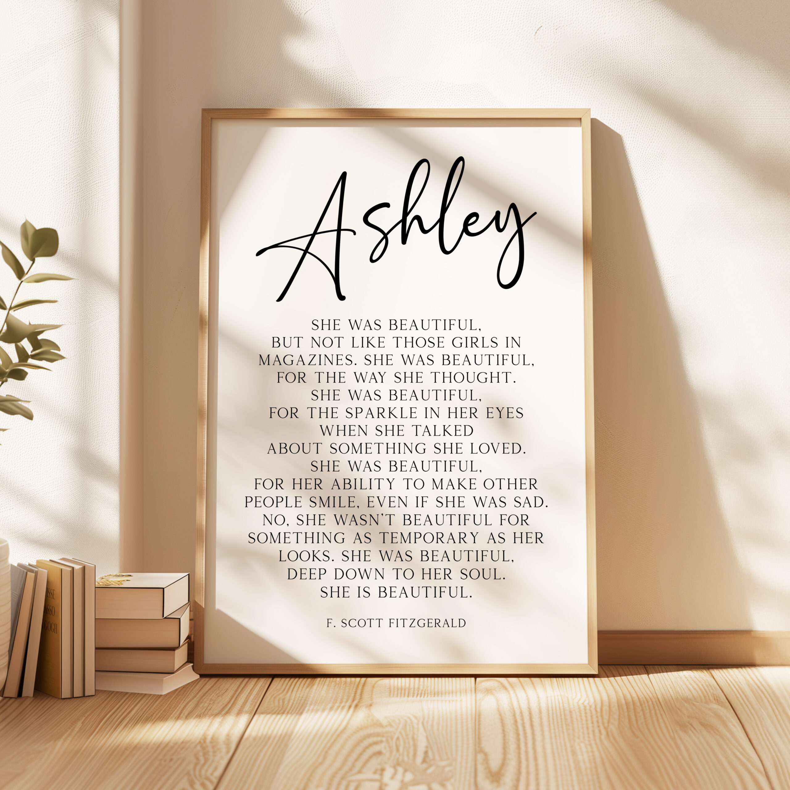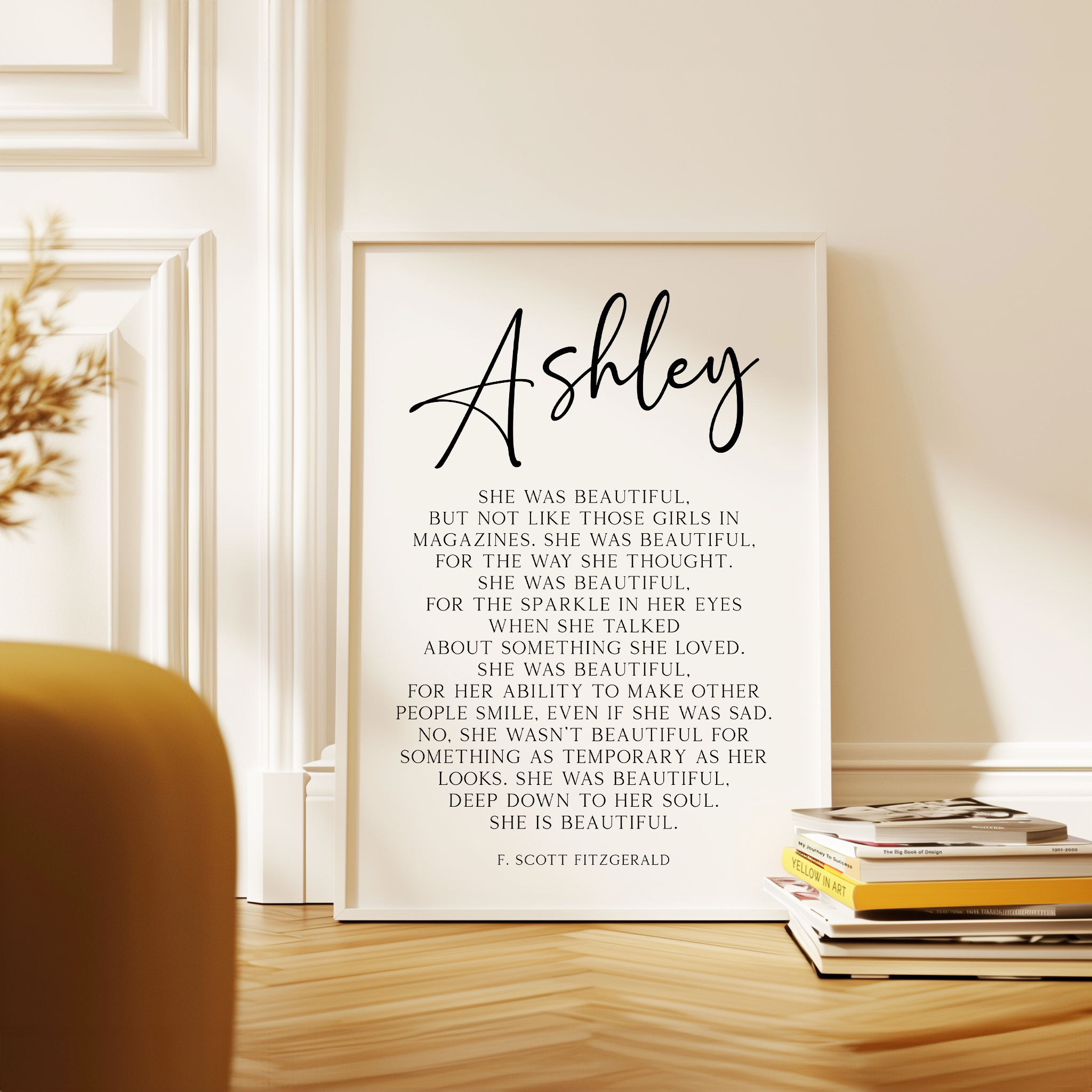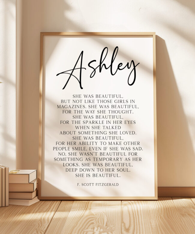 Celebrate a woman’s true essence with this timeless personalized art print. Featuring the poignant F. Scott Fitzgerald quote, “She was beautiful, but not like those girls in magazines…”, this piece honors beauty that radiates from the soul. With the option to customize the name at the top — like “Ashley” — it becomes a deeply personal and meaningful gift. Perfect for birthdays, graduations, or as daily inspiration for someone who lights up your life.