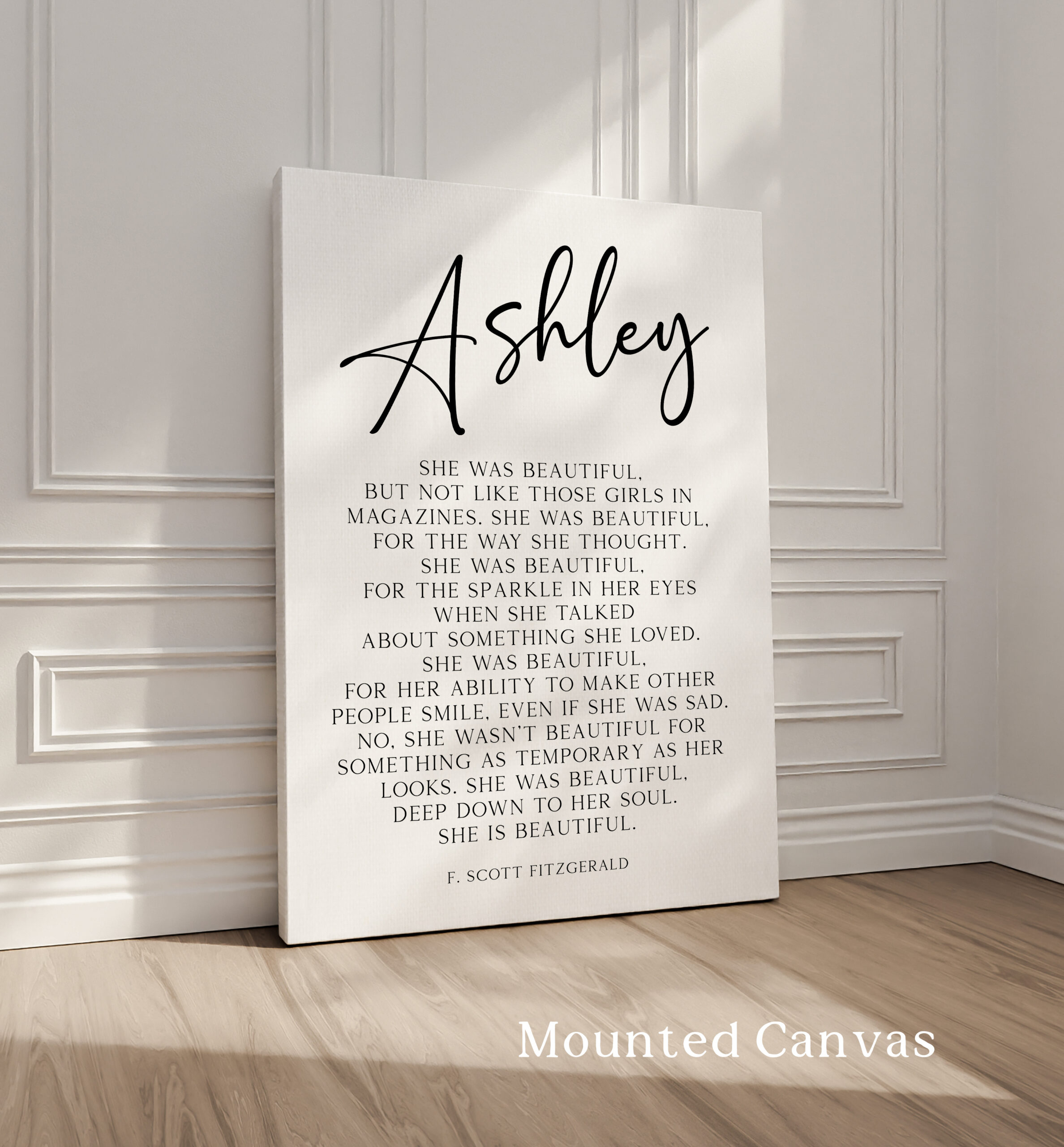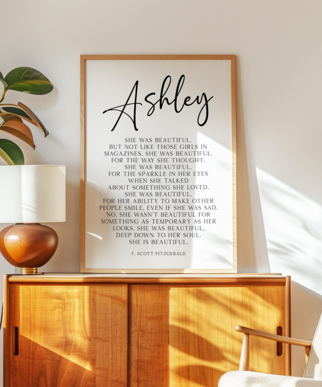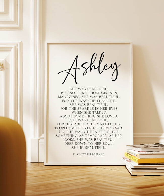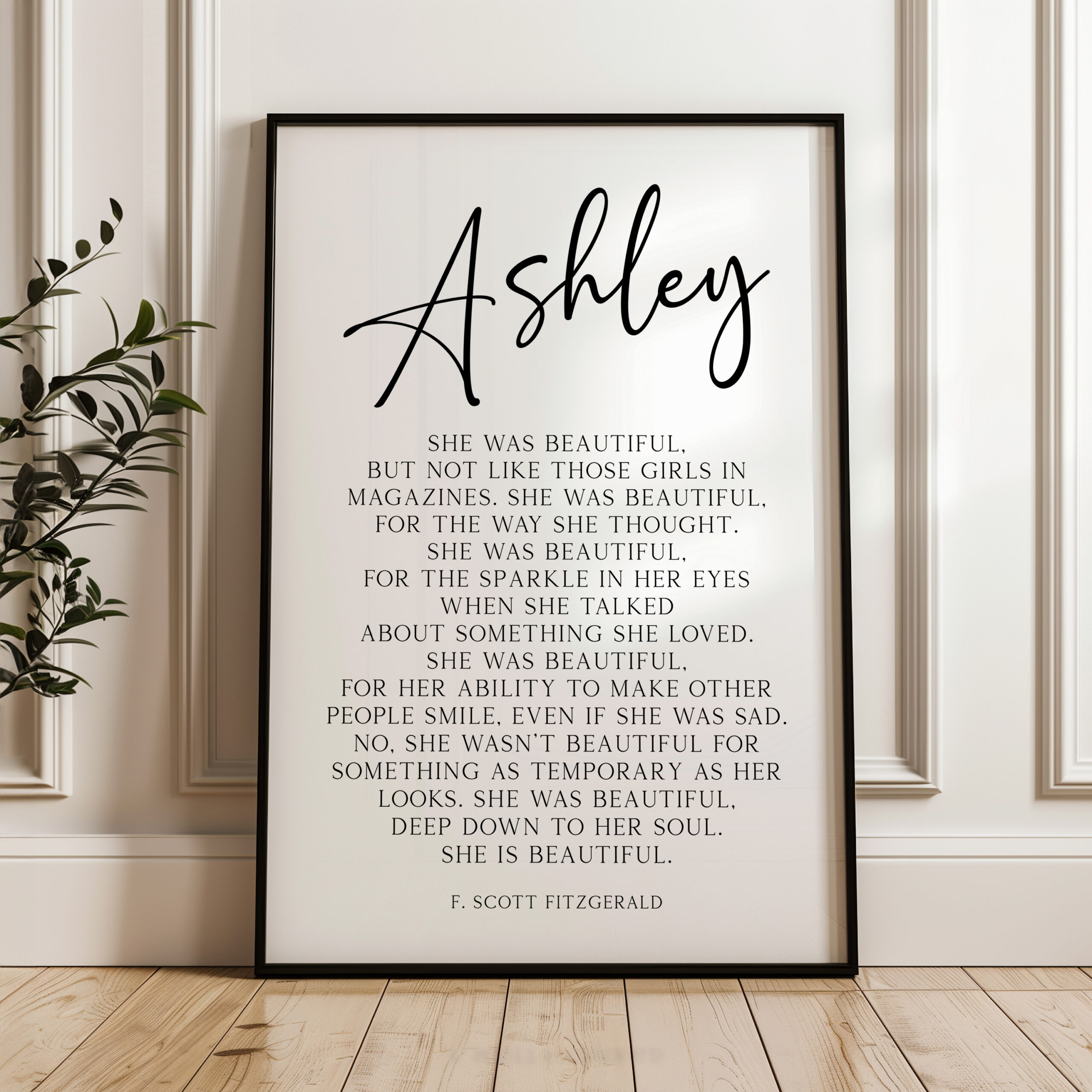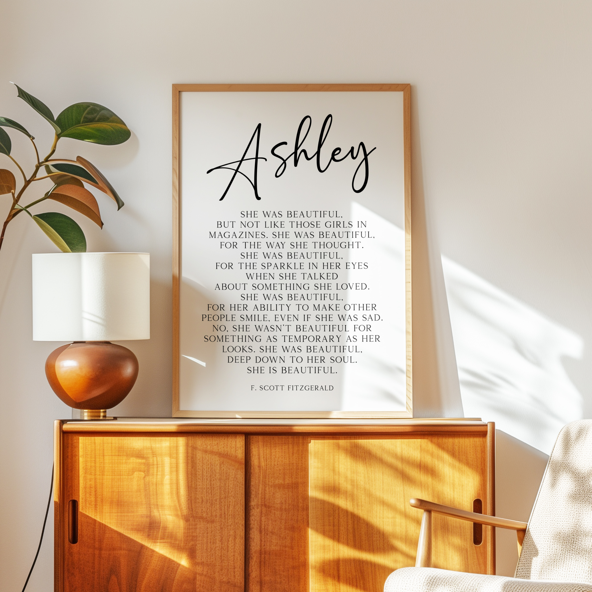 Celebrate a woman’s true essence with this timeless personalized art print. Featuring the poignant F. Scott Fitzgerald quote, “She was beautiful, but not like those girls in magazines…”, this piece honors beauty that radiates from the soul. With the option to customize the name at the top — like “Ashley” — it becomes a deeply personal and meaningful gift. Perfect for birthdays, graduations, or as daily inspiration for someone who lights up your life.