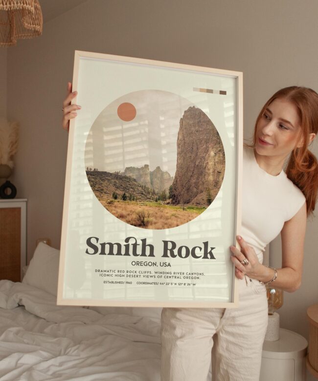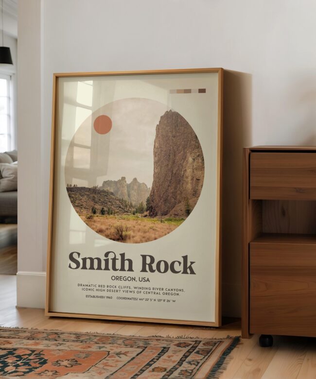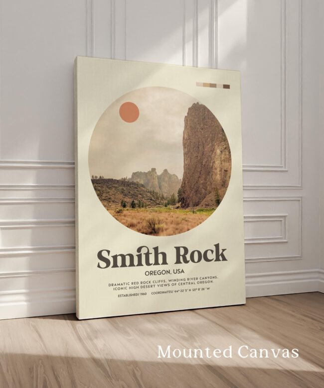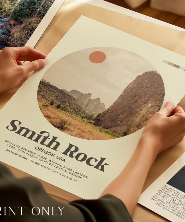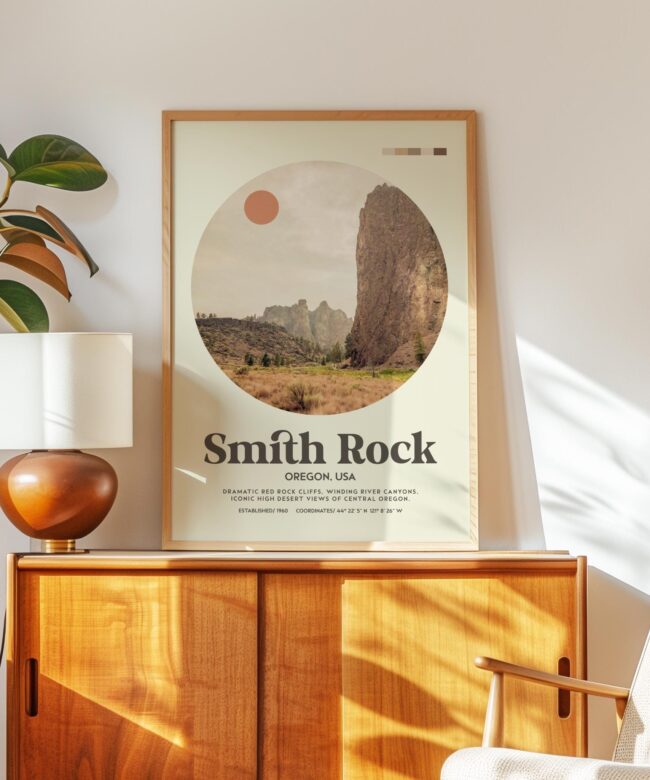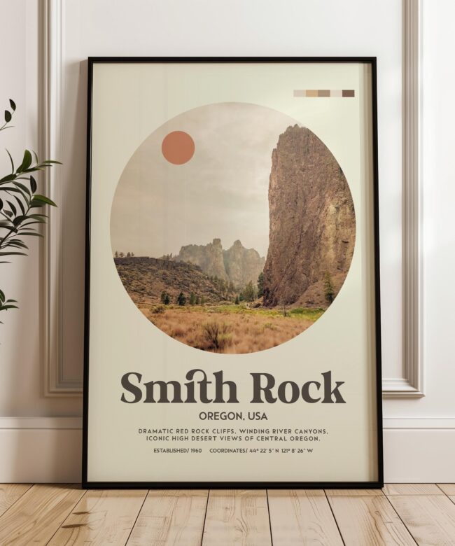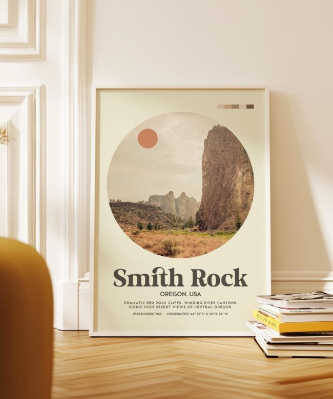 Bring the rugged beauty of Central Oregon into your home with this Smith Rock typography art print. Featuring a minimalist circular landscape design and warm, earthy tones, this piece captures the dramatic cliffs and sweeping desert views of one of Oregon’s most iconic destinations.