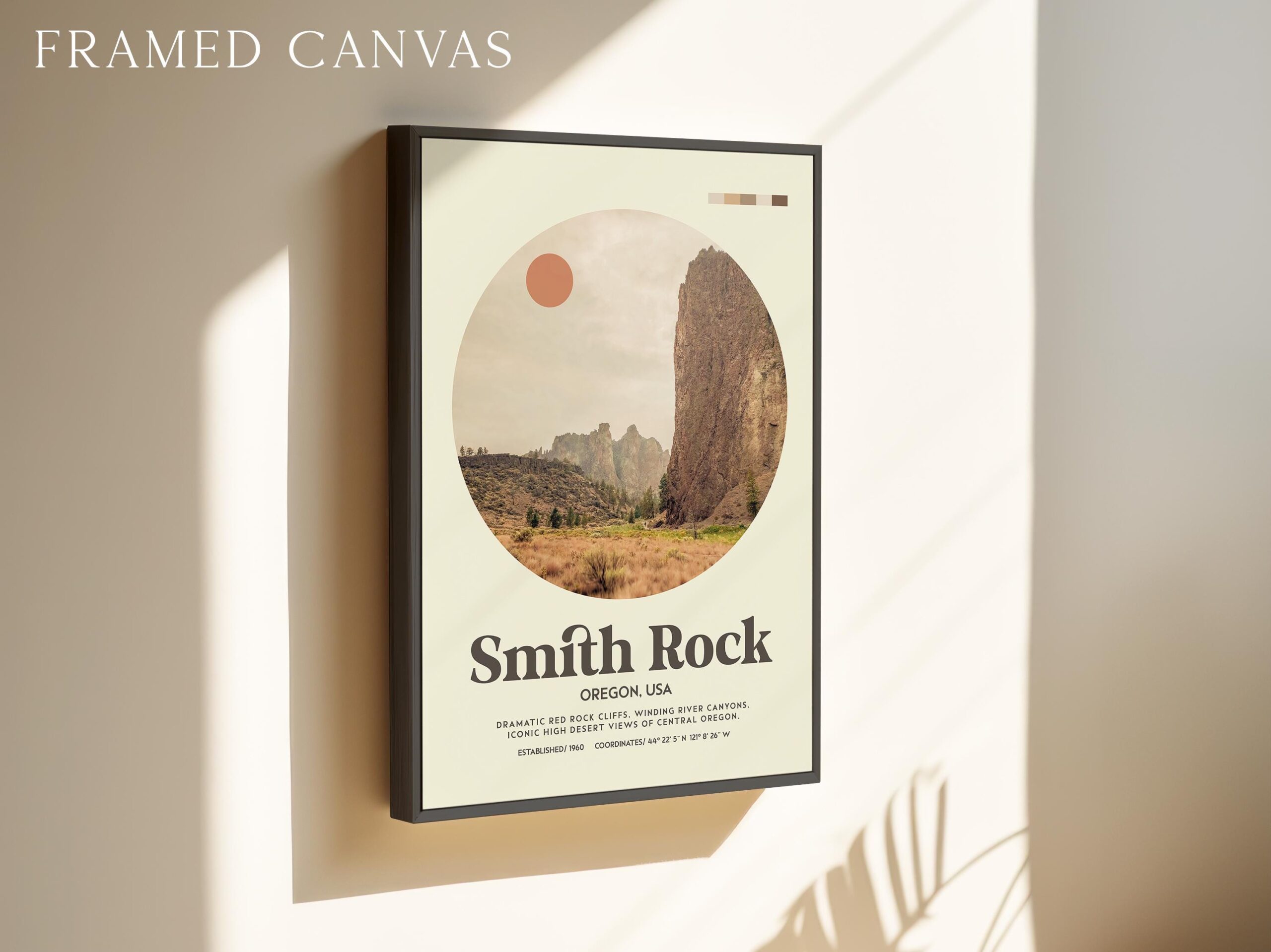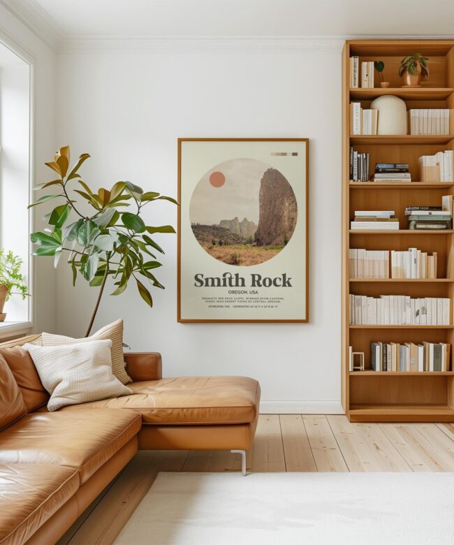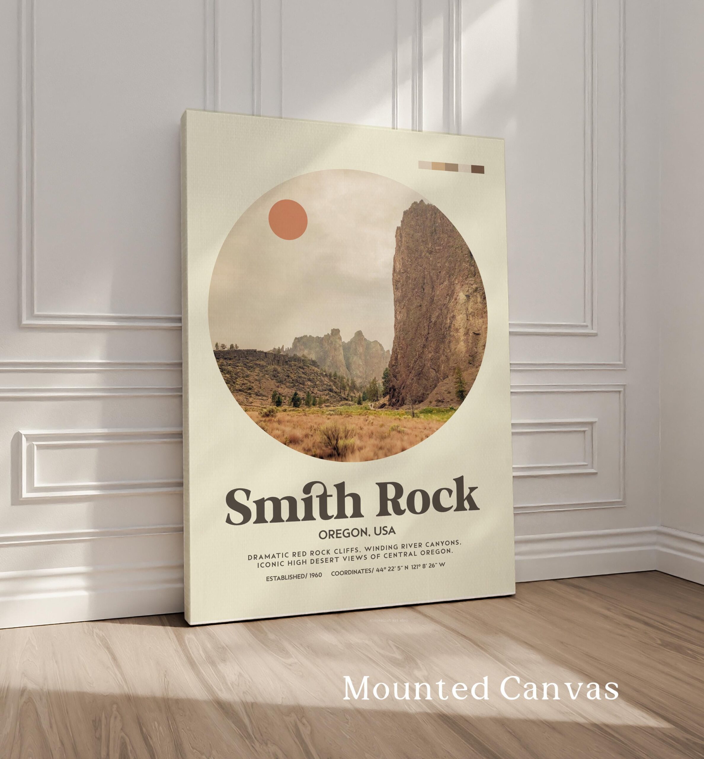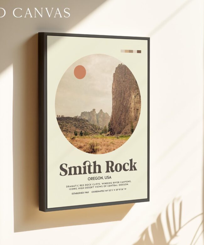 Bring the rugged beauty of Central Oregon into your home with this Smith Rock typography art print. Featuring a minimalist circular landscape design and warm, earthy tones, this piece captures the dramatic cliffs and sweeping desert views of one of Oregon’s most iconic destinations.