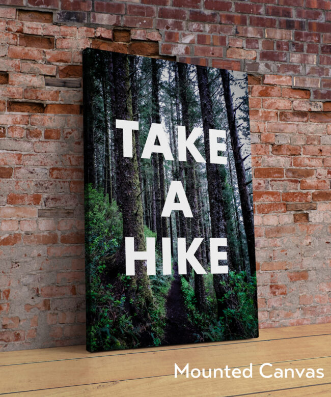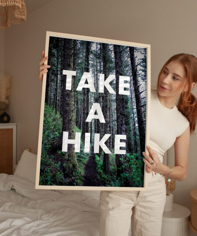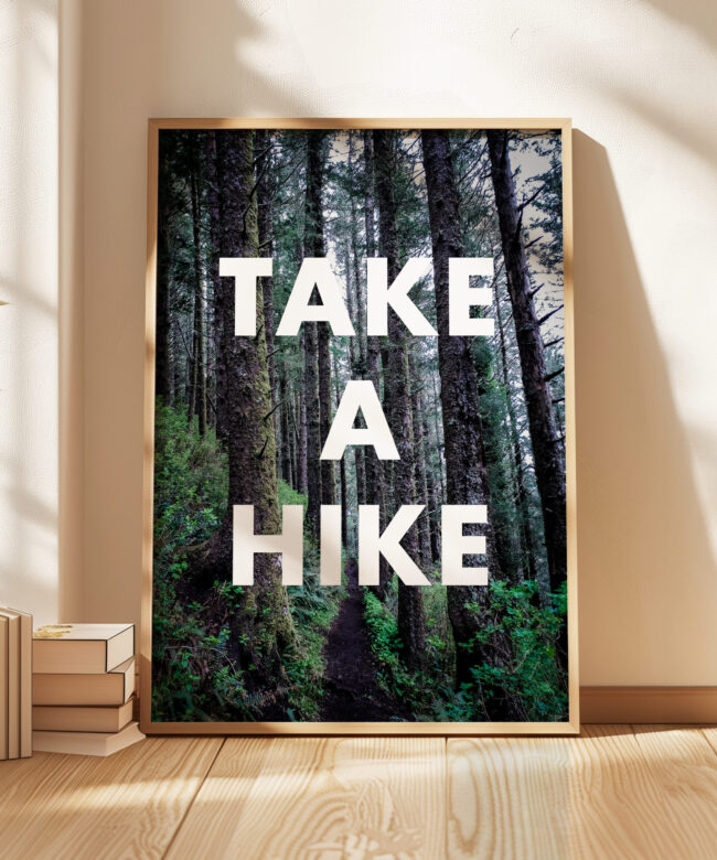 Get inspired to embrace the great outdoors with this stunning Typography Art Print featuring the phrase “Take A Hike” overlaid on a breathtaking photo of a trail along the Oregon Coast, surrounded by majestic Sitka Spruce trees.