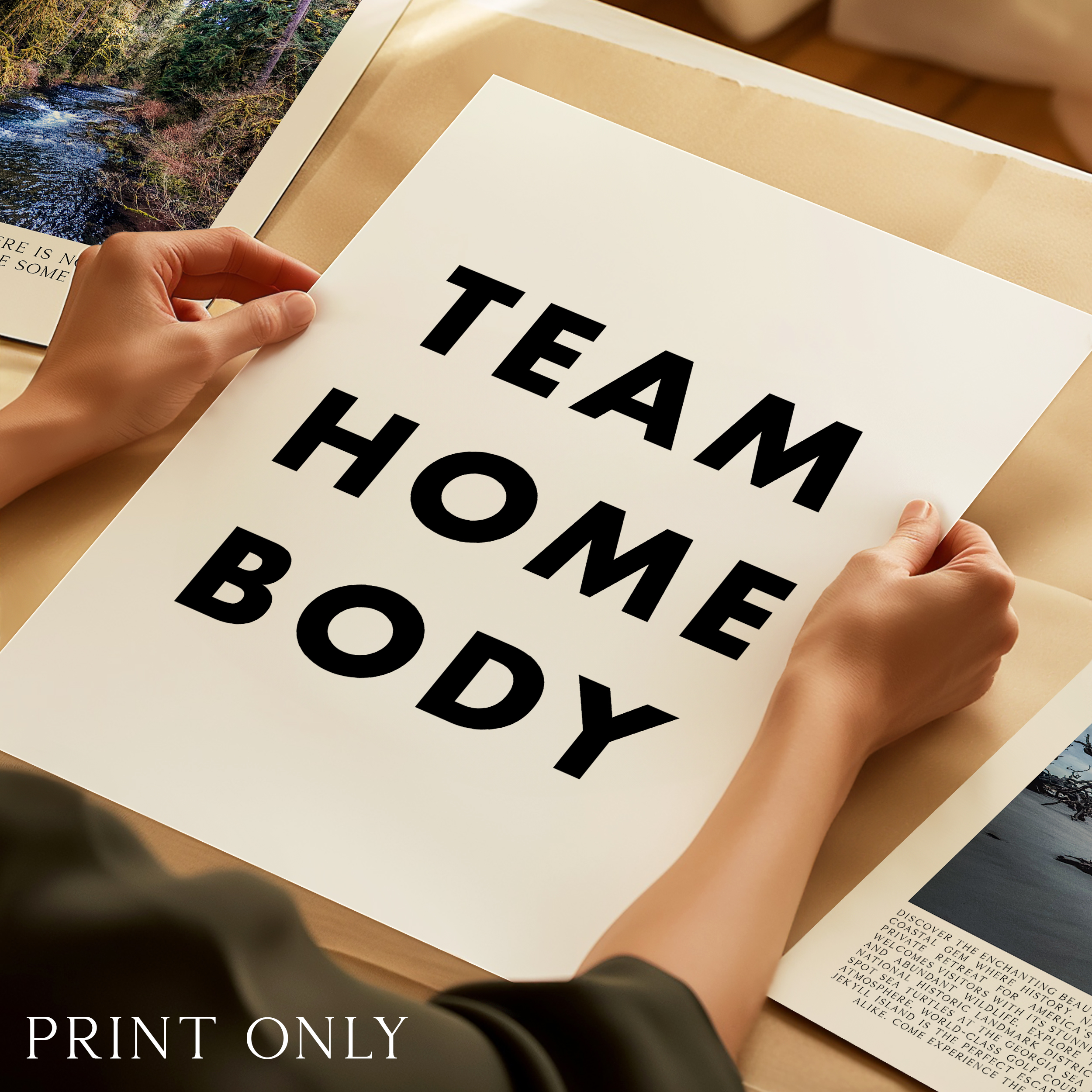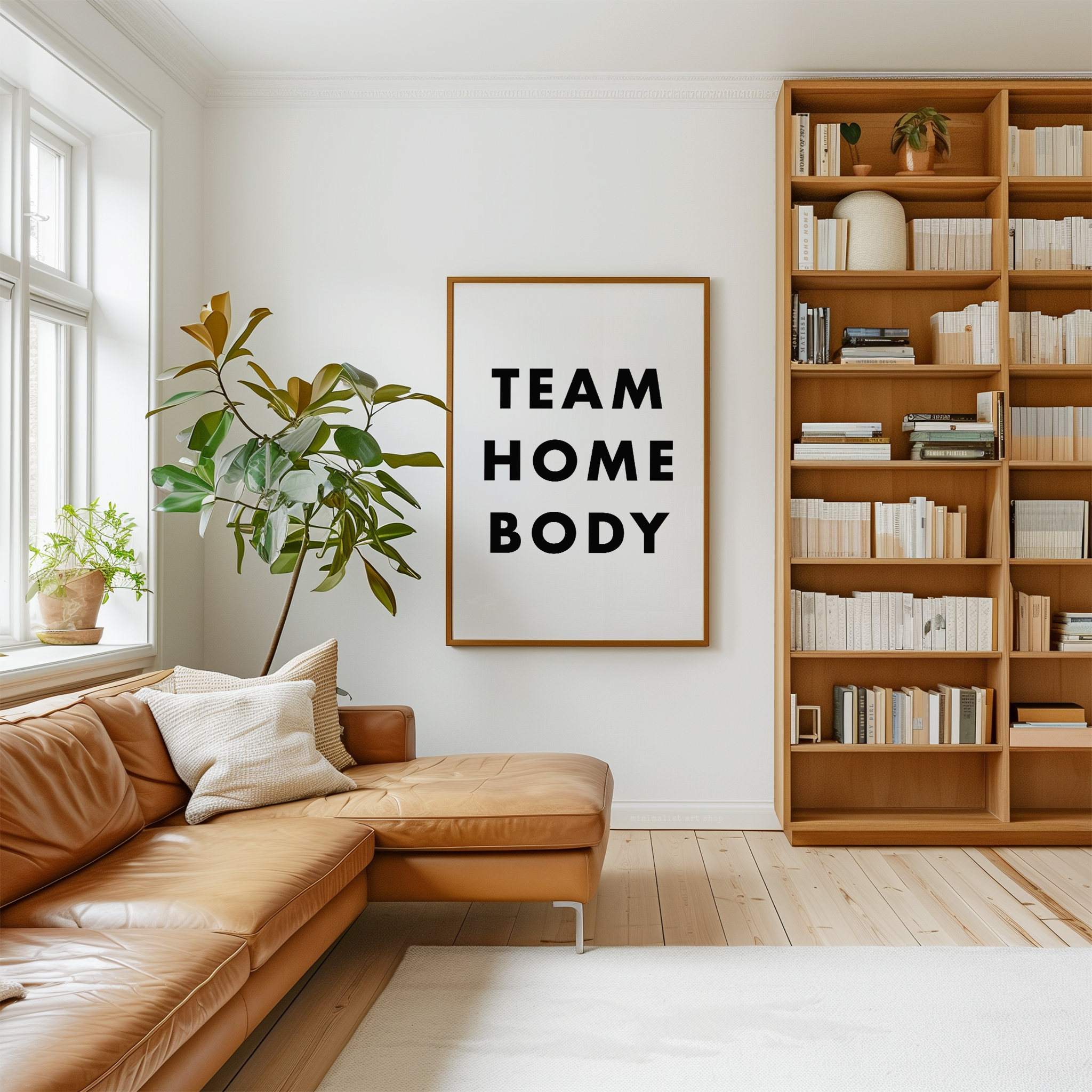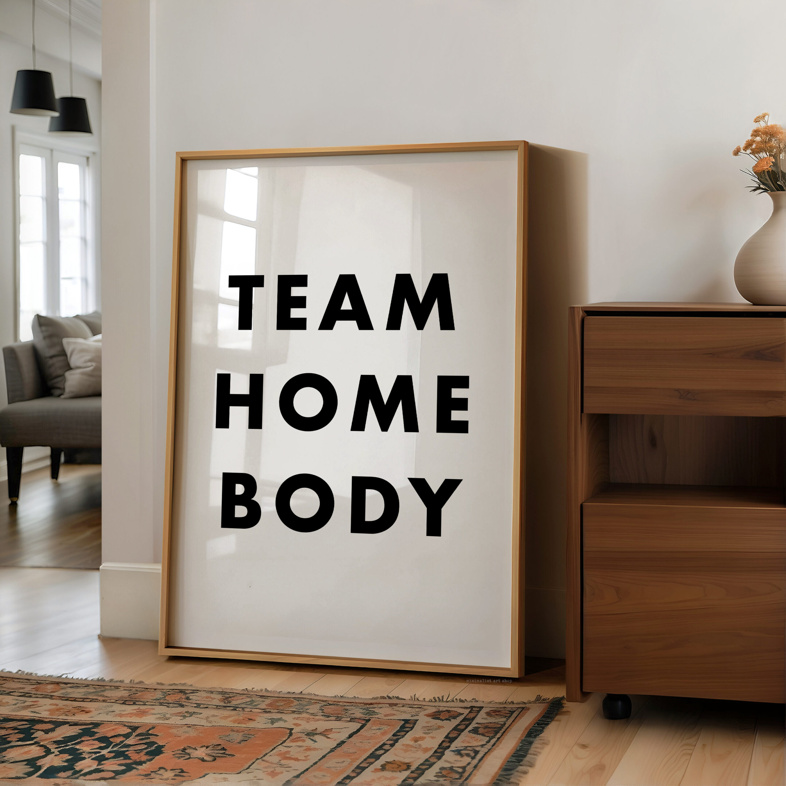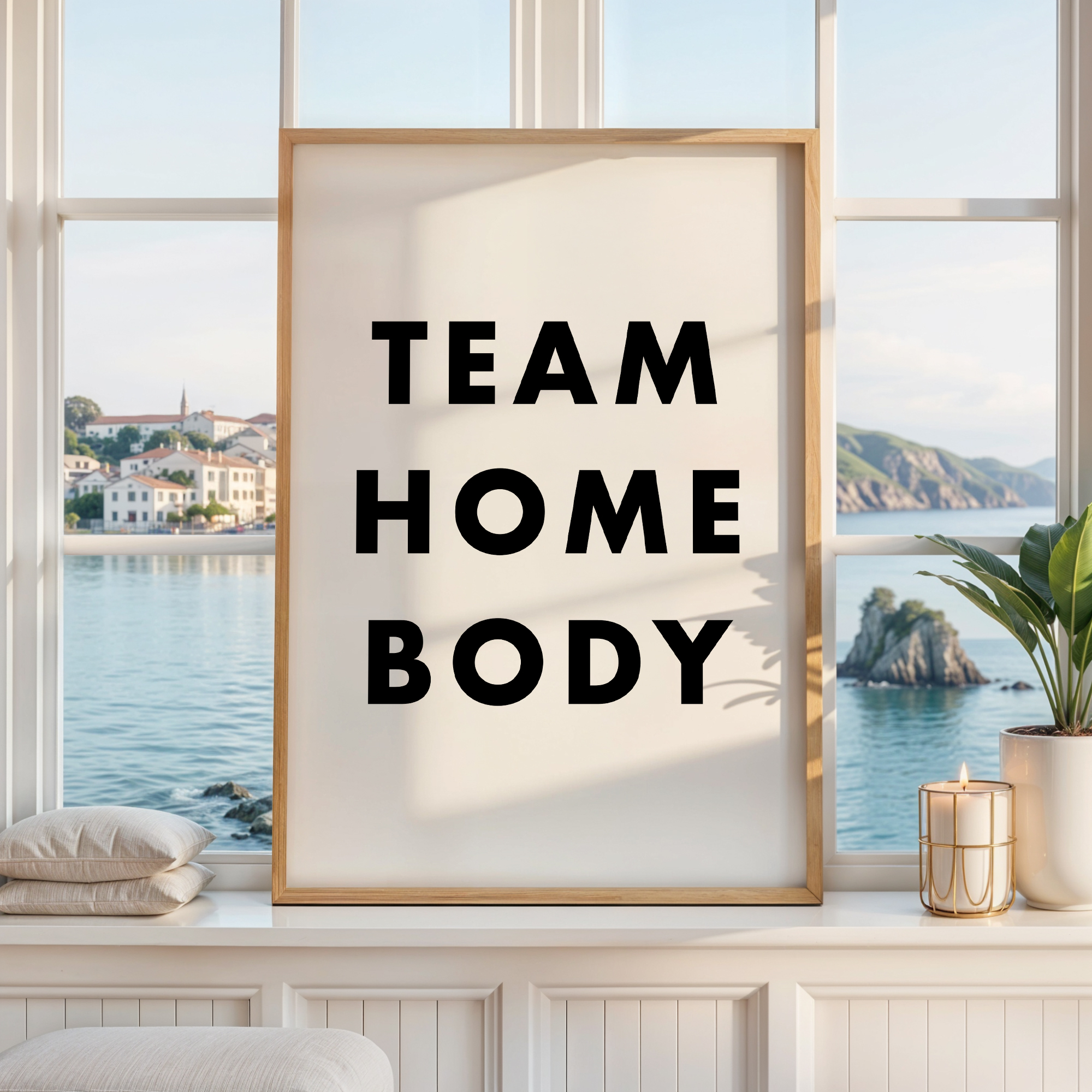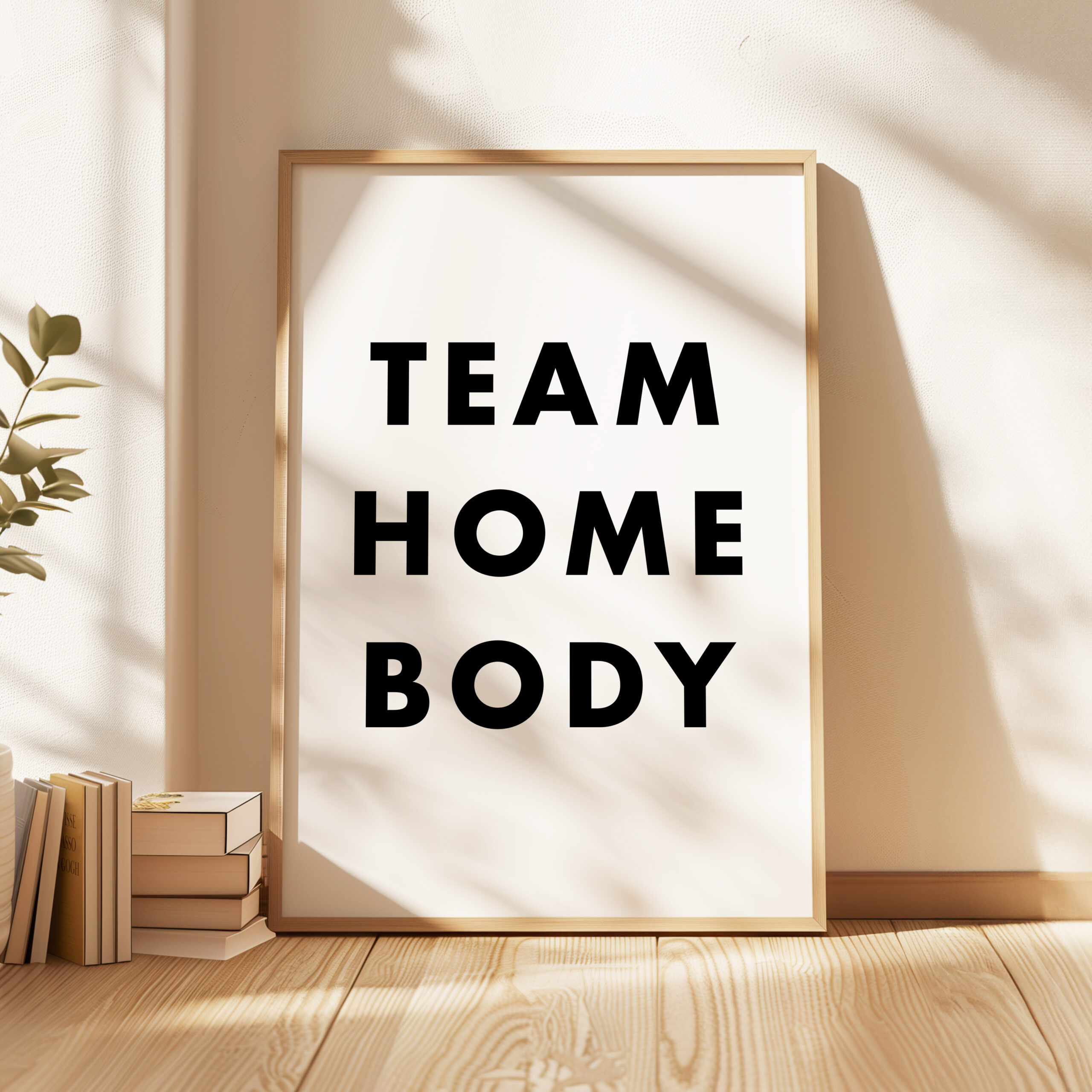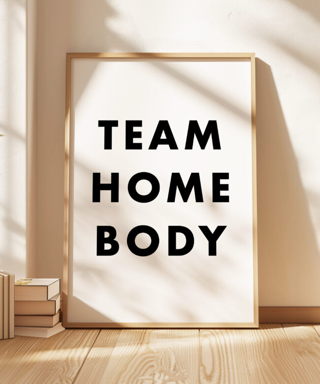 This bold typography art print celebrates the joy of staying in and loving home life. Featuring the phrase “Team Home Body” in clean, modern lettering, this piece adds personality and warmth to living rooms, bedrooms, reading nooks, and cozy corners.