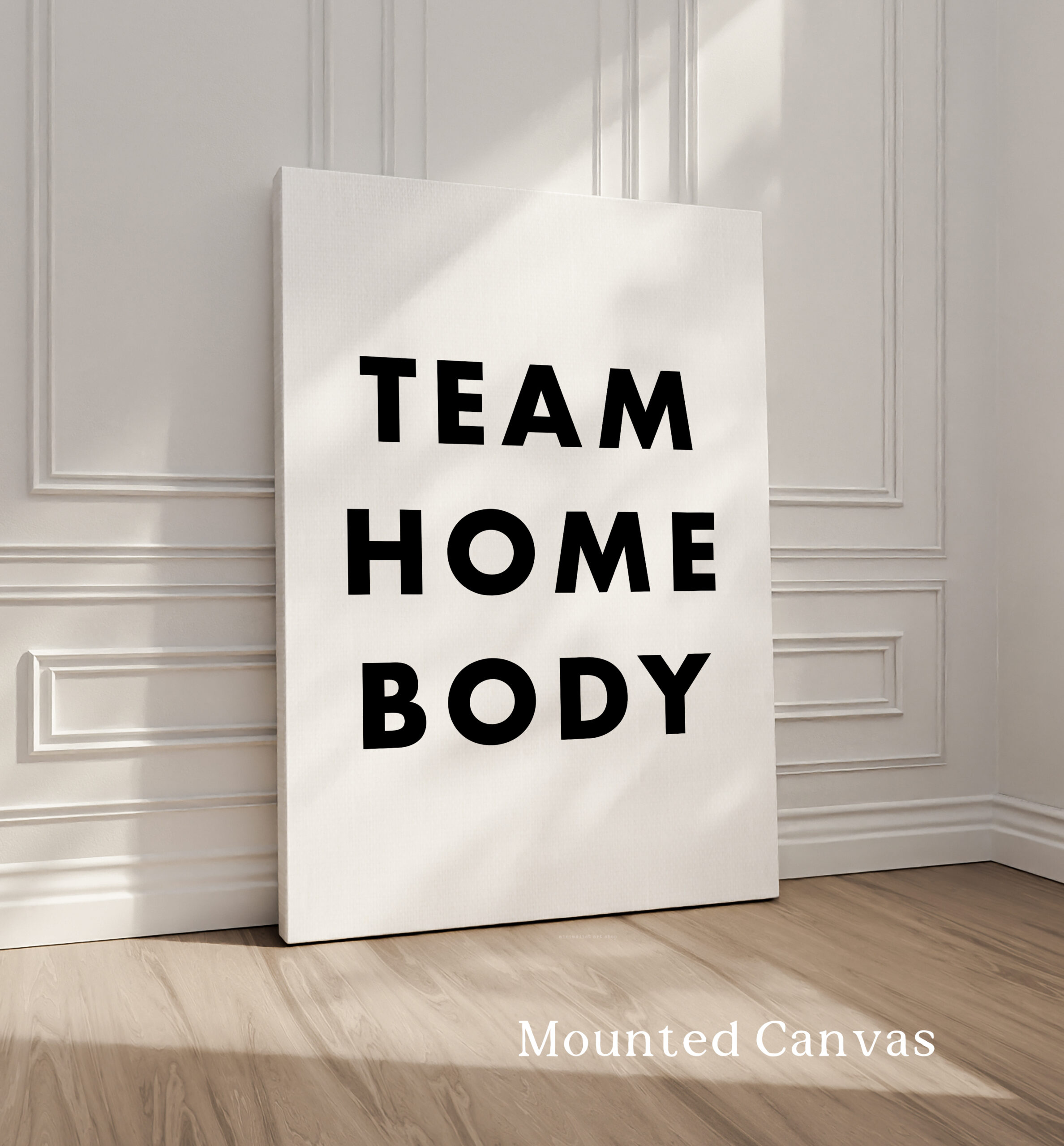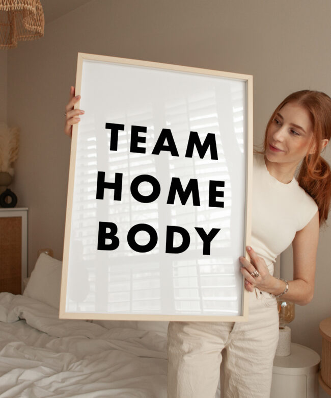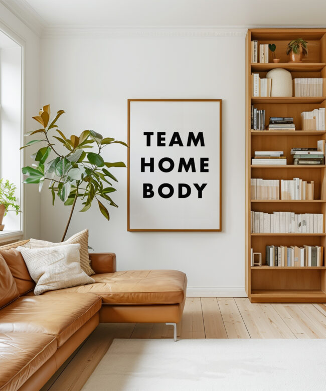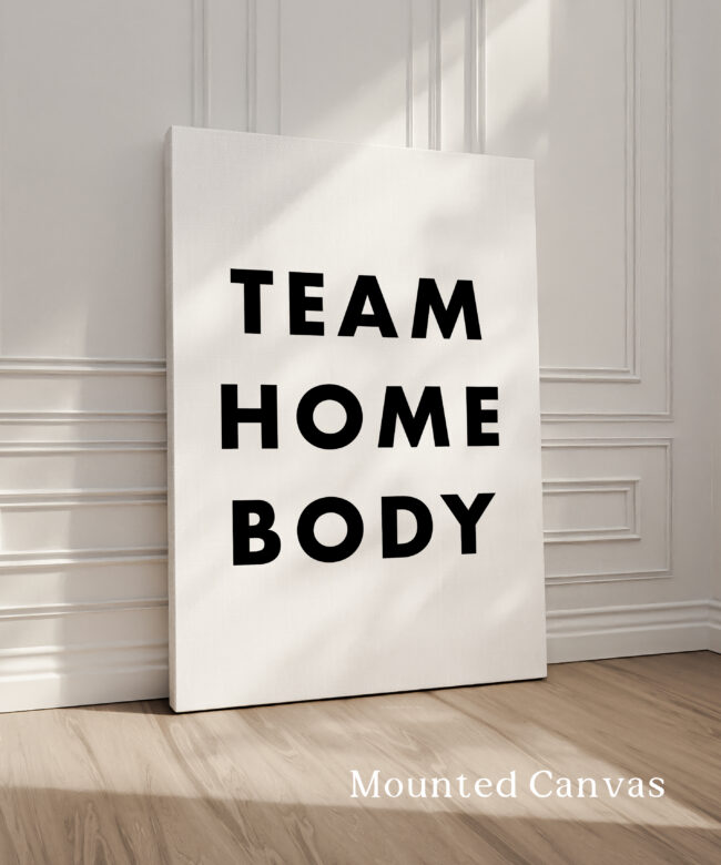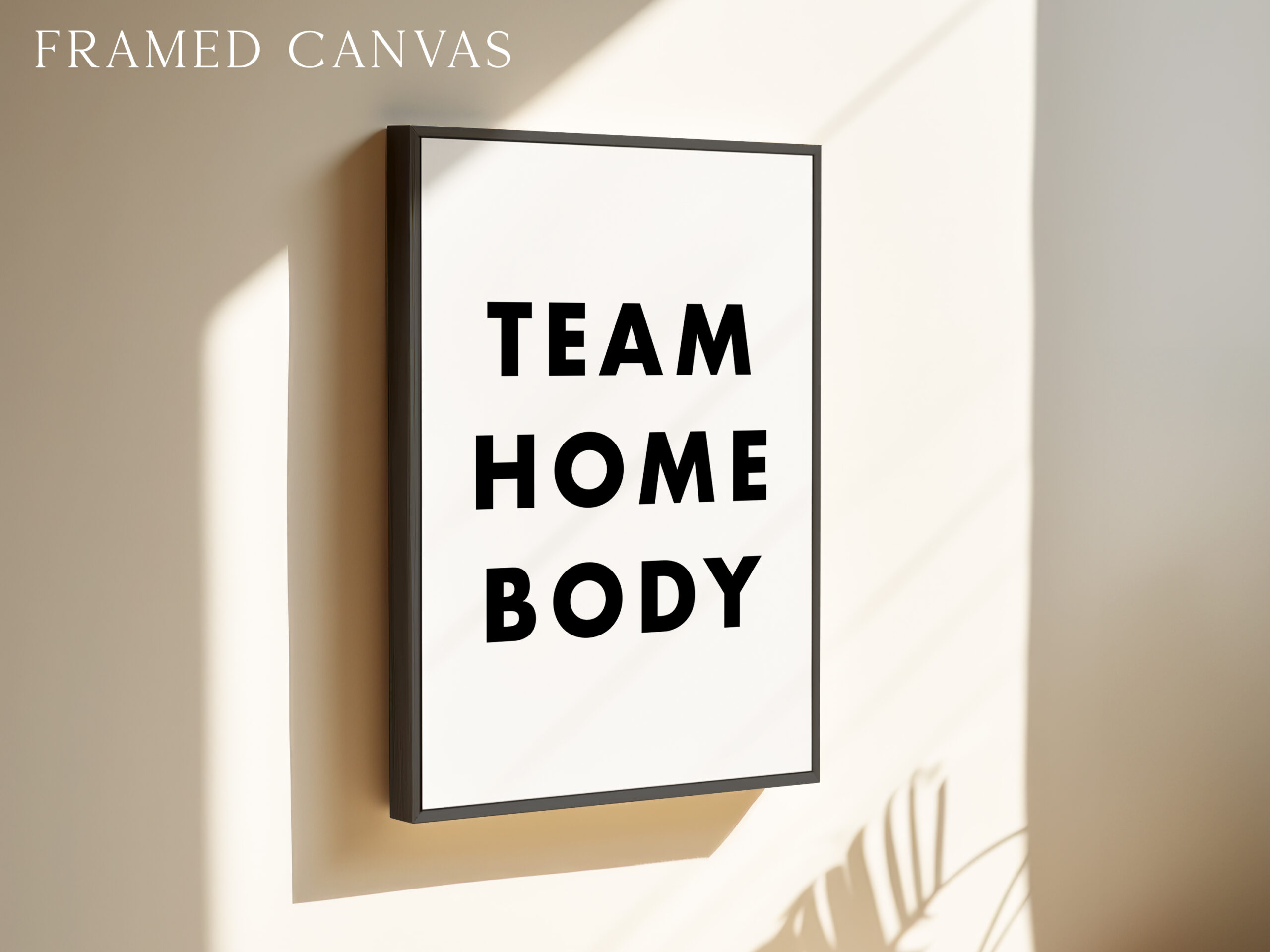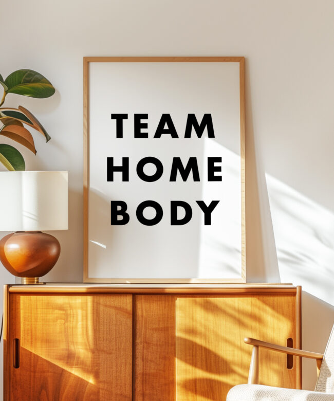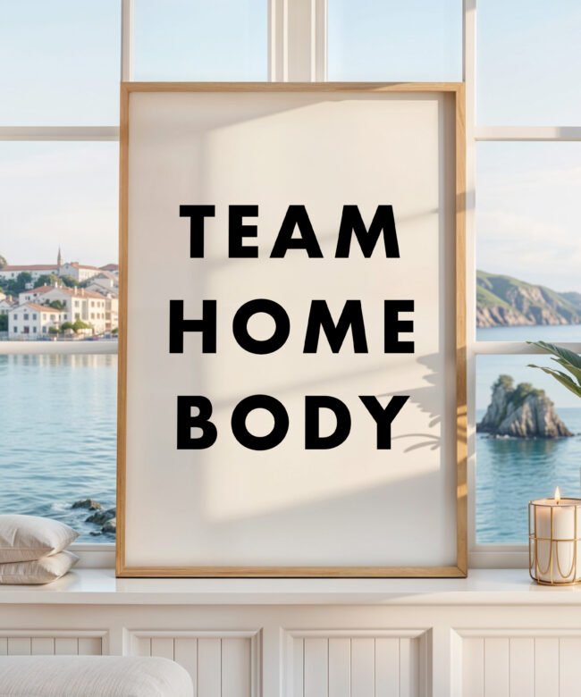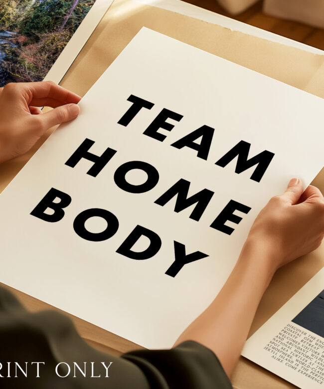 This bold typography art print celebrates the joy of staying in and loving home life. Featuring the phrase “Team Home Body” in clean, modern lettering, this piece adds personality and warmth to living rooms, bedrooms, reading nooks, and cozy corners.