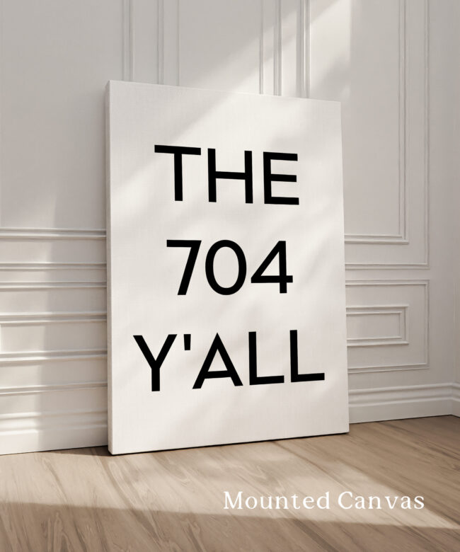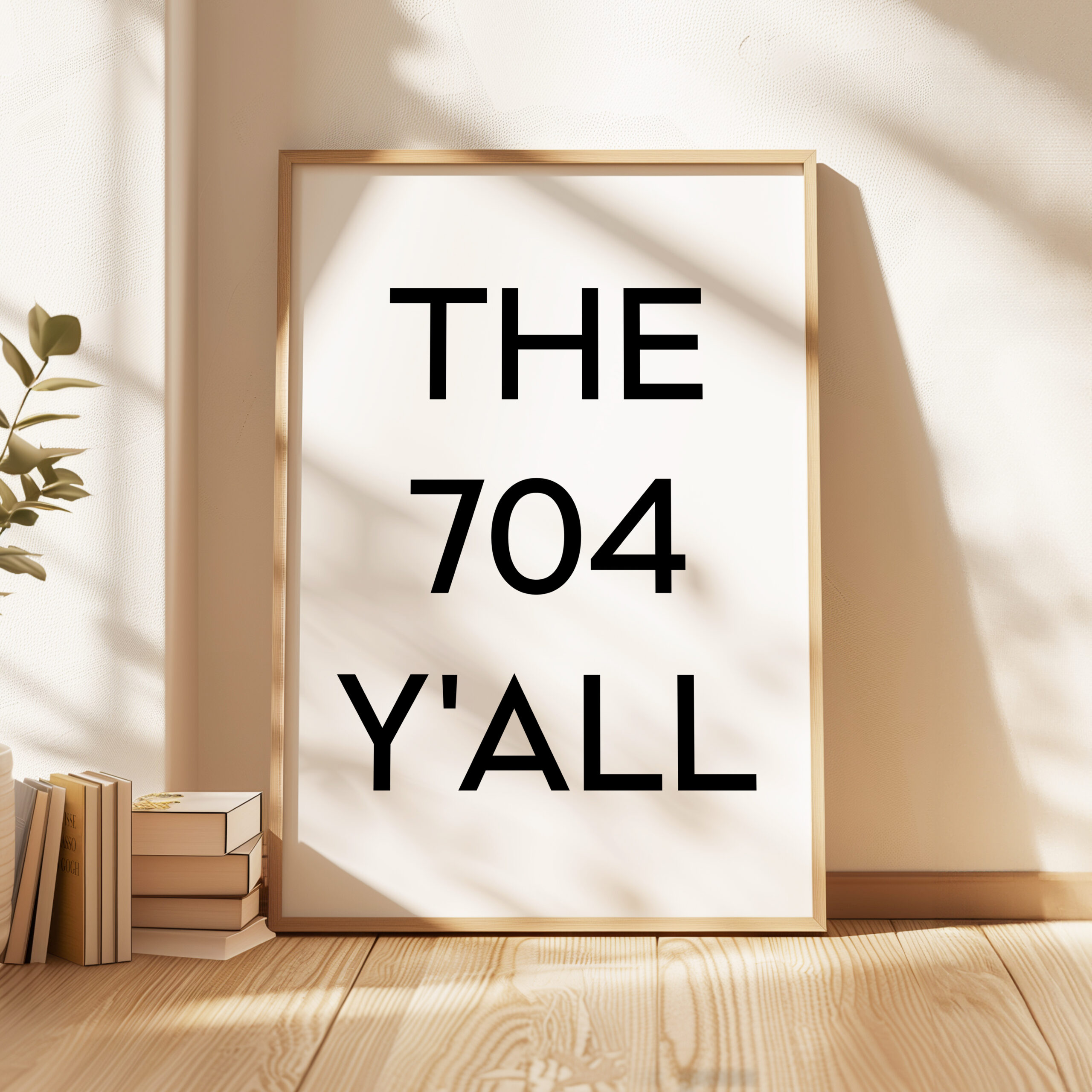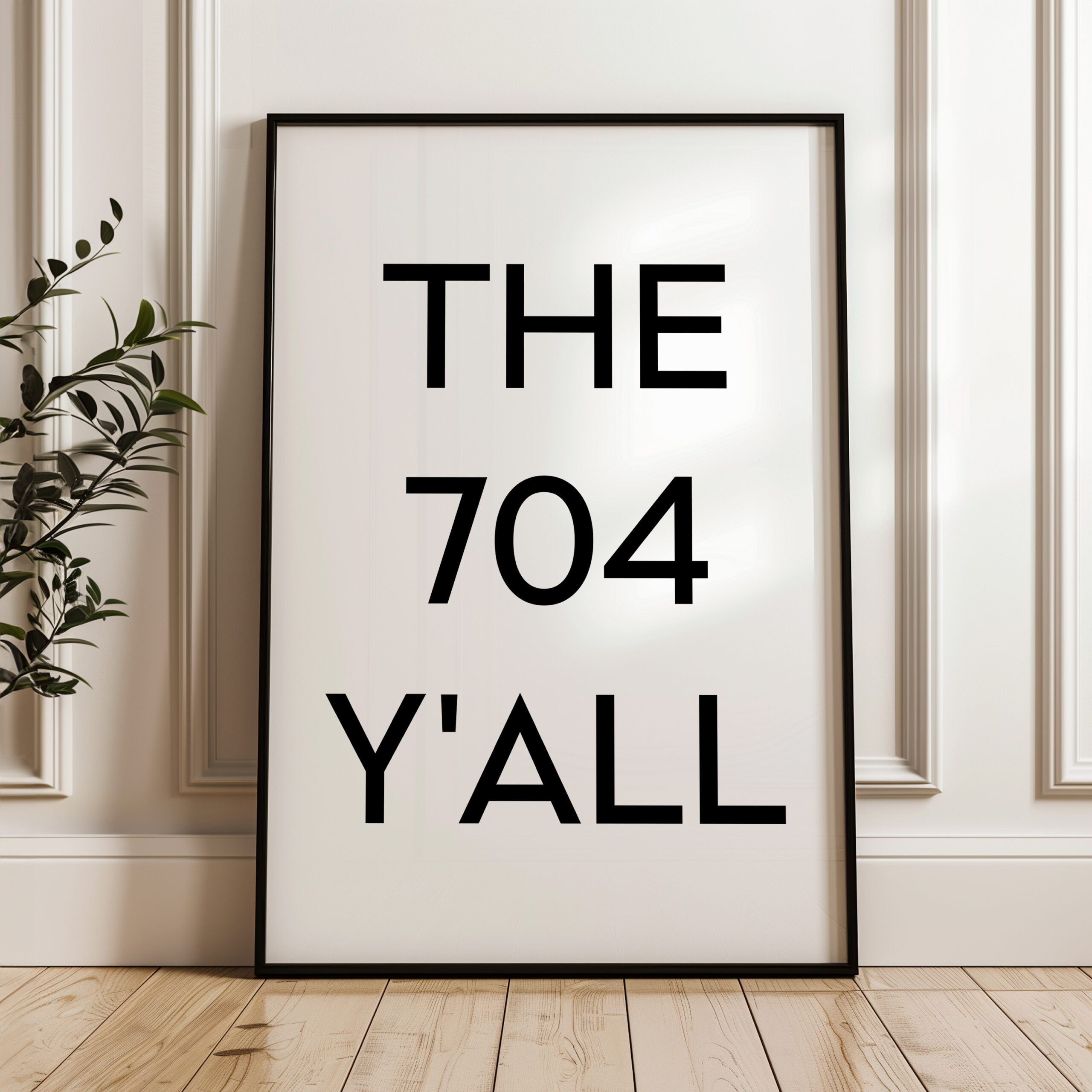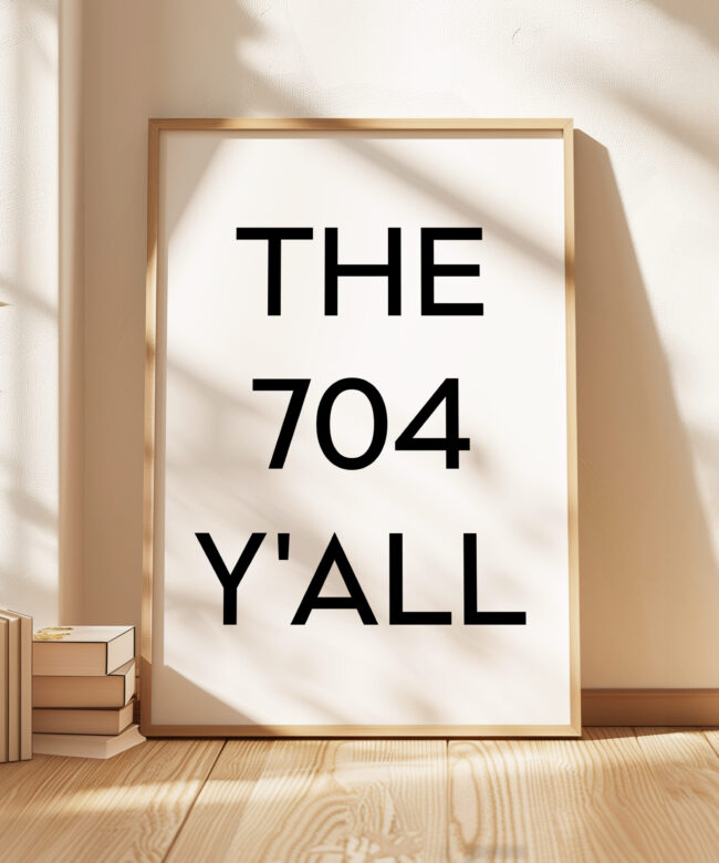 Show your love for the Queen City with this sharp and modern typography art print. Featuring the proud declaration “THE 704 Y’ALL” in a clean, bold font, this piece is a stylish way to represent Charlotte and its surrounding region. Perfect for locals, newcomers, or anyone with fond memories of the 704 area code, its minimalist black and white design fits effortlessly into any contemporary home or office, adding a touch of local North Carolina spirit.