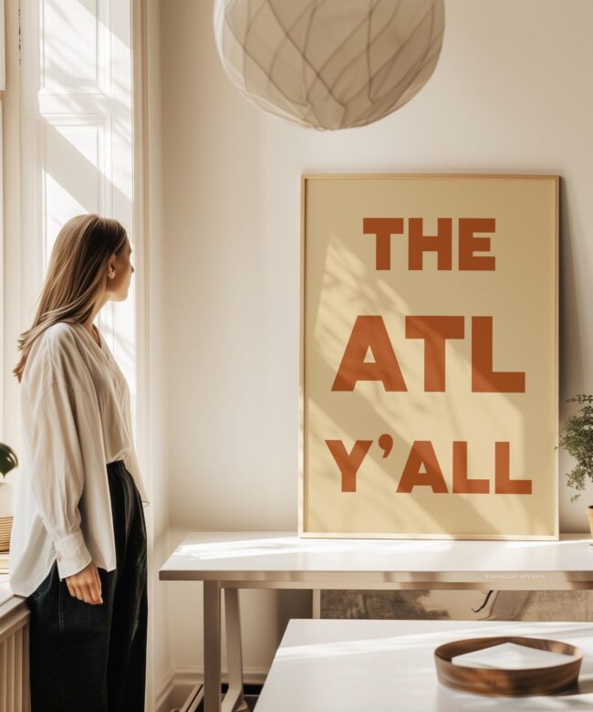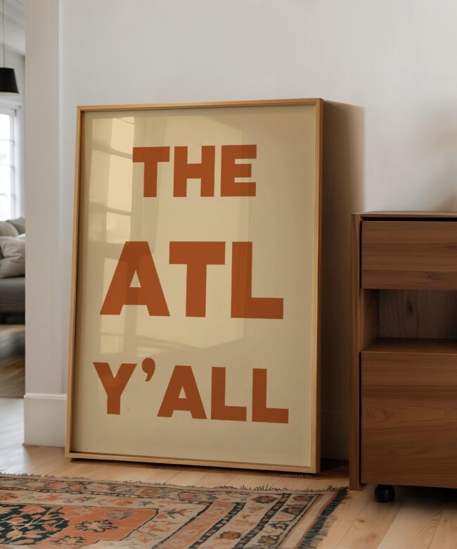 Celebrate your southern roots in bold style with this “THE ATL Y’ALL” art print. Designed in a retro-inspired font and warm tones, it captures the vibrant spirit of Atlanta with just the right dose of southern hospitality. Whether you’re gifting it to a proud Georgia native or adding flair to your own gallery wall, this piece is a standout. Great for housewarmings, graduations, or anyone who calls the Peach State home.
