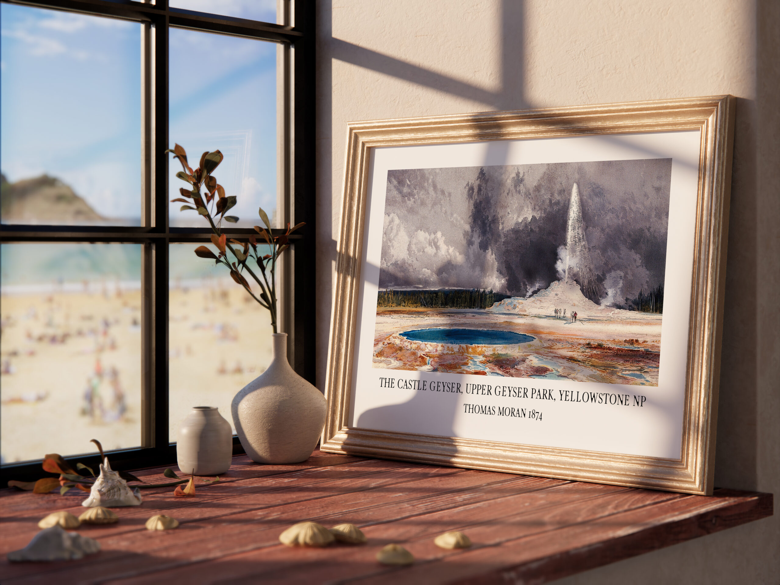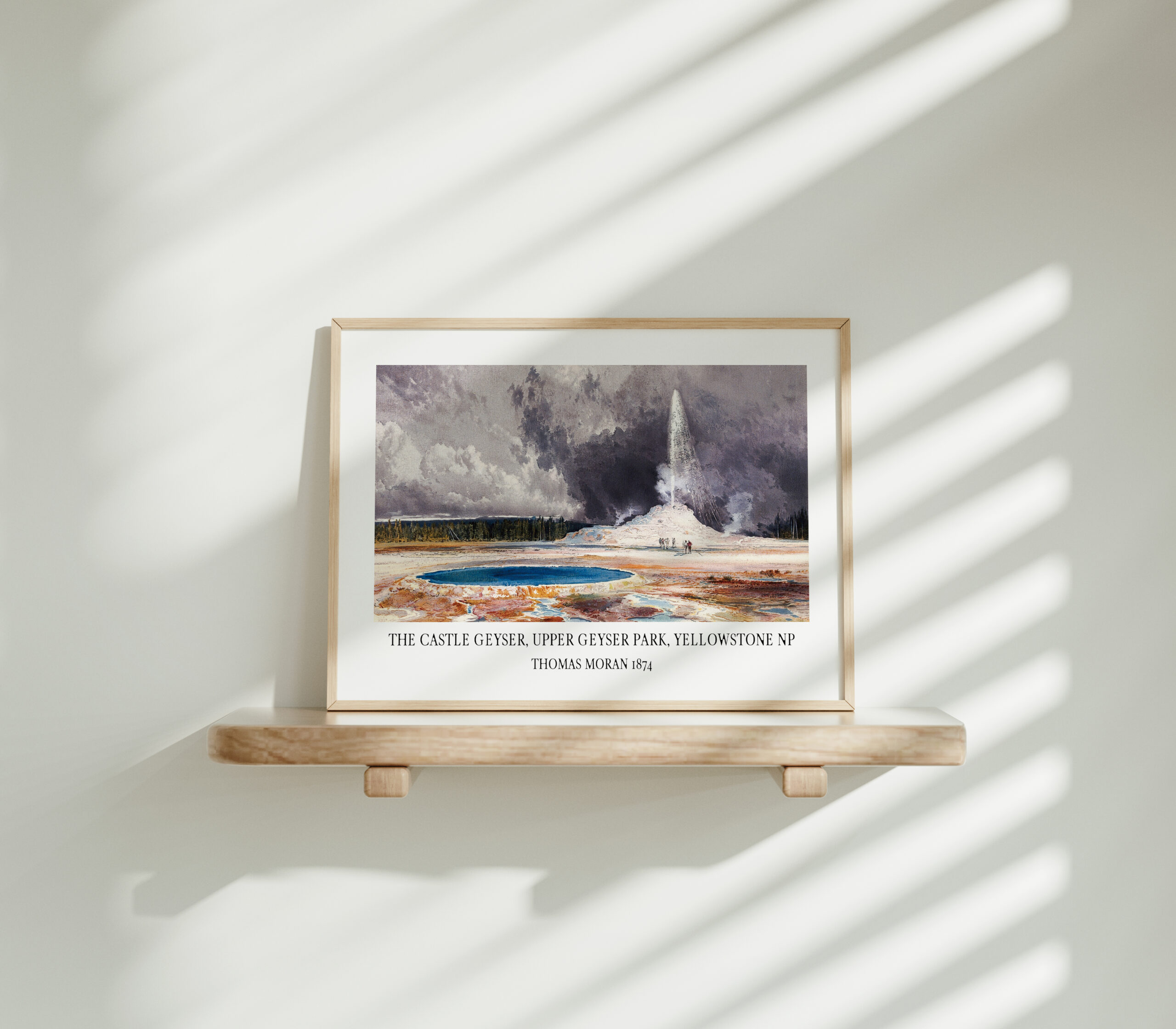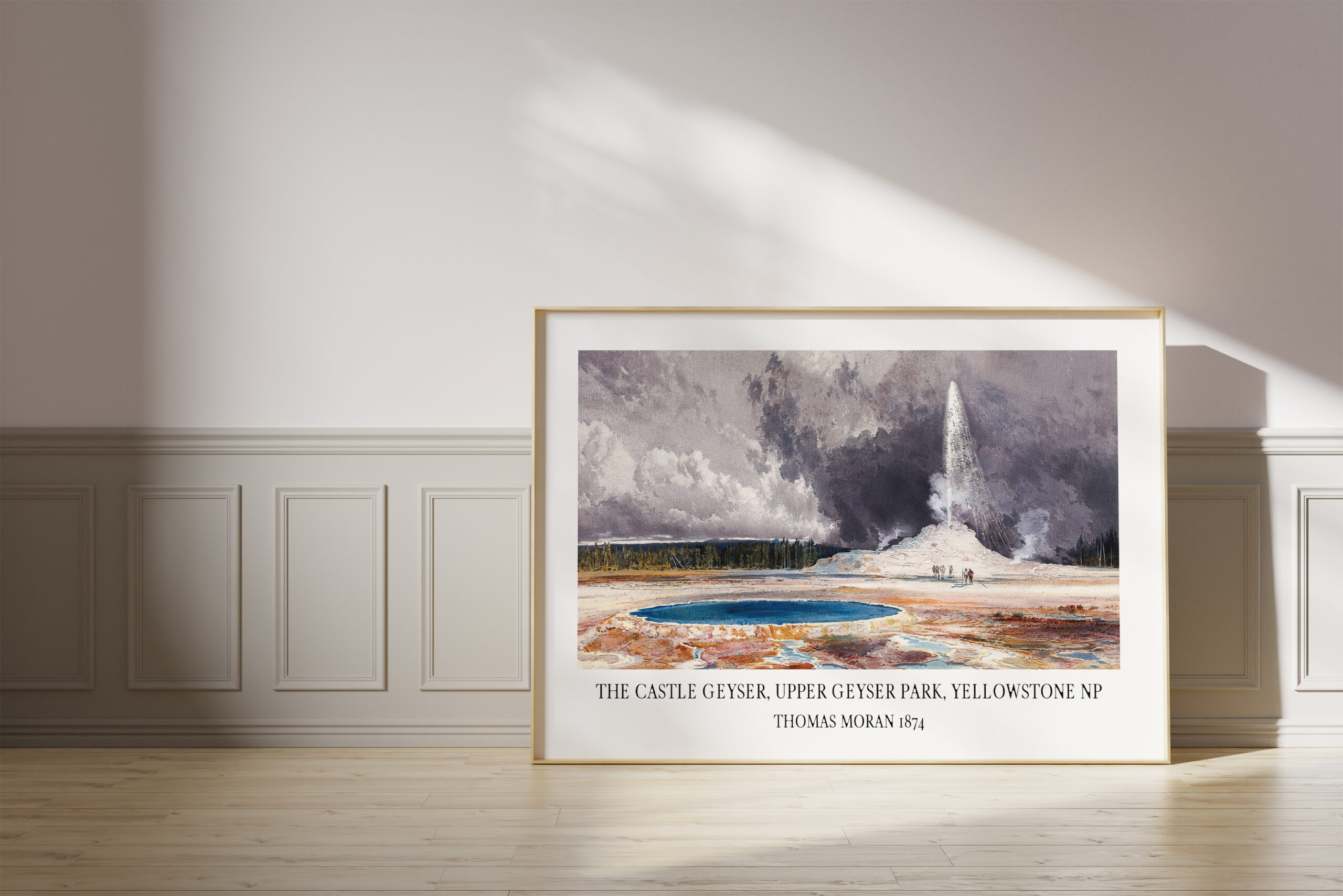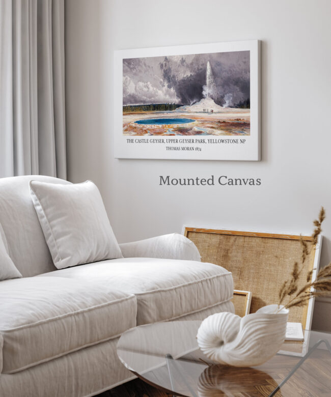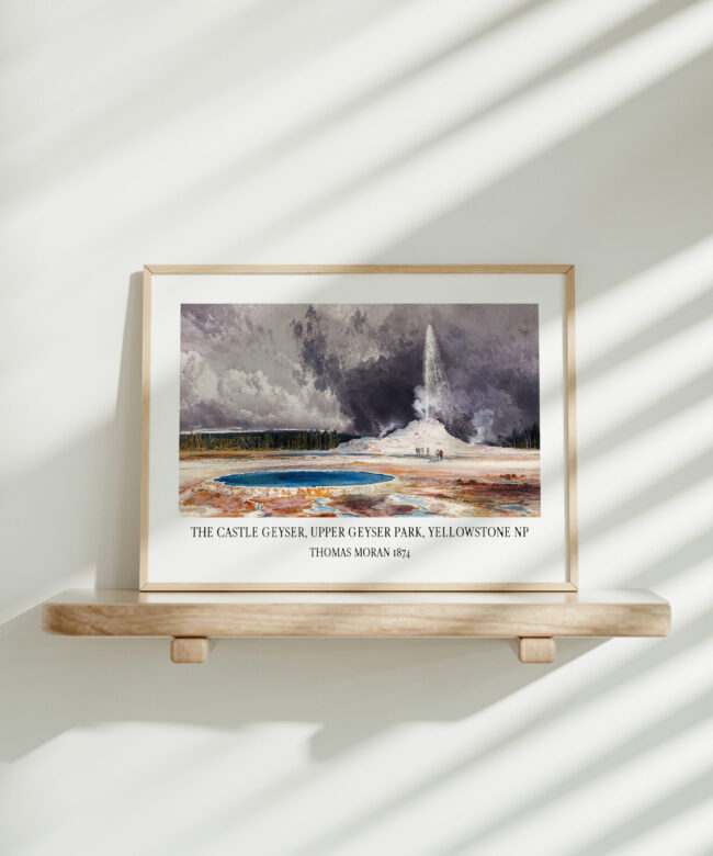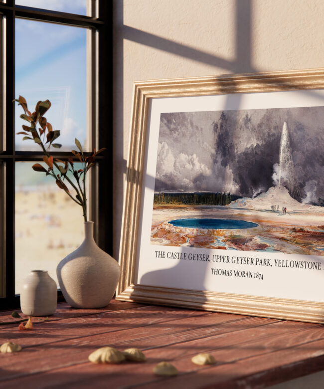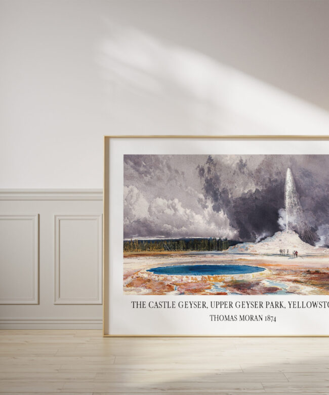 This captivating art print, a reproduction of Thomas Moran’s iconic 1874 painting, transports you to the heart of Yellowstone National Park, capturing the breathtaking power and majesty of the Castle Geyser in the Upper Geyser Basin. Moran’s masterful brushstrokes bring the scene to life, capturing the vibrant colors of the geyser’s eruption against the dramatic backdrop of the surrounding landscape.