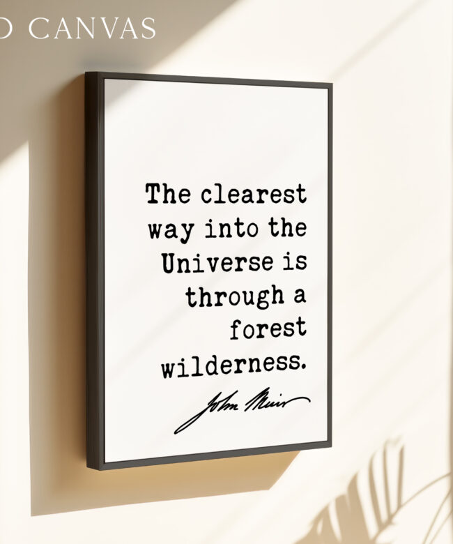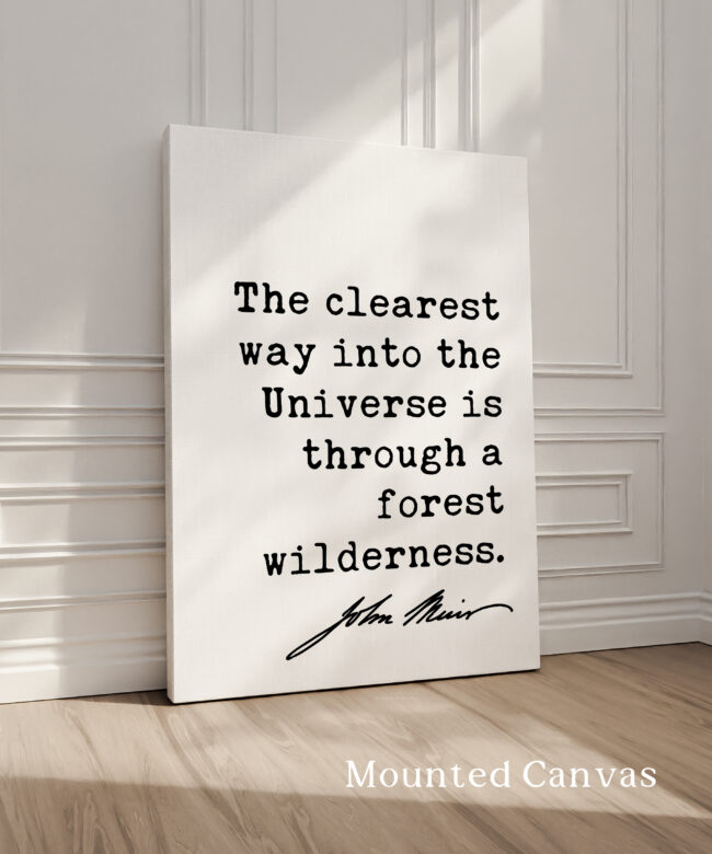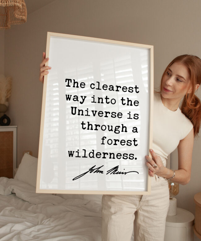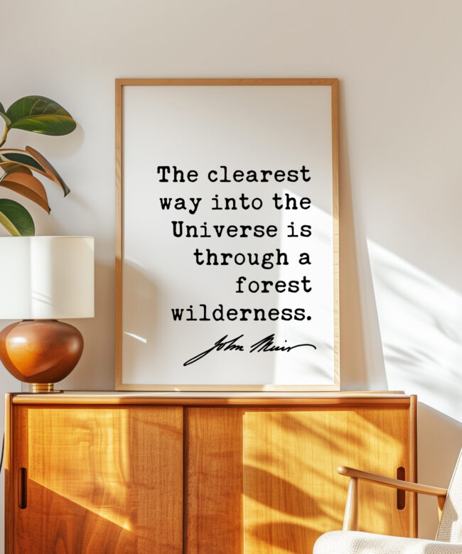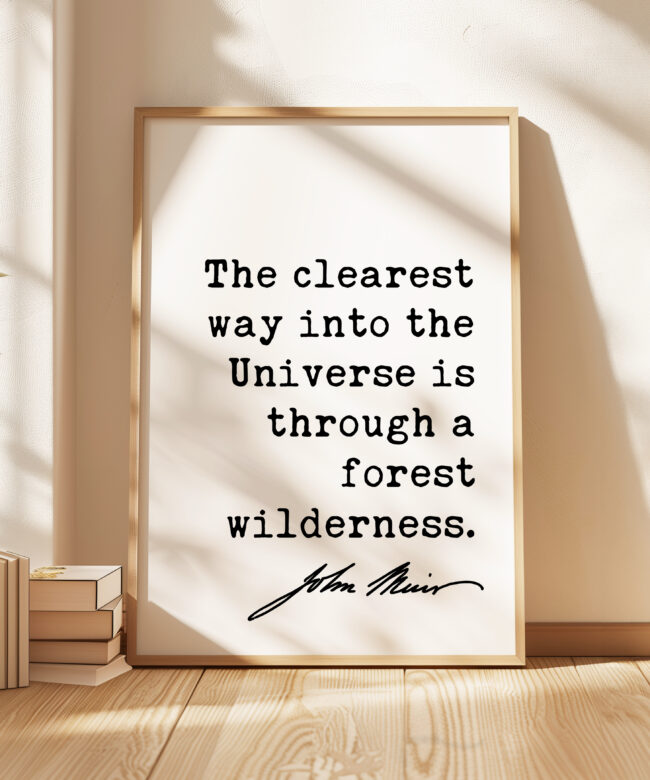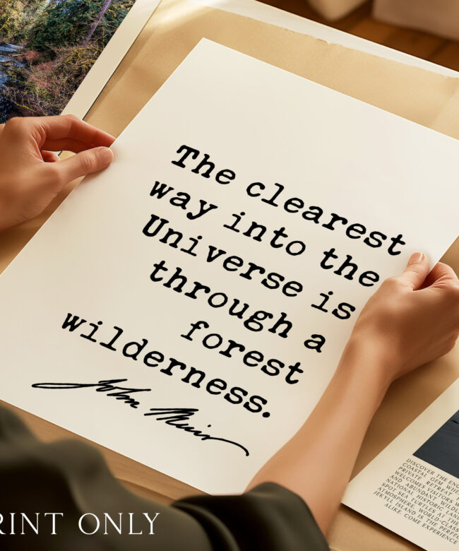 Bring the wonder of the wilderness into your home with this John Muir Typography Art Print featuring his timeless quote: “The clearest way into the Universe is through a forest wilderness.”