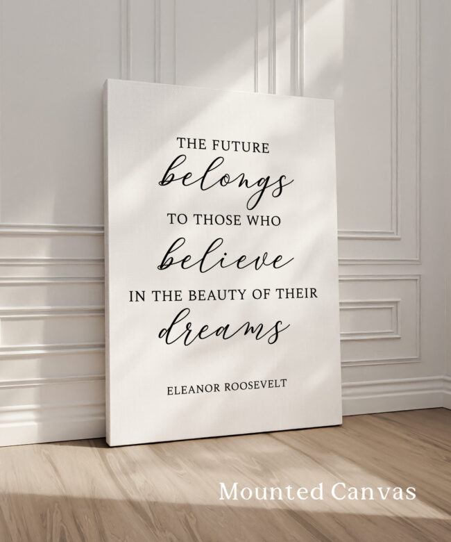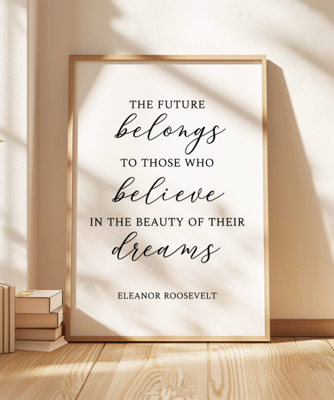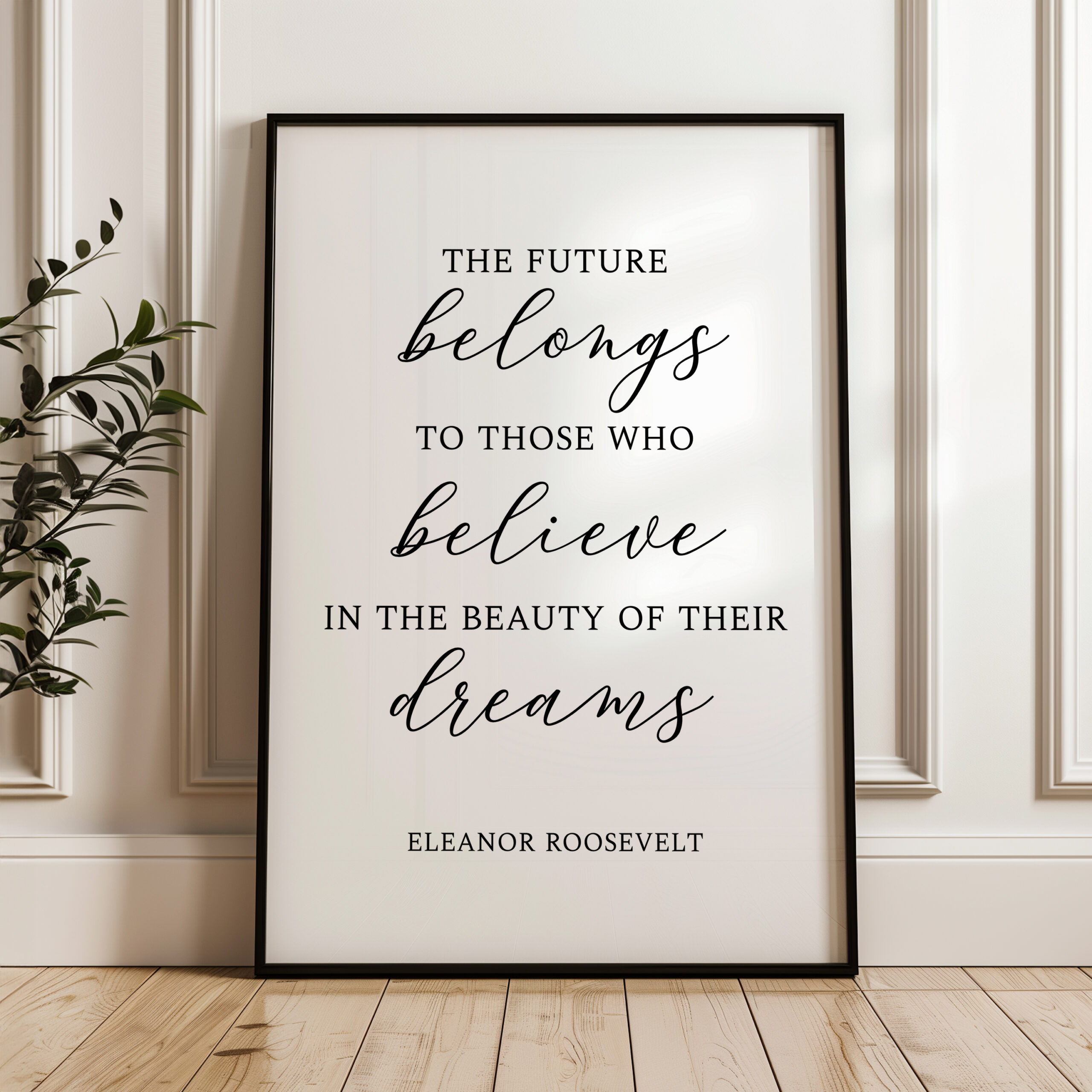 Inspire yourself and others with the timeless wisdom of Eleanor Roosevelt in this captivating Typography Art Print. The beautifully crafted design showcases the iconic quote “THE FUTURE BELONGS TO THOSE WHO BELIEVE IN THE BEAUTY OF THEIR DREAMS,” inviting you to reflect on your own ambitions and the power of perseverance. This artwork is a wonderful gift or personal keepsake that will uplift the spirit and ignite a sense of possibility in any space.