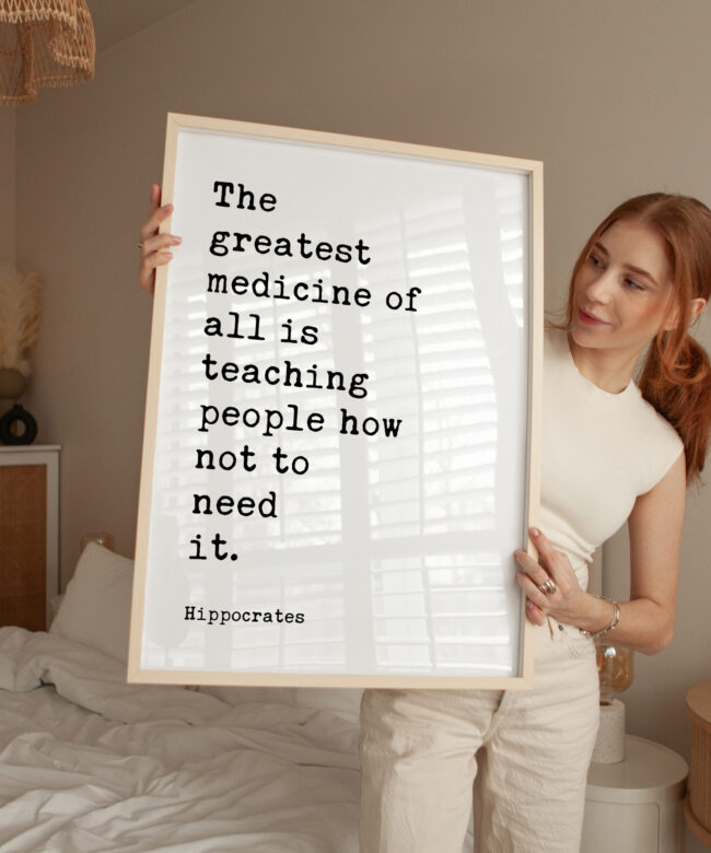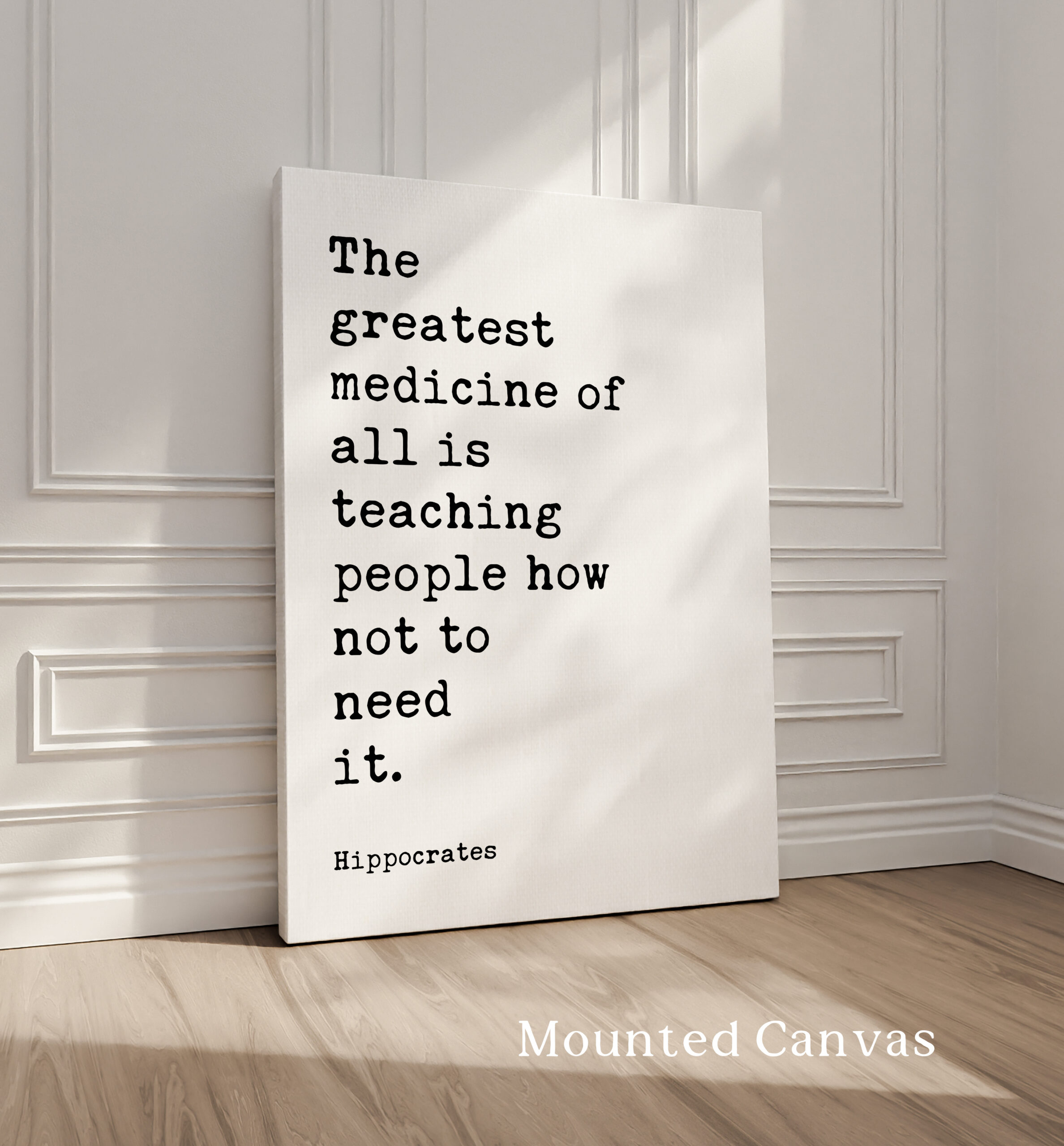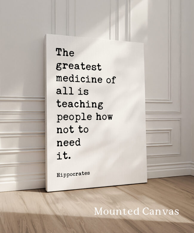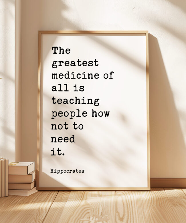 Embrace the profound wisdom of Hippocrates with our Typography Art Print, featuring the insightful quote: “The greatest medicine of all is teaching people how not to need it.”