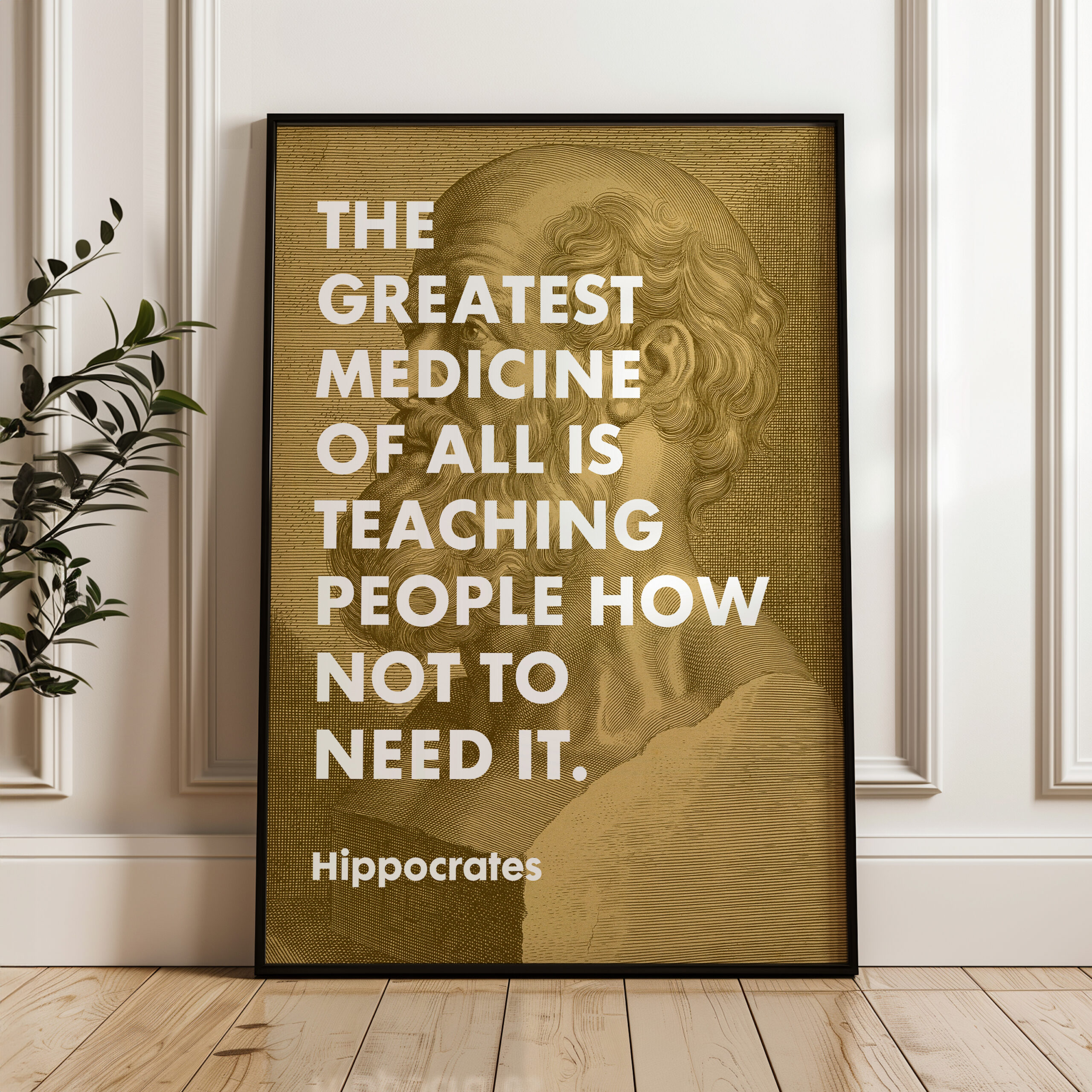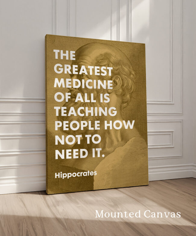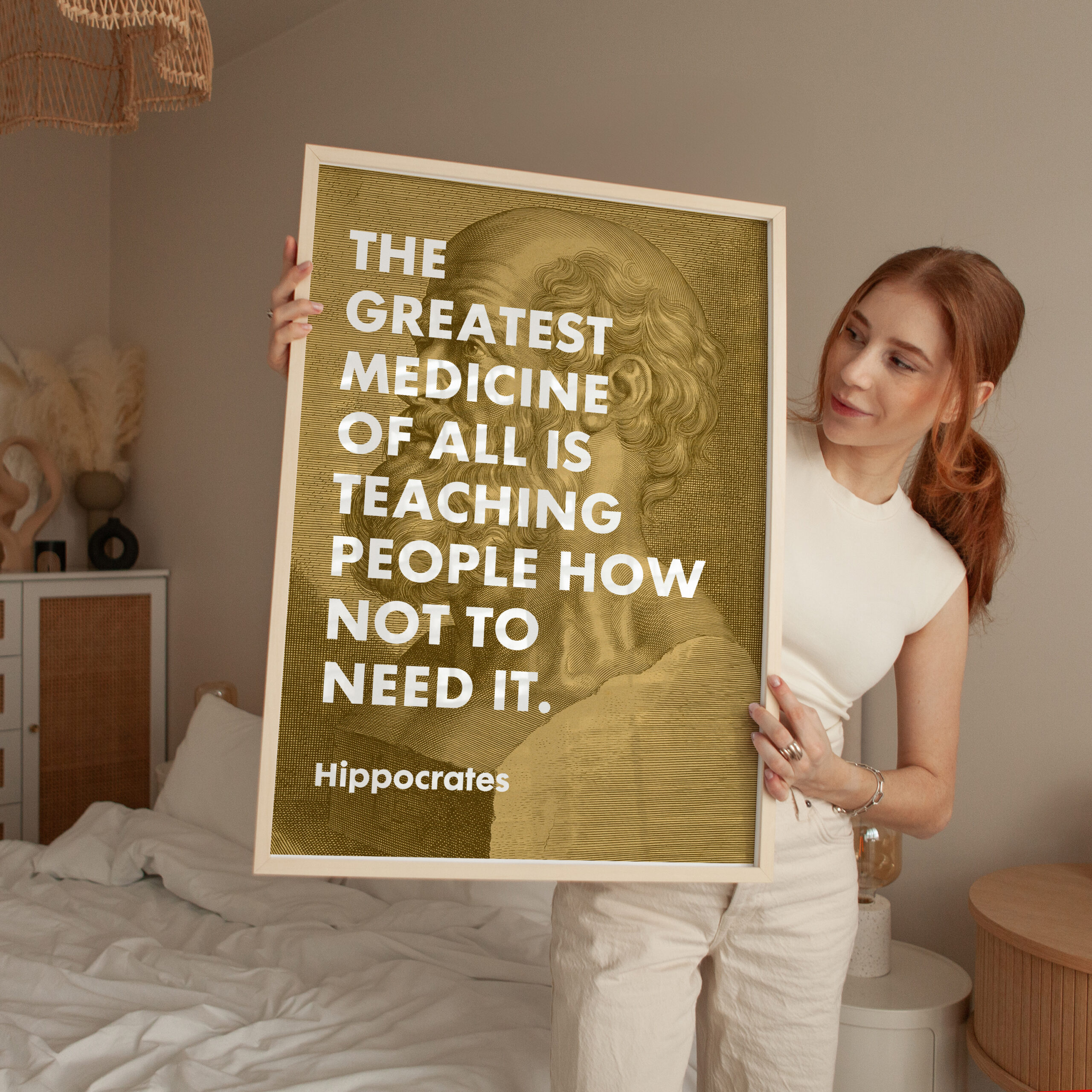 Embrace the timeless wisdom of Hippocrates with this Typography Art Print, which showcases the thought-provoking quote, “The greatest medicine of all is teaching people how not to need it.” The art features a beautiful sculpture of Hippocrates in the background, bringing both historical depth and modern flair to your décor. Ideal for anyone passionate about health, well-being, or living a balanced life, this print offers both an intellectual and aesthetic touch to any room.