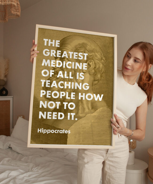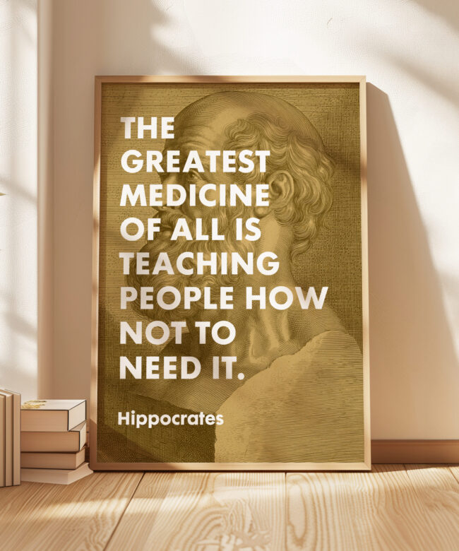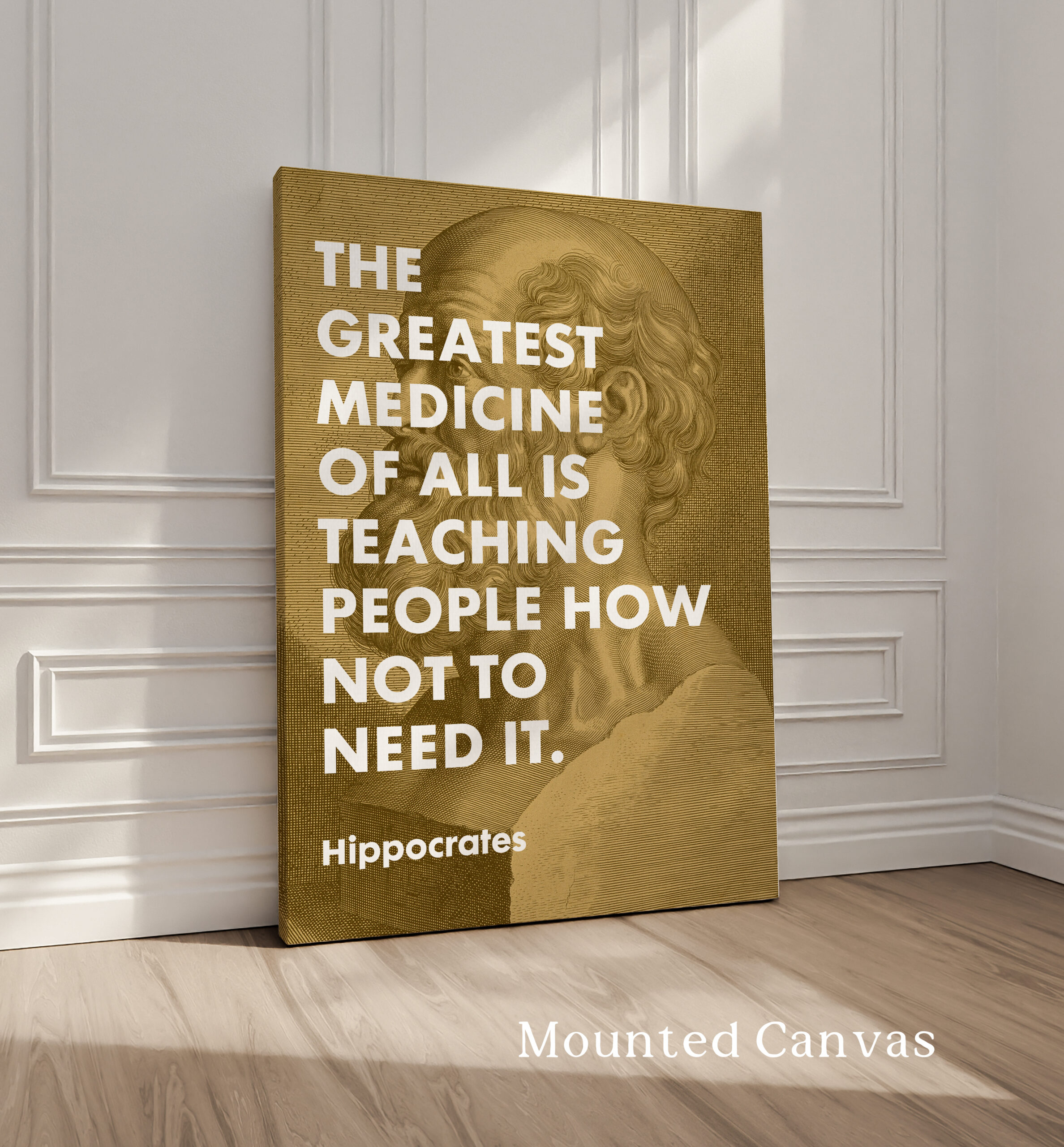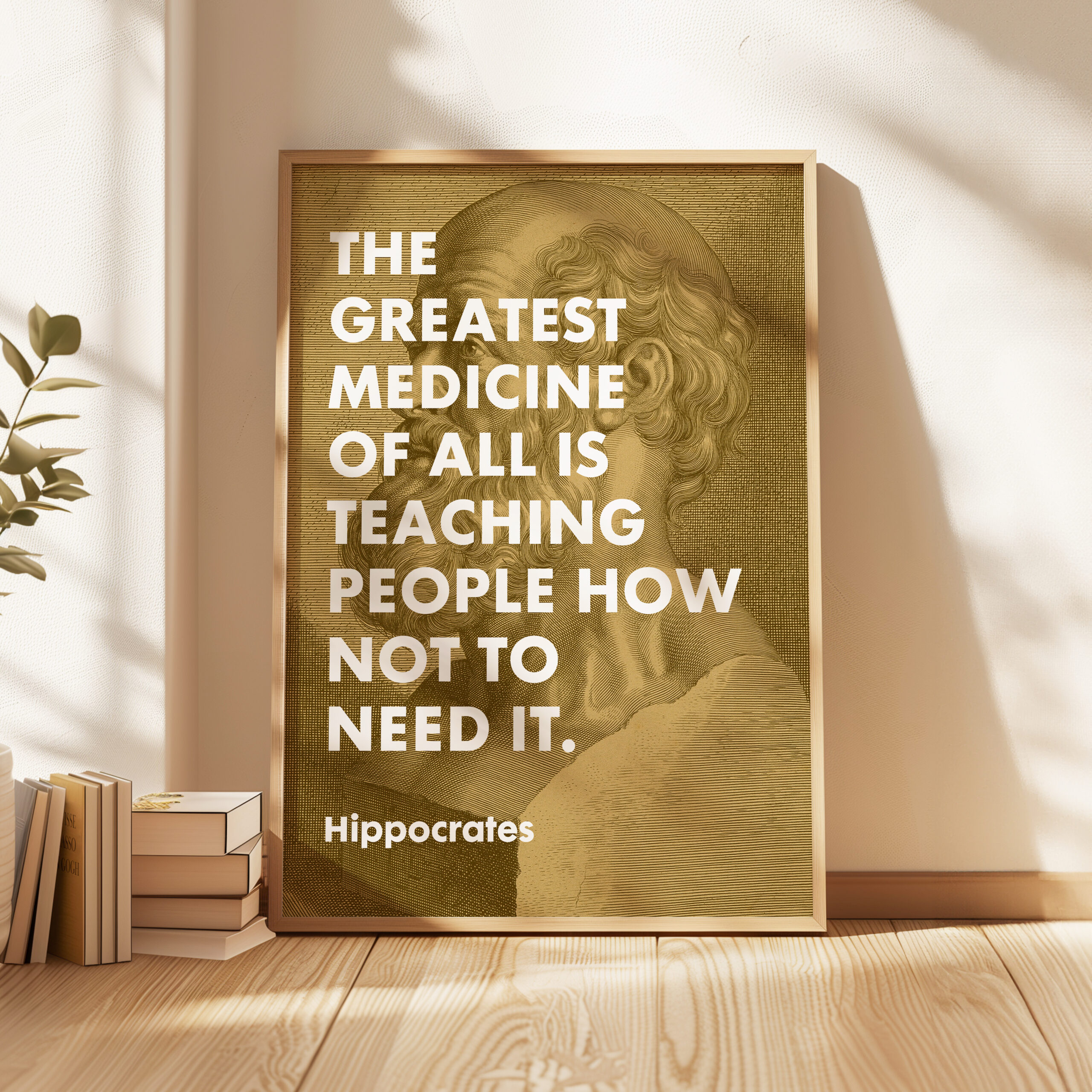 Embrace the timeless wisdom of Hippocrates with this Typography Art Print, which showcases the thought-provoking quote, “The greatest medicine of all is teaching people how not to need it.” The art features a beautiful sculpture of Hippocrates in the background, bringing both historical depth and modern flair to your décor. Ideal for anyone passionate about health, well-being, or living a balanced life, this print offers both an intellectual and aesthetic touch to any room.