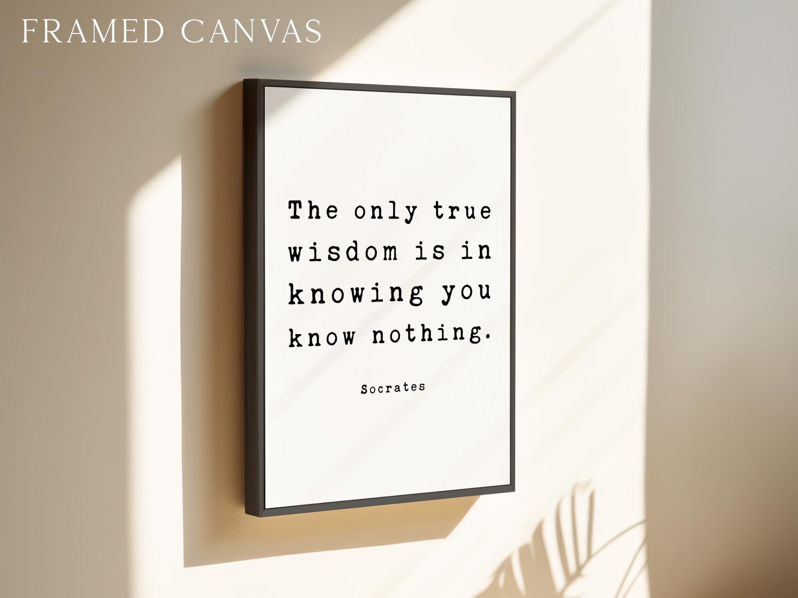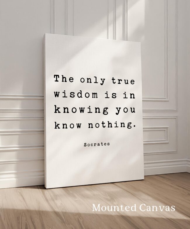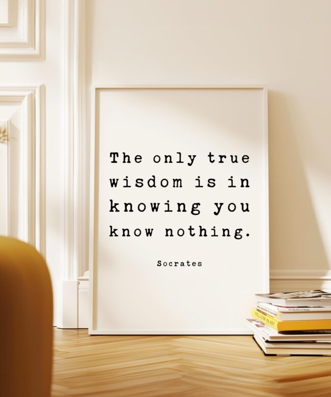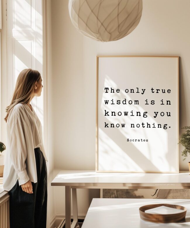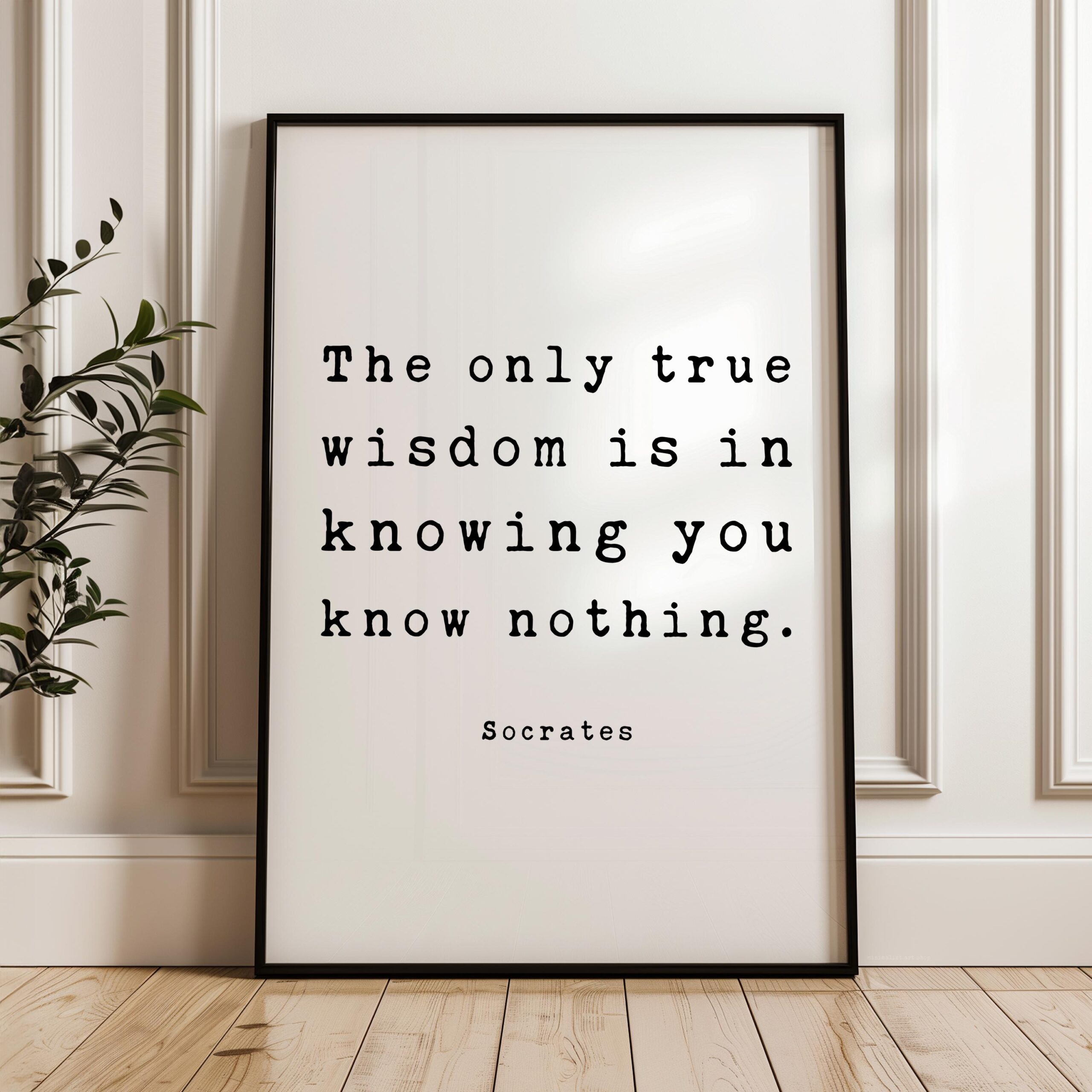 Elevate your space with timeless wisdom from one of history’s greatest thinkers. This minimalist art print features the iconic Socratic insight, “The only true wisdom is in knowing you know nothing.” Clean, classic typewriter-style font on a neutral backdrop makes it a versatile statement piece for any room. Makes a thoughtful gift for teachers, philosophy lovers, graduates, or anyone who thrives on curiosity and growth.