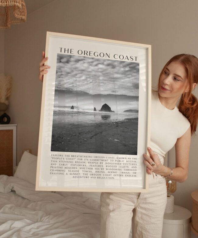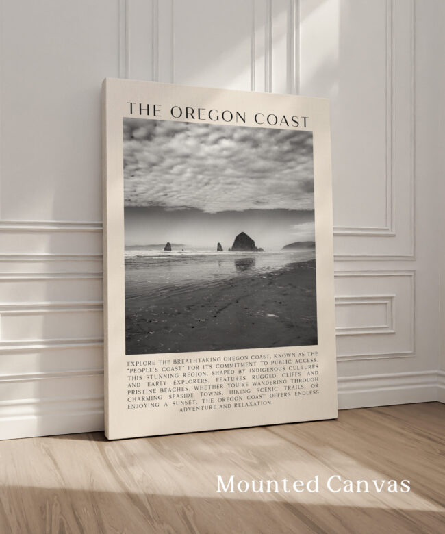 This exquisite Typography Art Print beautifully captures the essence of Cannon Beach, with its majestic Haystack Rock and sweeping coastal views. Photographed by Jessie Dysart, the image invites you to explore the rugged cliffs and charming towns of the Oregon Coast. The words “THE OREGON COAST” add a touch of elegance, making it an ideal piece for any space. This print is a thoughtful gift or keepsake for anyone who loves the natural beauty and serenity of the Pacific Northwest.