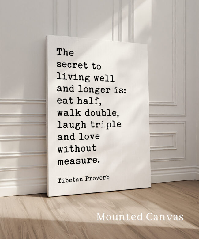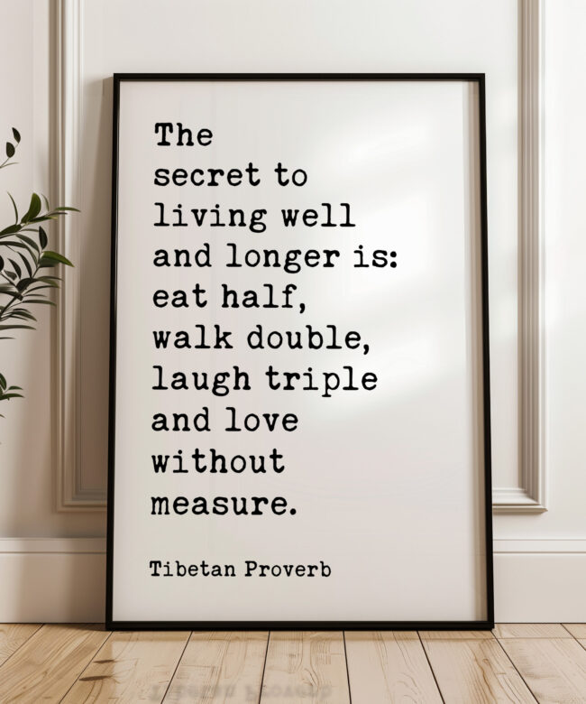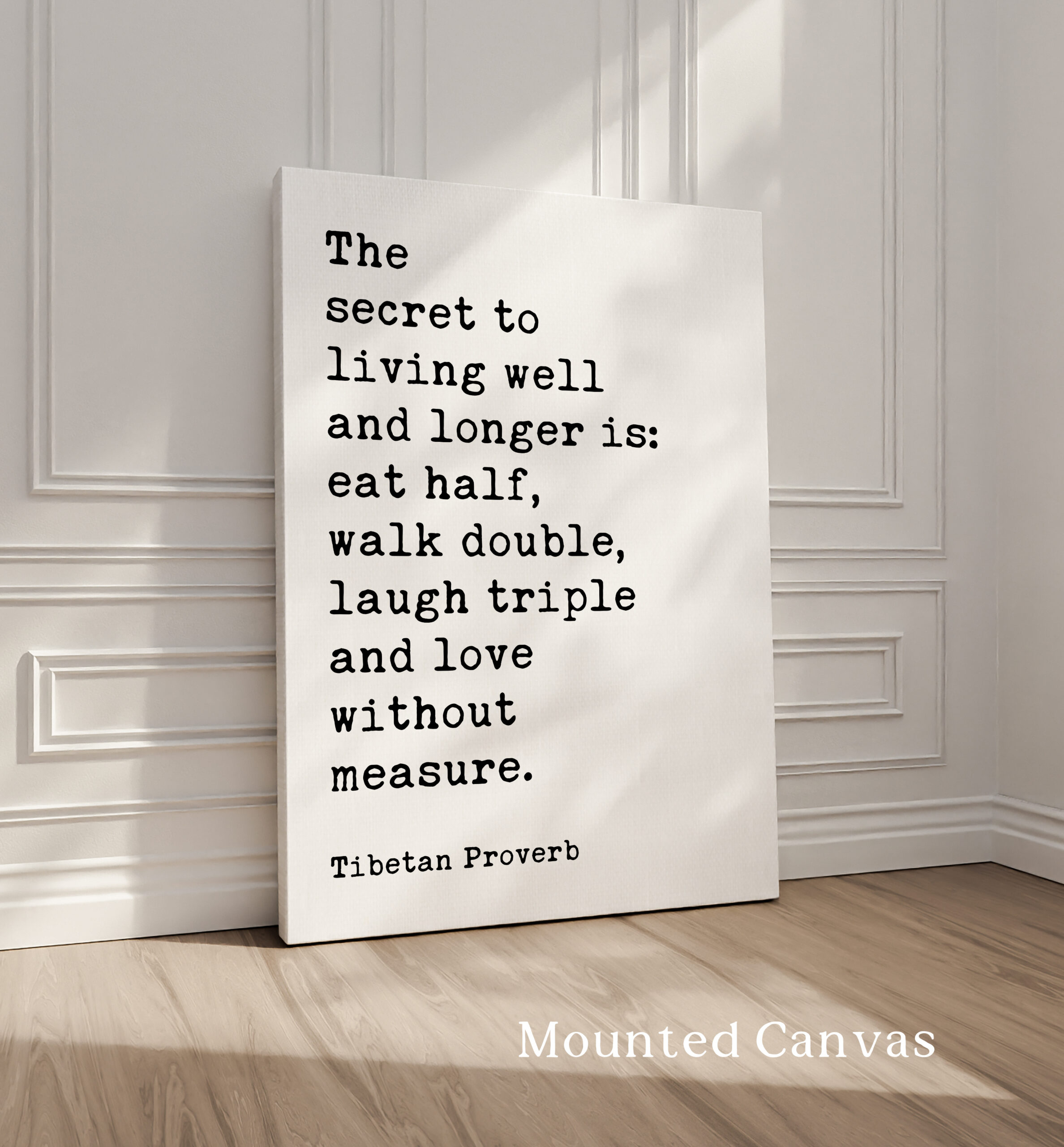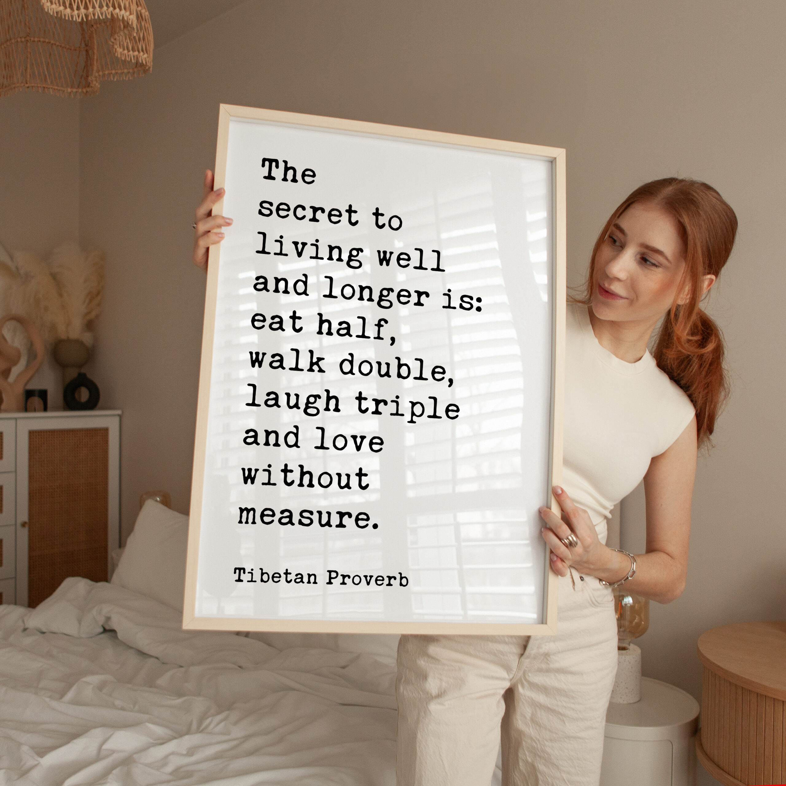 The secret to living well and longer is: eat half, walk double, laugh triple and love without measure. Tibetan Proverb Typography Art Print