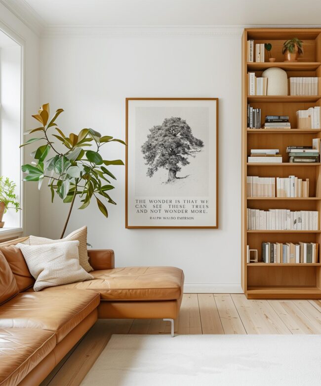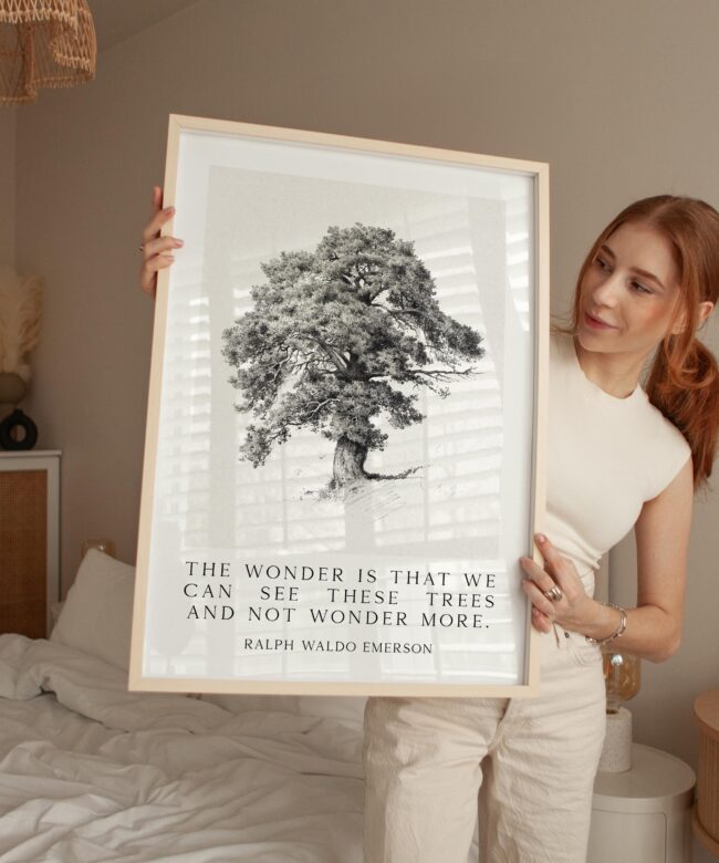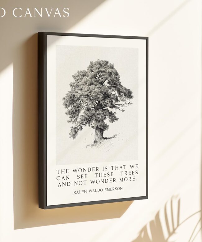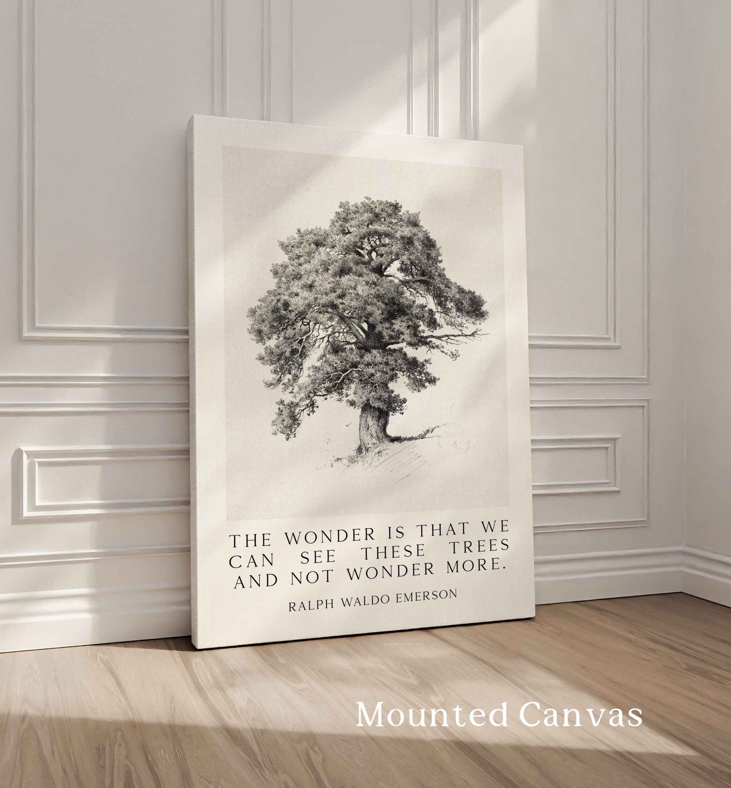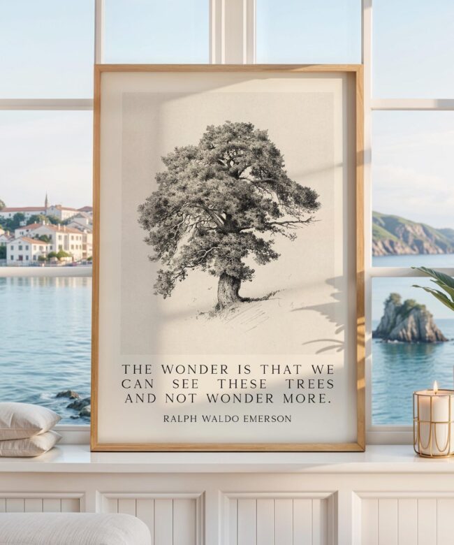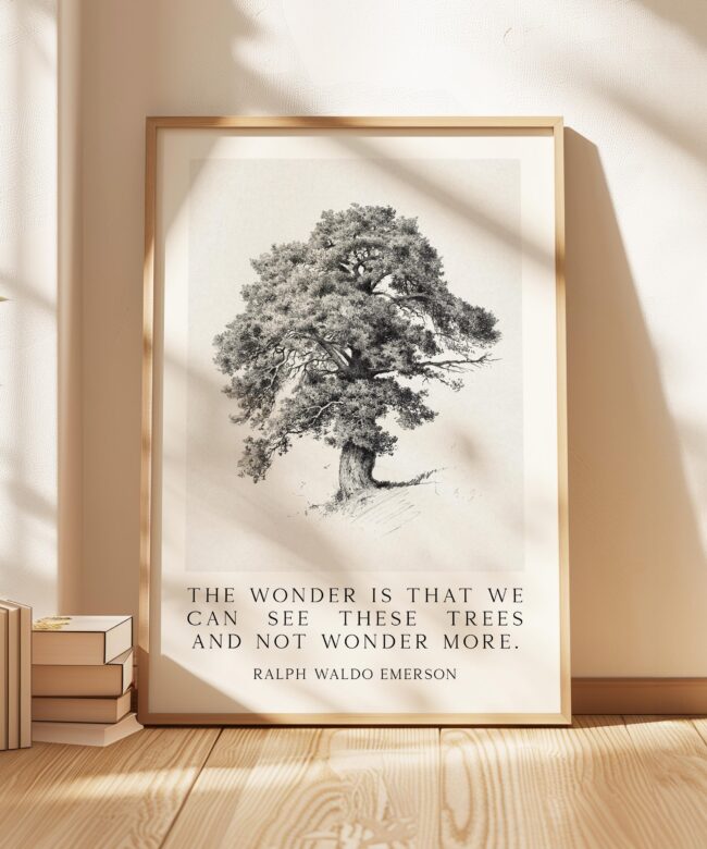 Celebrate the timeless words of Ralph Waldo Emerson with this “The Wonder Is That We Can See These Trees” Typography Art Print. Paired with an elegant 1880s Mänty Vintage Tree illustration, this design reflects Emerson’s deep reverence for nature and its quiet wisdom.