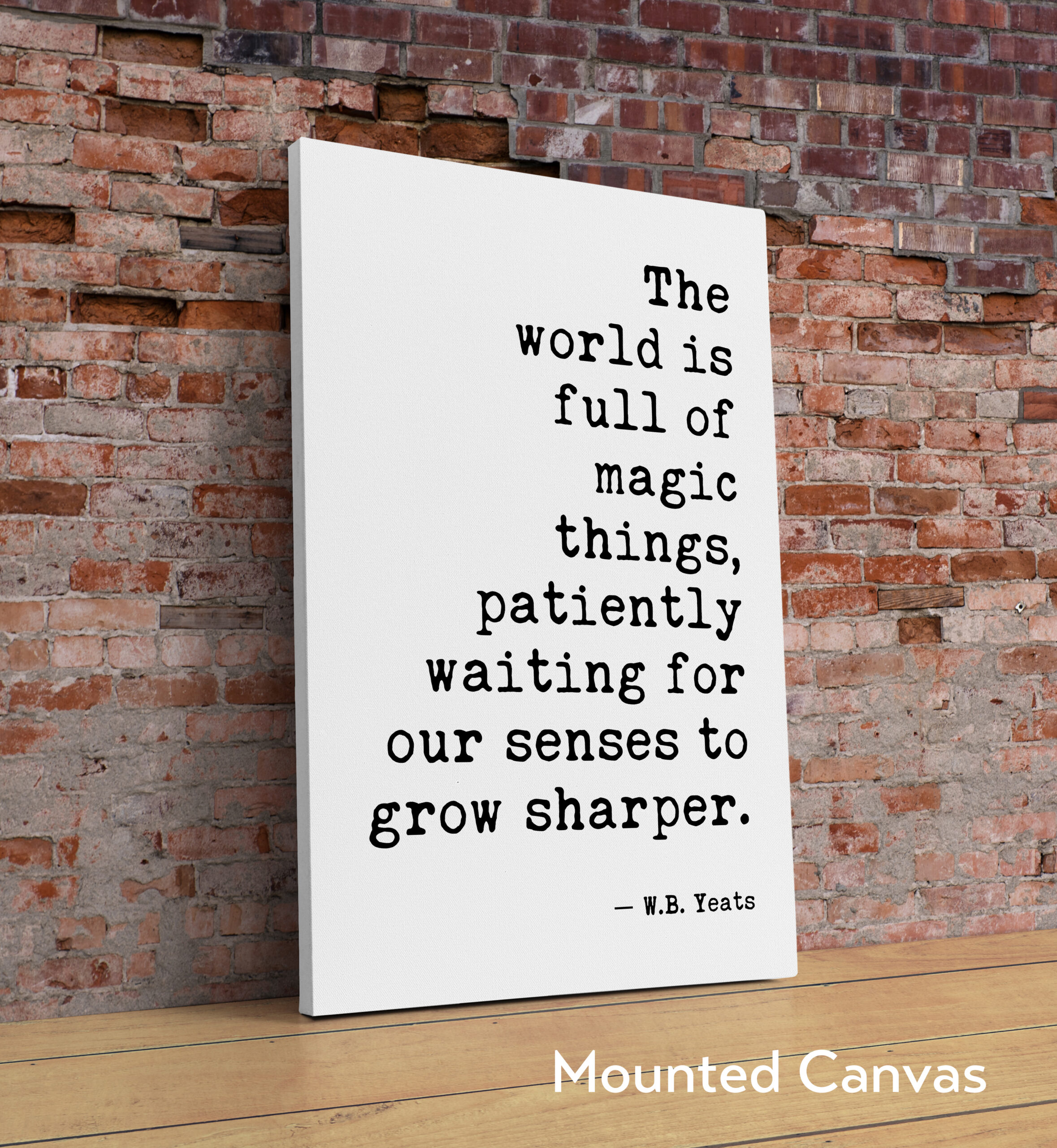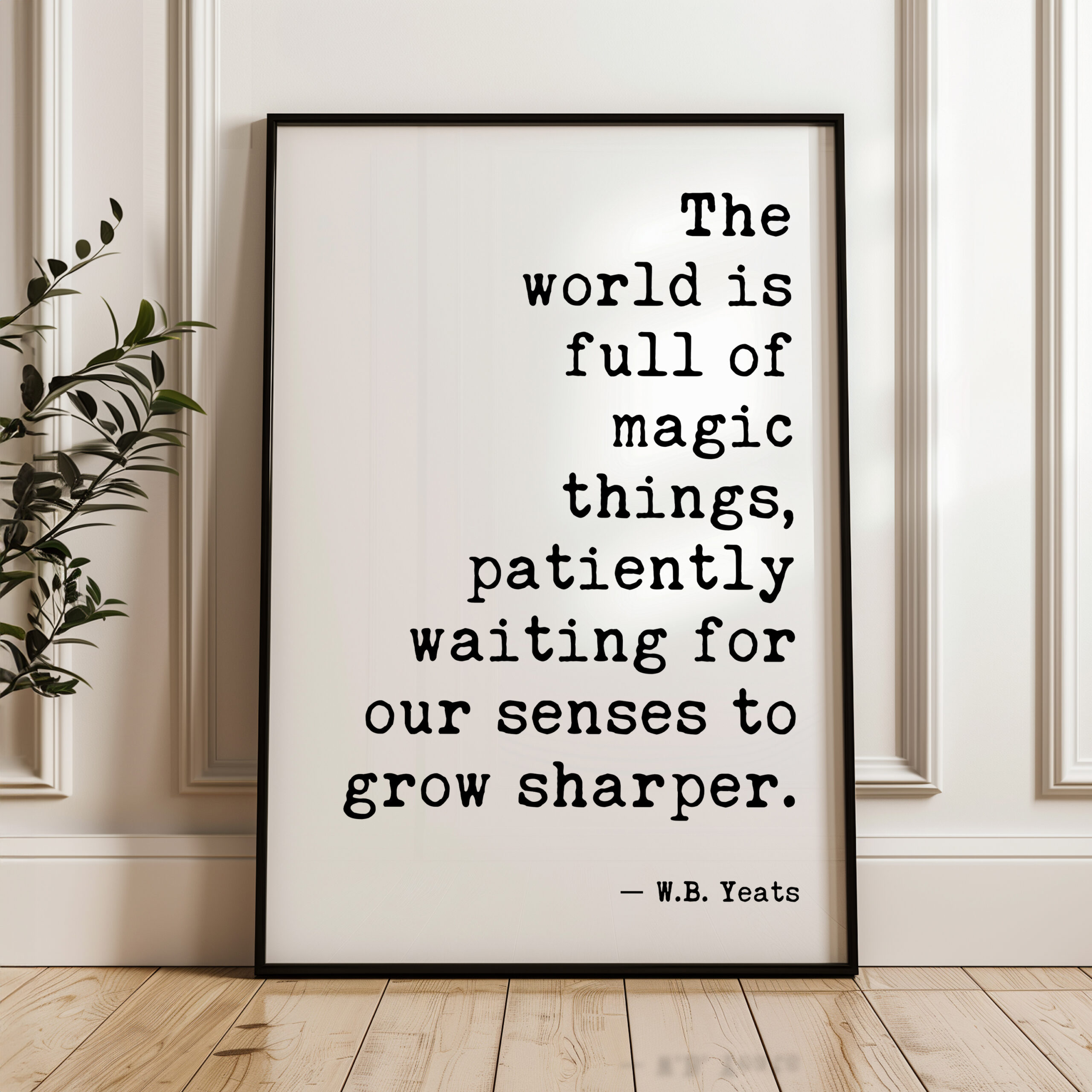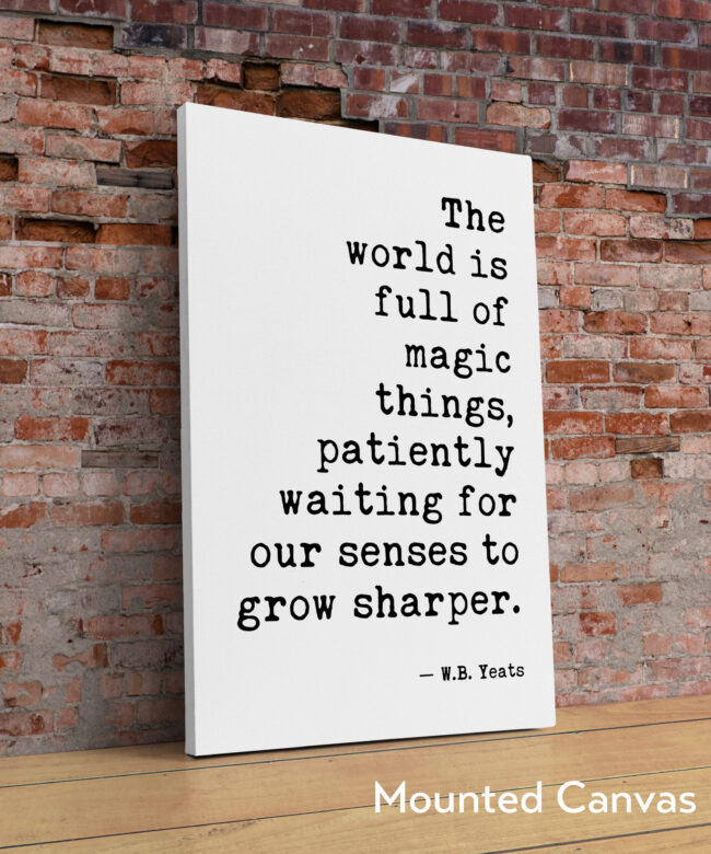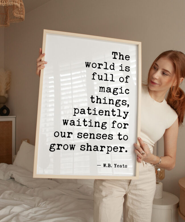 Infuse your space with inspiration using our typography art print featuring the profound words of W.B. Yeats: “The world is full of magic things, patiently waiting for our senses to grow sharper.” This print serves as a daily reminder to embrace the beauty and wonder around us. Perfect for your home, office, or creative space, it adds a touch of literary elegance and encourages mindfulness in everyday life.