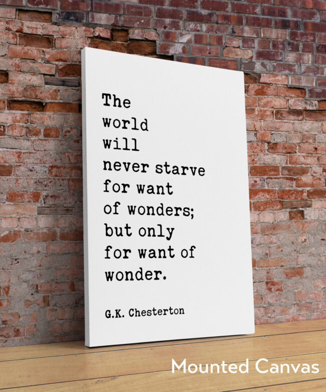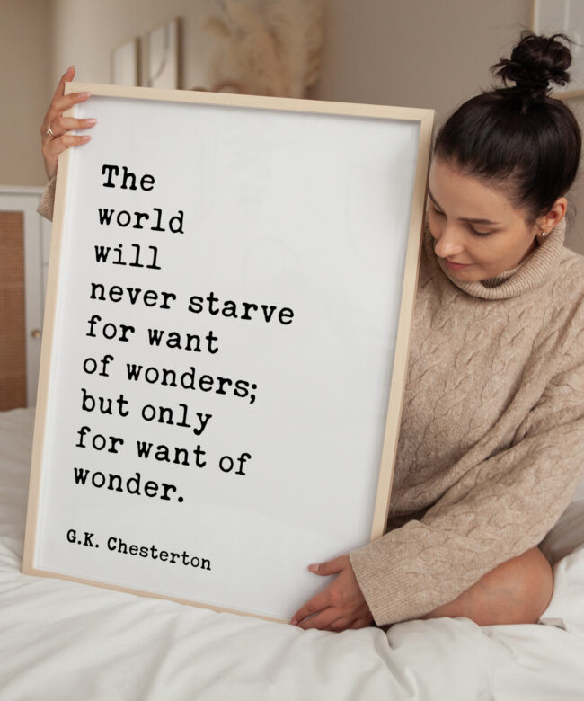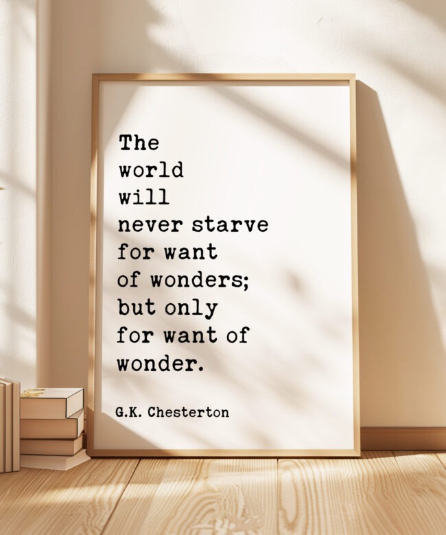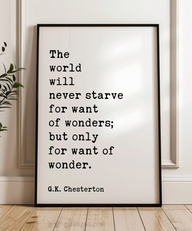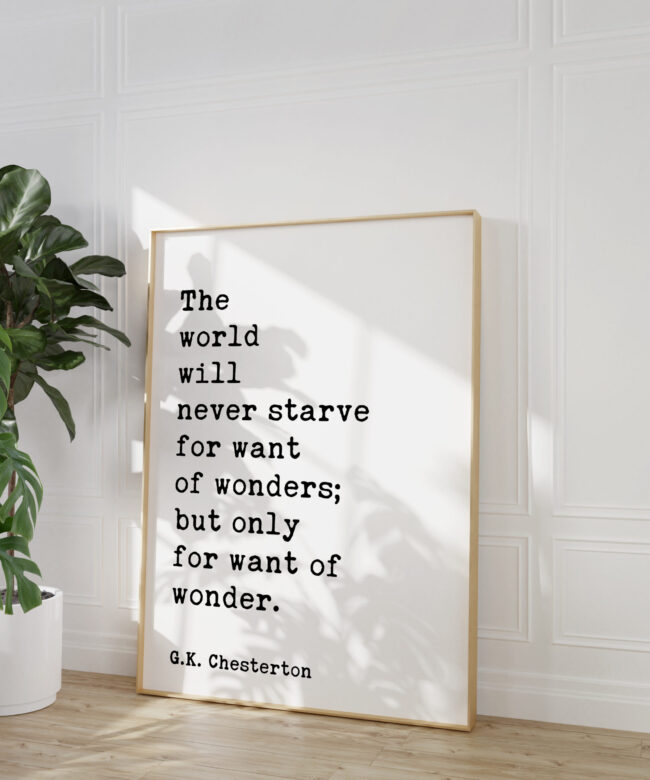 Embrace the magic of the ordinary and rediscover the wonder in everyday life with this captivating typography art print featuring the insightful words of G.K. Chesterton, “The world will never starve for want of wonders; but only for want of wonder.”