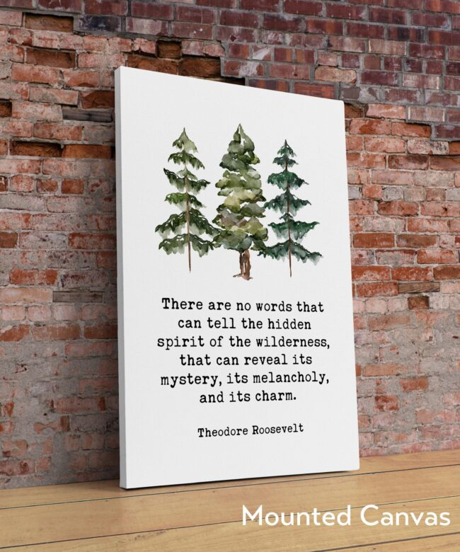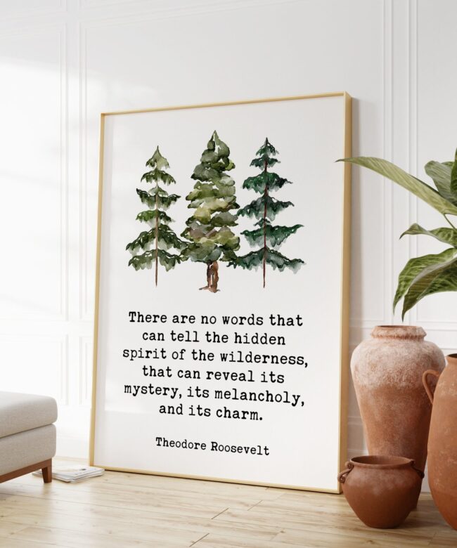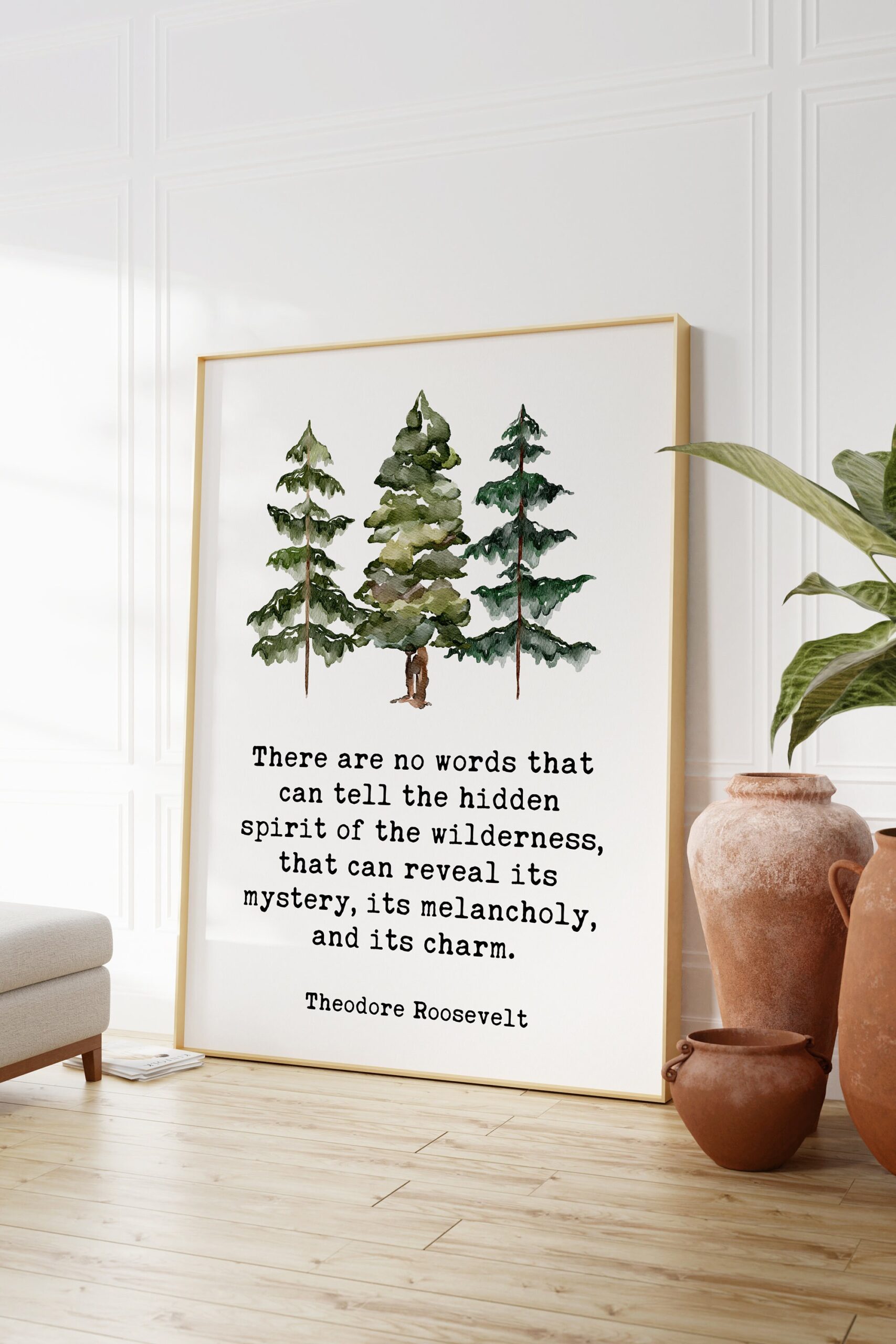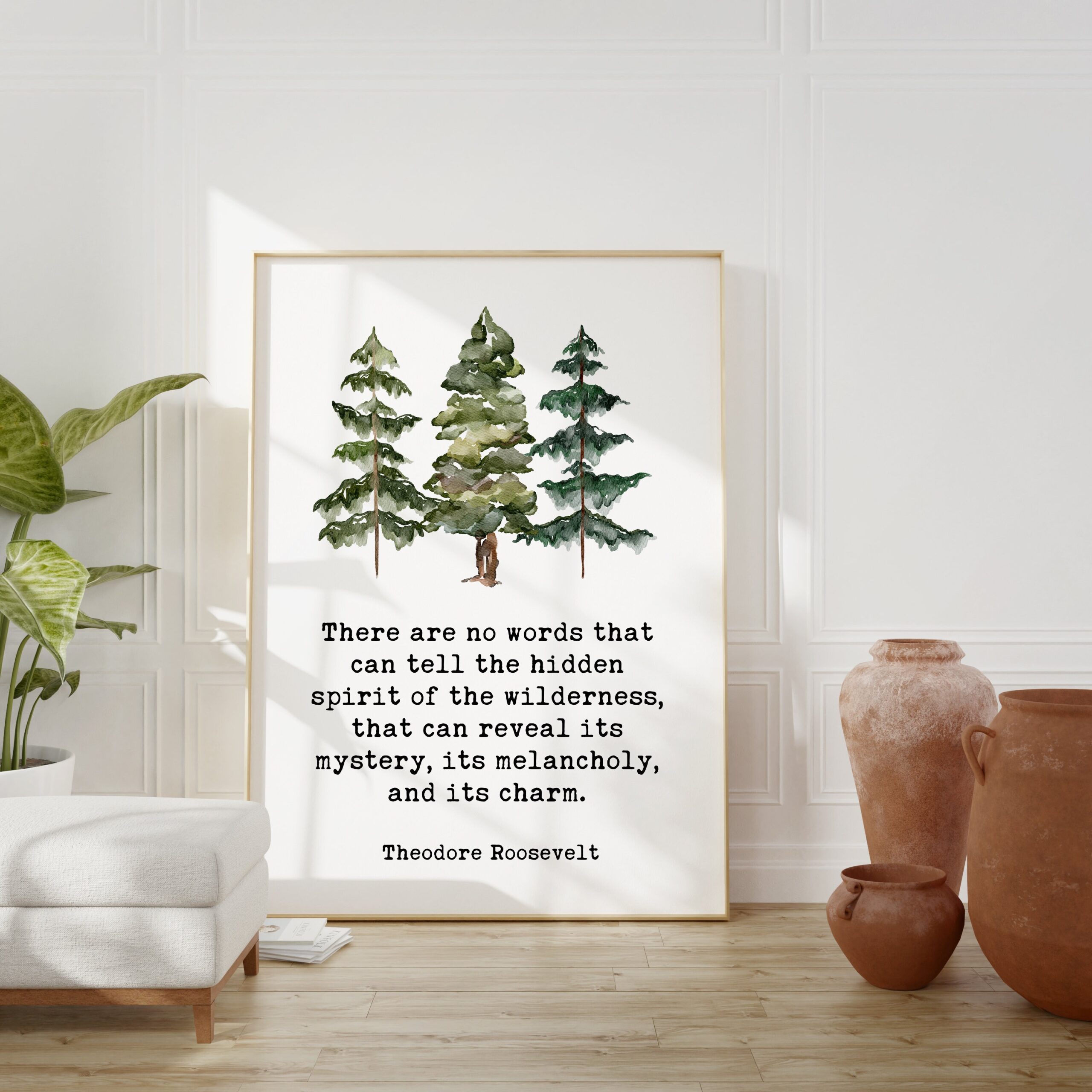 Capture the essence of the wilderness with our Theodore Roosevelt Quote Typography Art Print: “There are no words that can tell the hidden spirit of the wilderness, that can reveal its mystery, its melancholy, and its charm.”