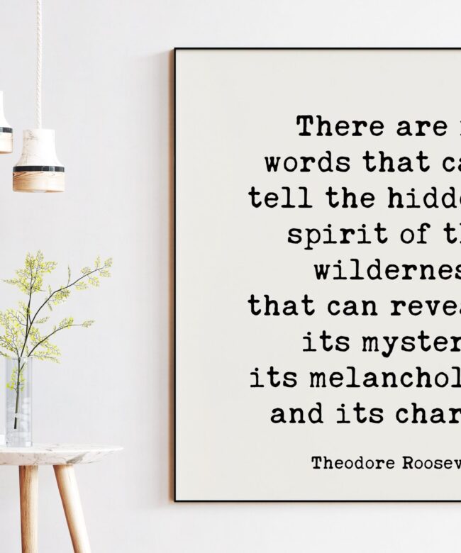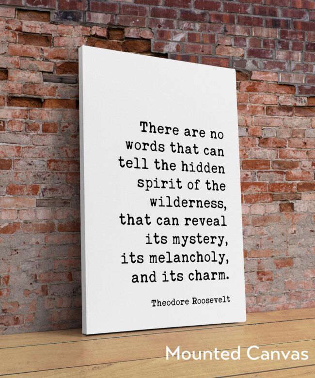Capture the essence of the wilderness with our Theodore Roosevelt Quote Typography Art Print: “There are no words that can tell the hidden spirit of the wilderness, that can reveal its mystery, its melancholy, and its charm.”