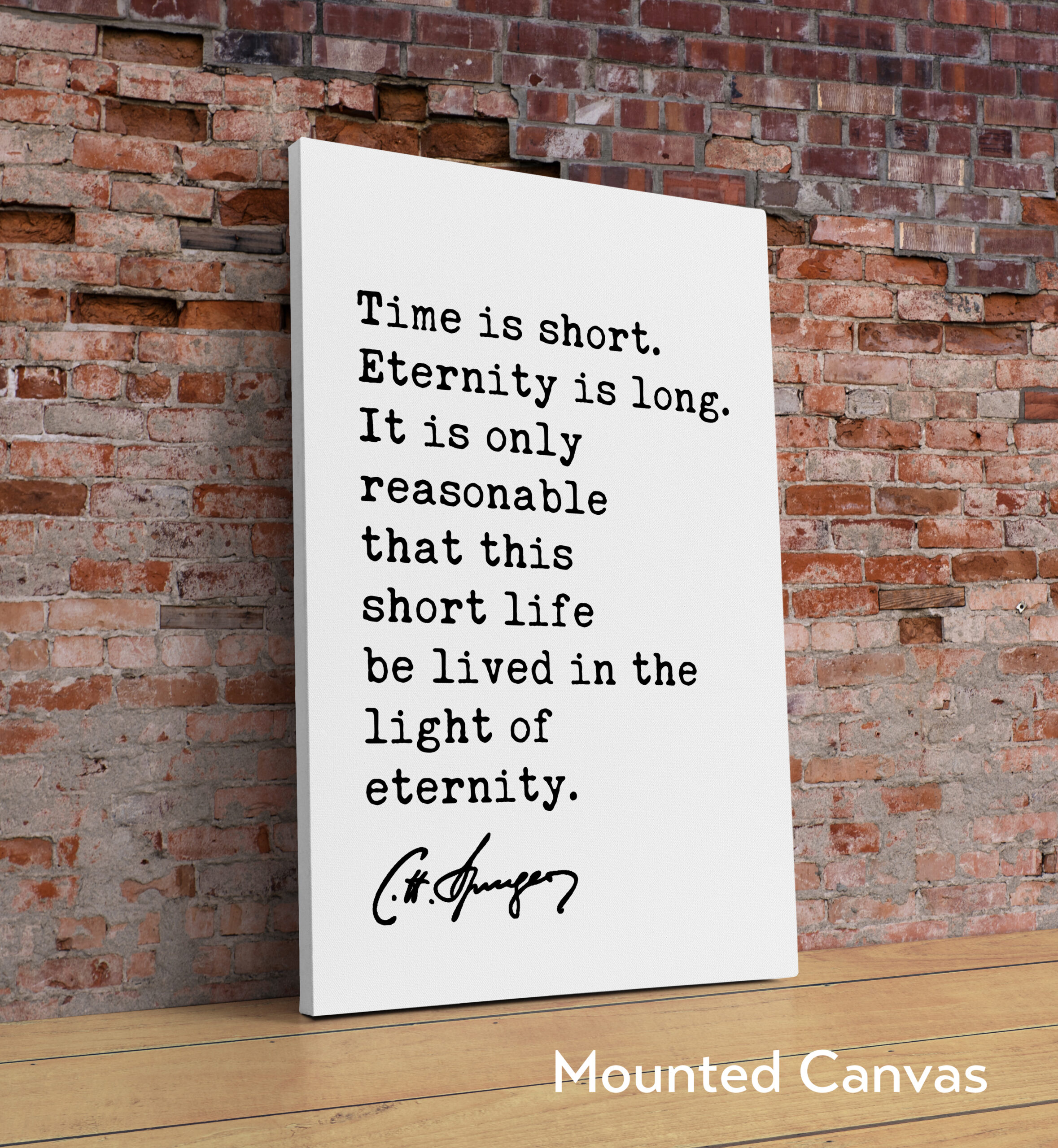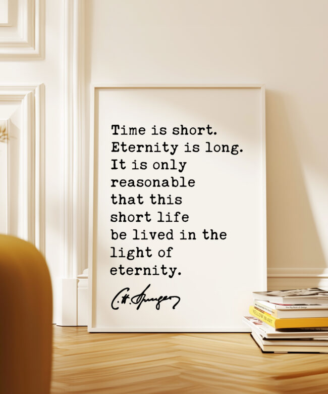Embrace the timeless wisdom of Charles Spurgeon with this thought-provoking typography art print featuring the quote, “Time is short. Eternity is long. It is only reasonable that this short life be lived in the light of eternity.”