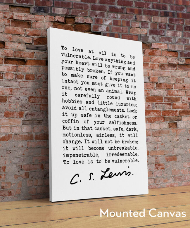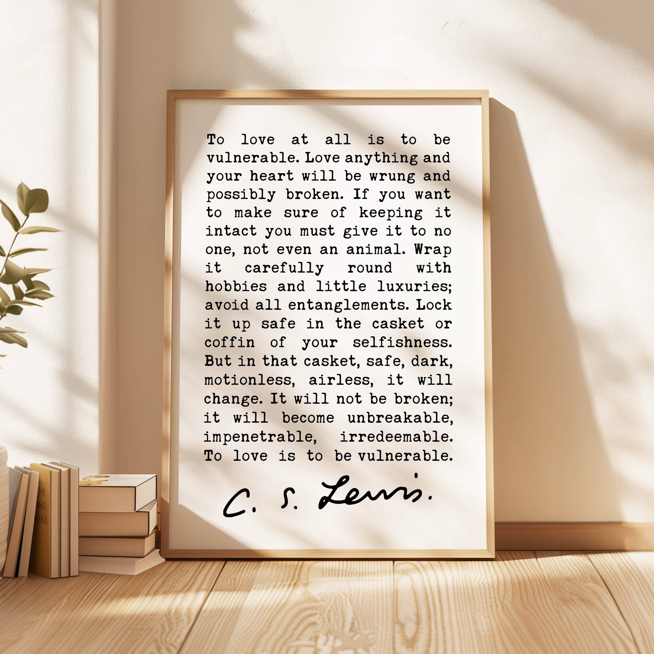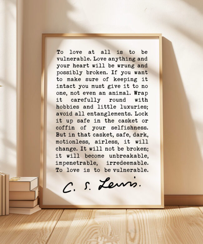 To love at all is to be vulnerable. Love anything and your heart will be wrung and possibly broken. If you want to make sure of keeping it intact you must give it to no one, not even an animal. Wrap it carefully round with hobbies and little luxuries; avoid all entanglements. Lock it up safe in the casket or coffin of your selfishness. But in that casket, safe, dark, motionless, airless, it will change. It will not be broken; it will become unbreakable, impenetrable, irredeemable. To love is to be vulnerable.