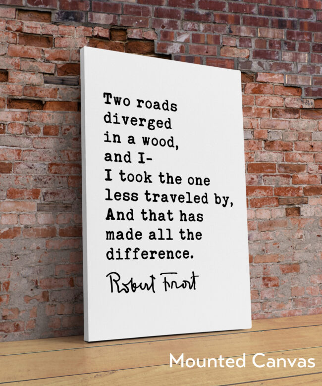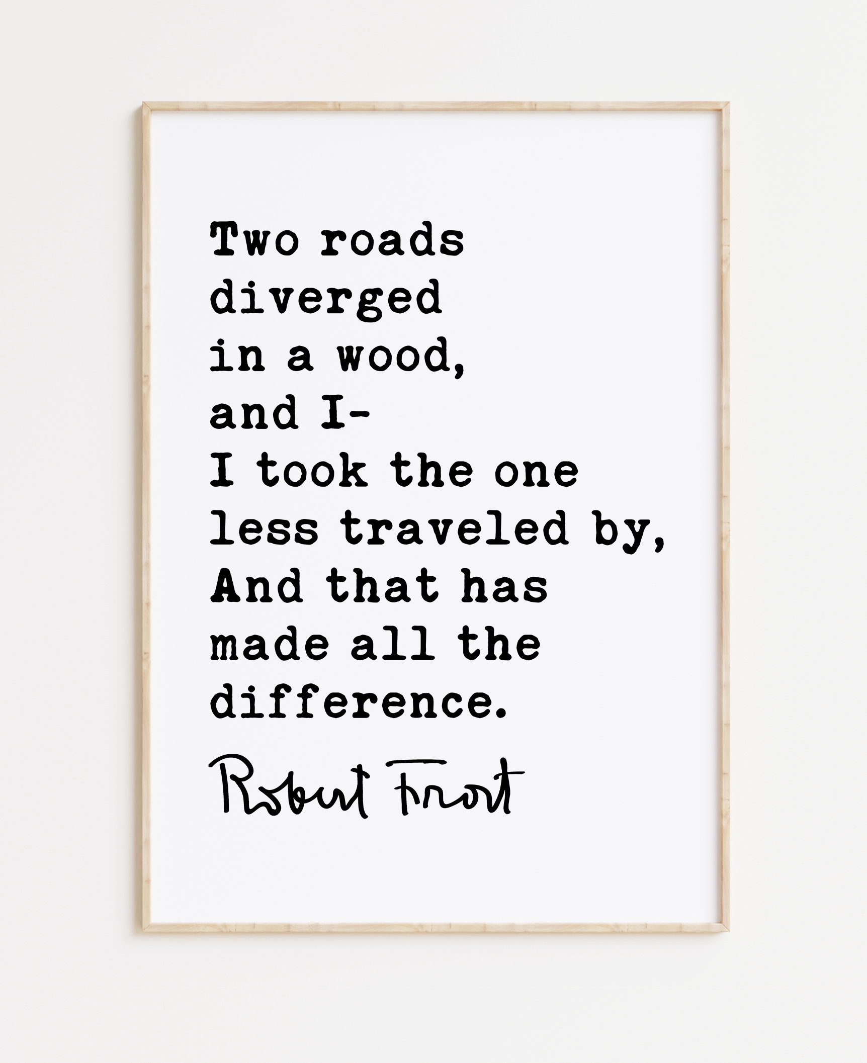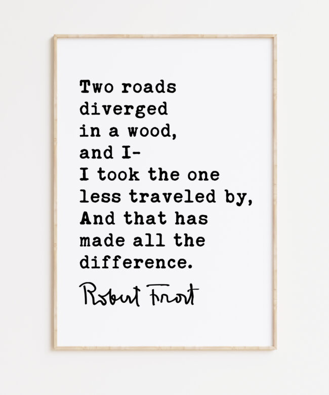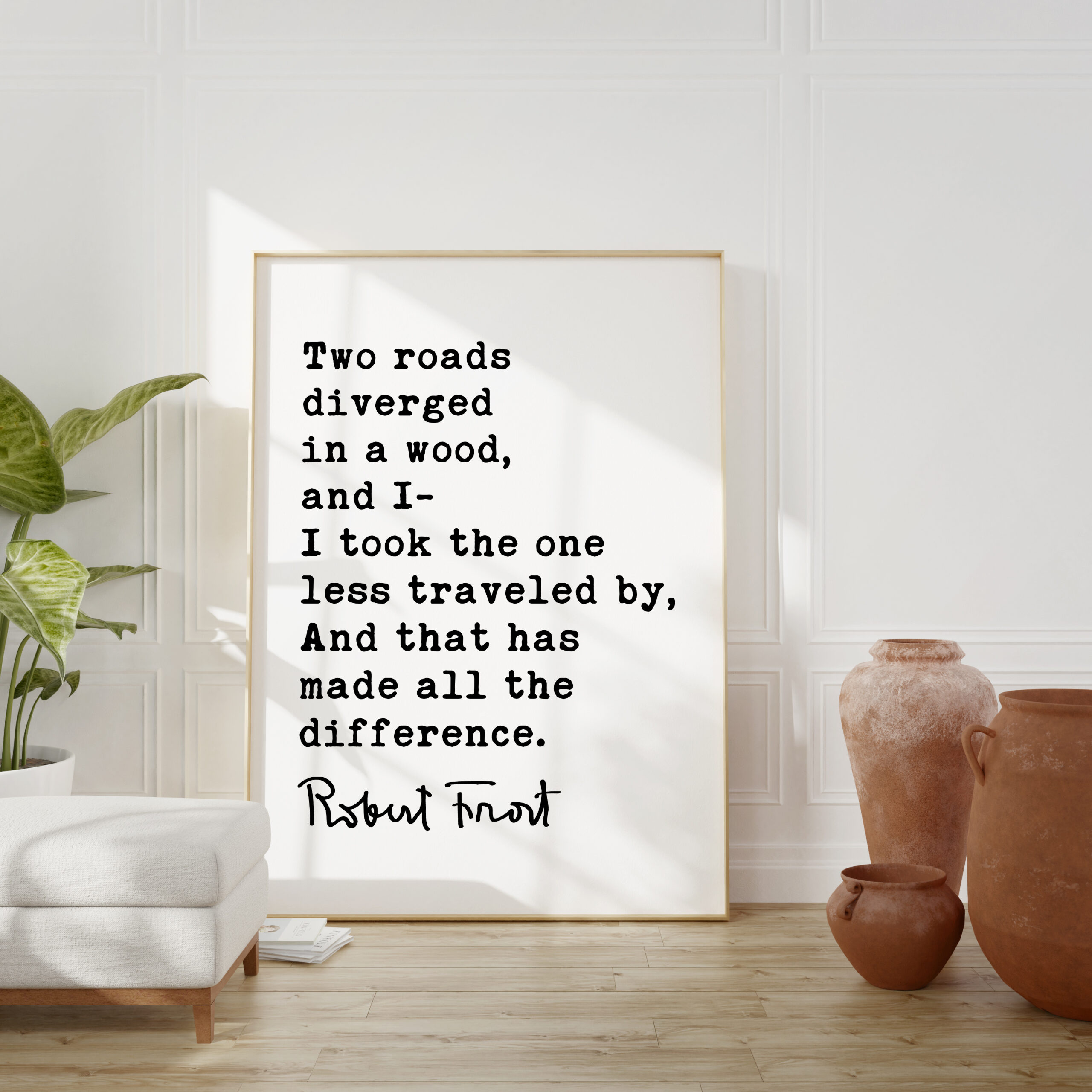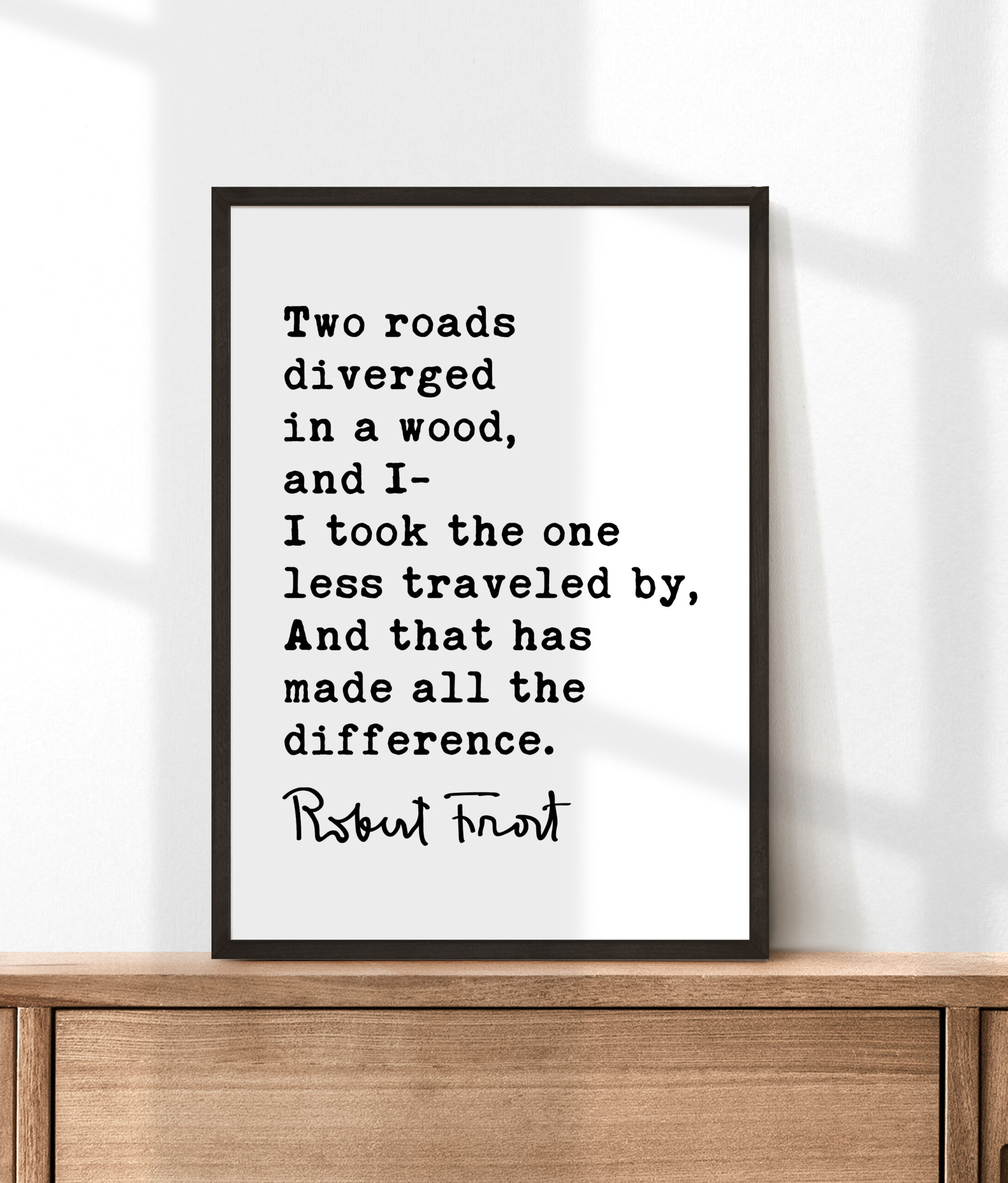 Embark on a visual journey with our Typography Art Print, featuring the timeless words of Robert Frost: “Two roads diverged in a wood, and I— I took the one less traveled by, And that has made all the difference.”