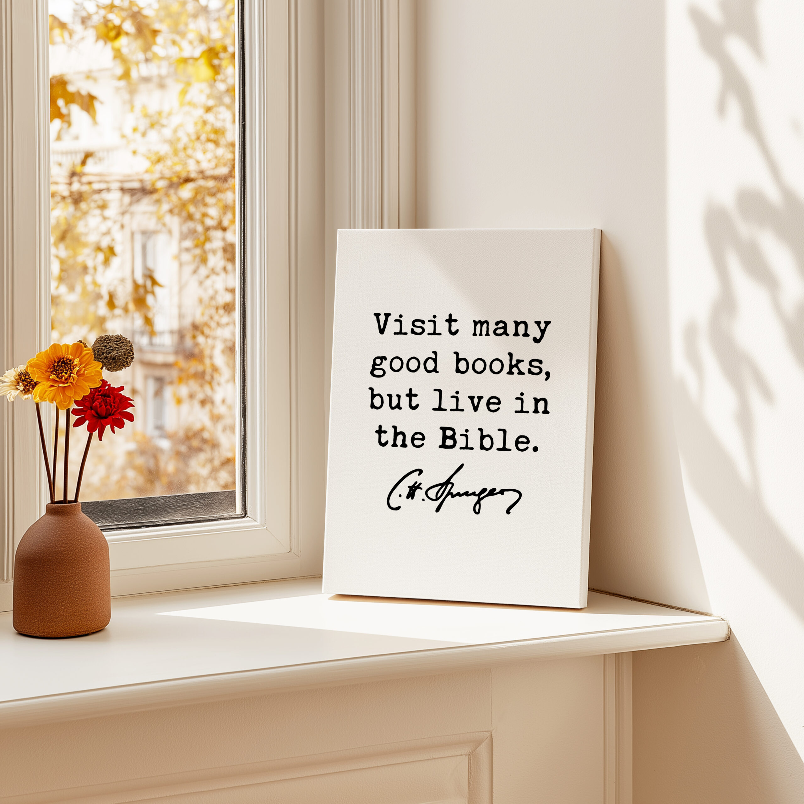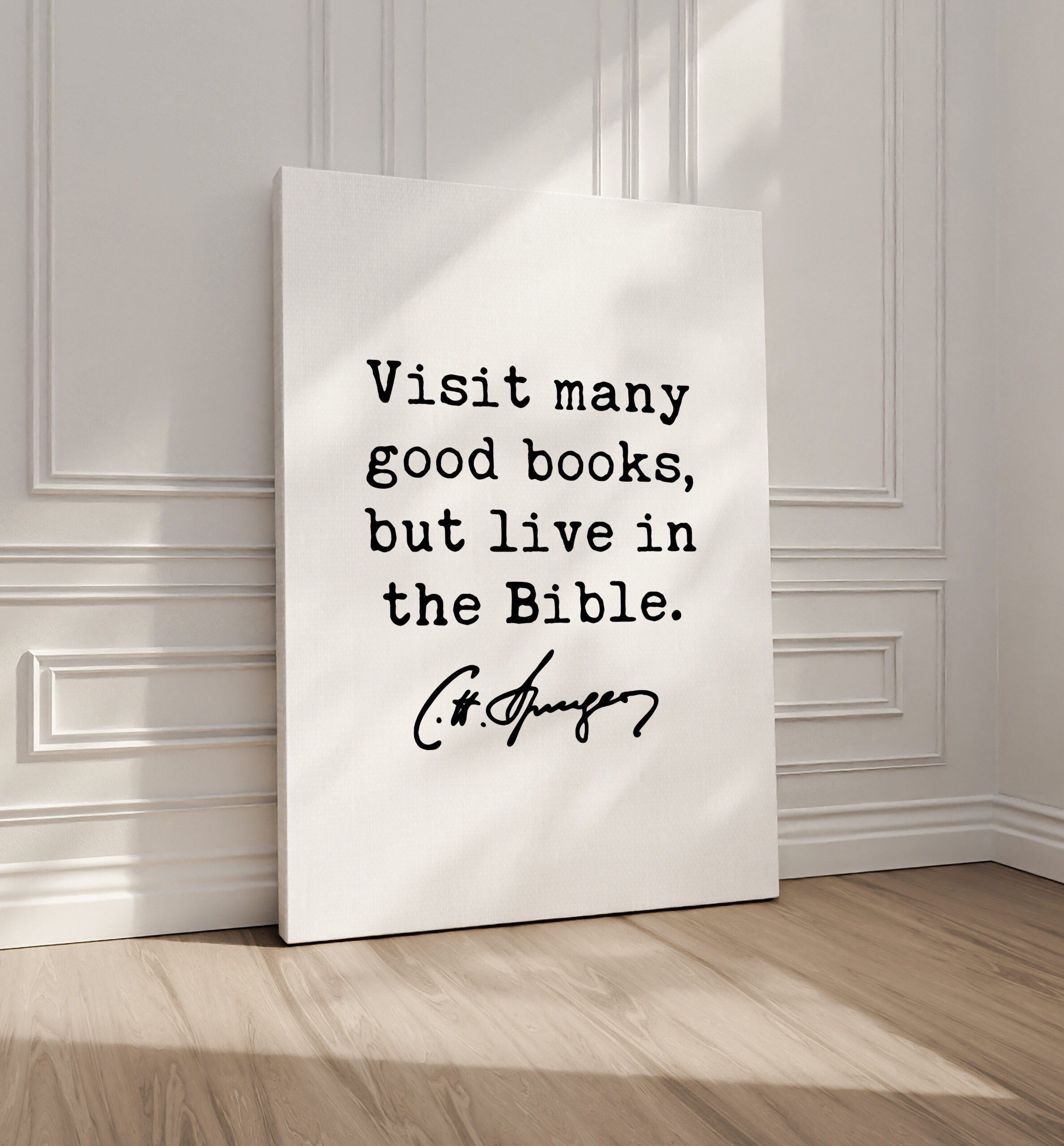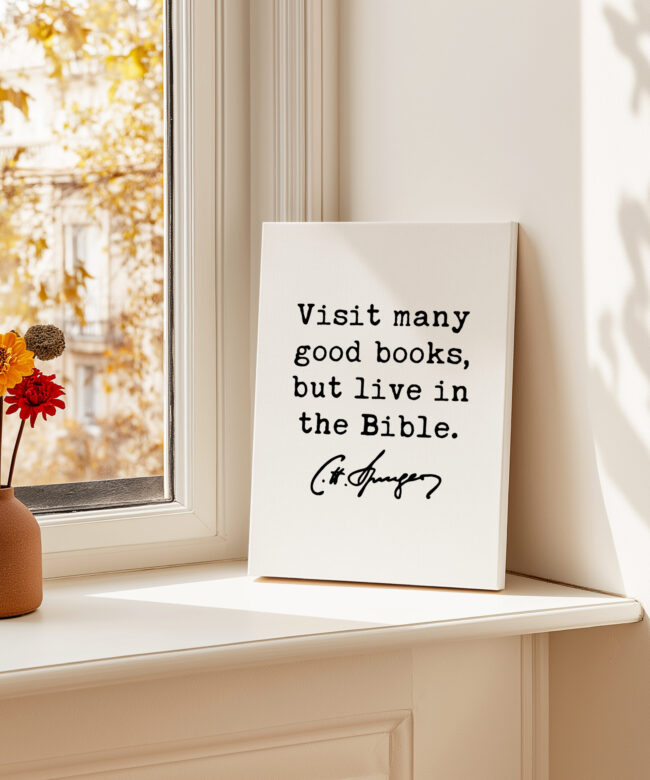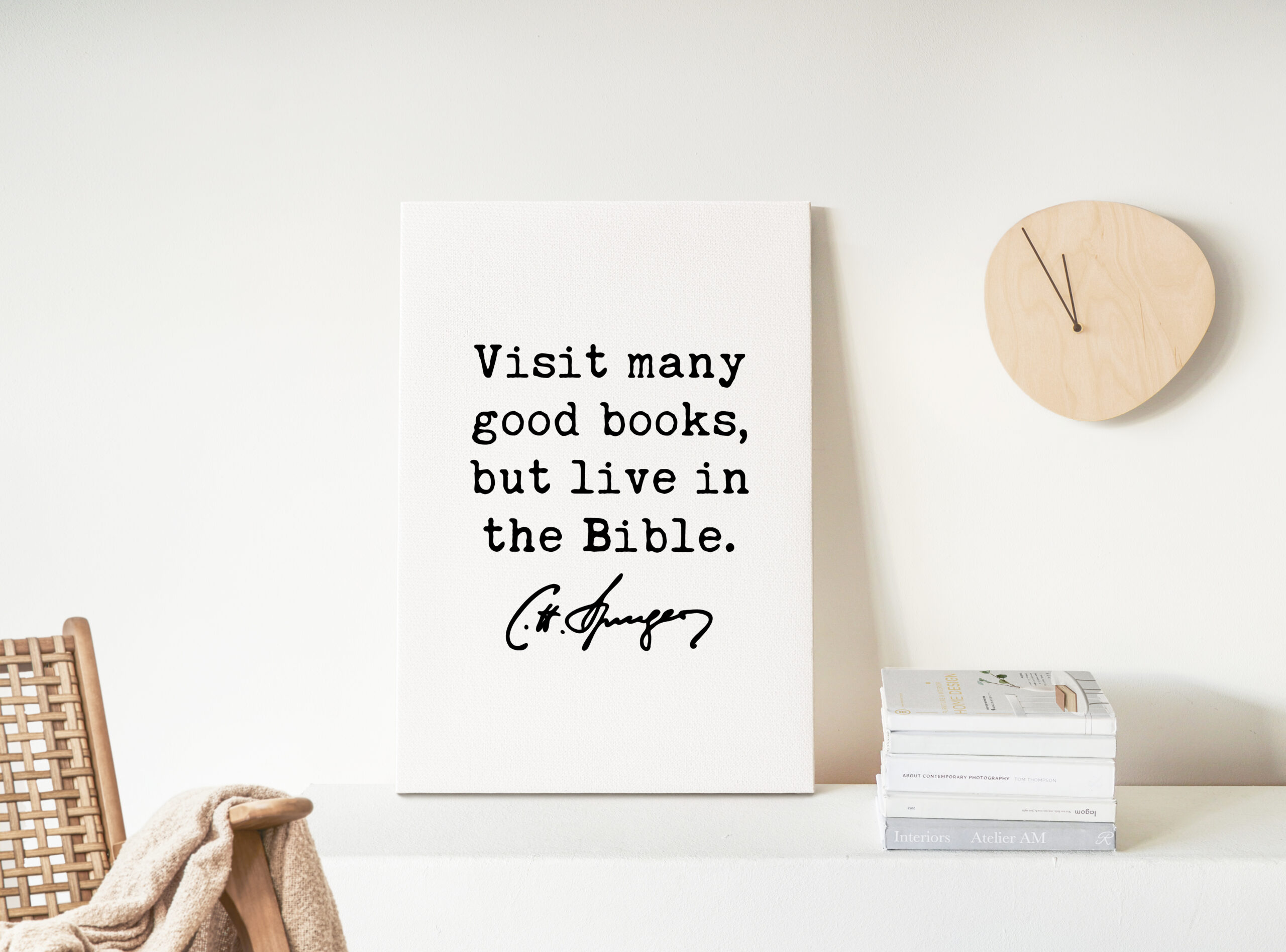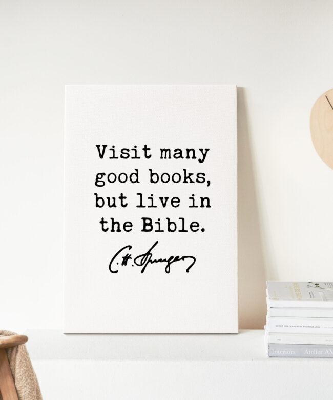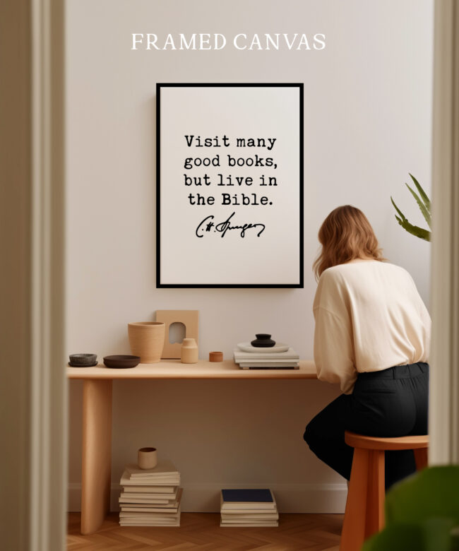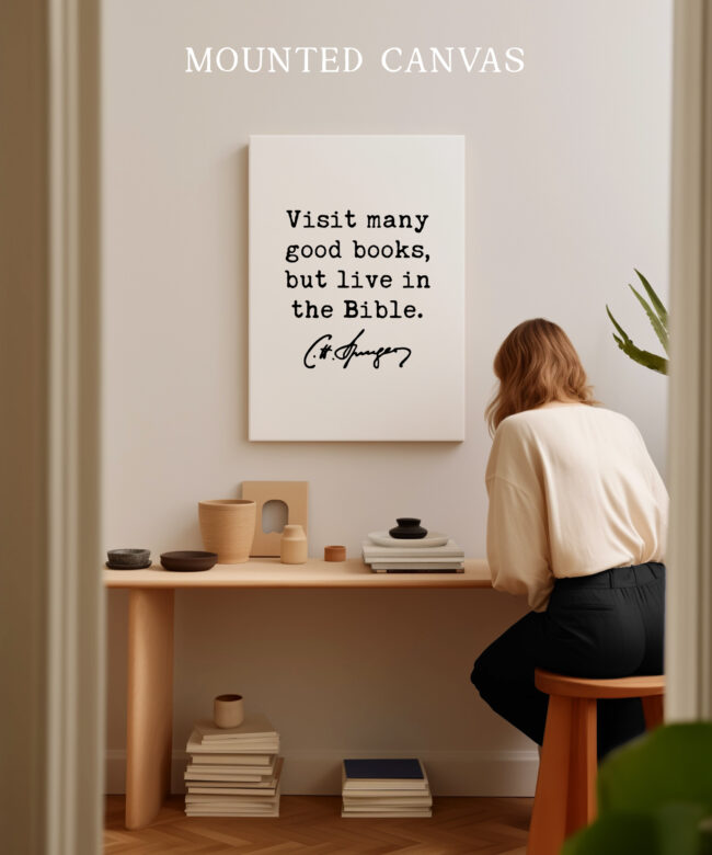 Embrace the wisdom of the ages with this thought-provoking typography art print. Featuring Charles Spurgeon’s timeless quote, “Visit many good books, but live in the Bible,” this canvas print serves as a reminder of the importance of grounding ourselves in spiritual guidance. Available in both mounted and framed canvas options, this piece will add an inspirational touch to your home or study, perfect for those who seek to nurture their faith through daily reflection.