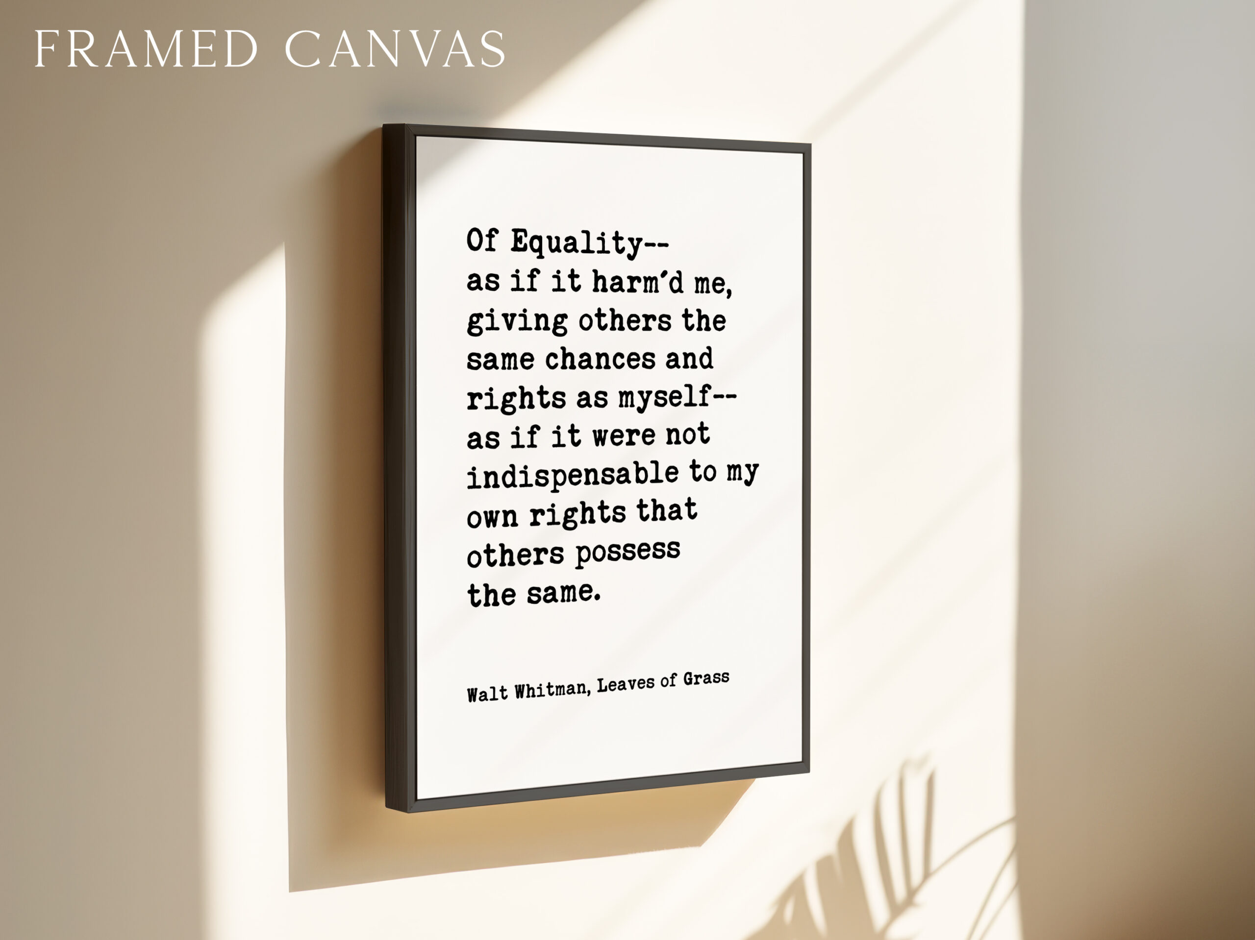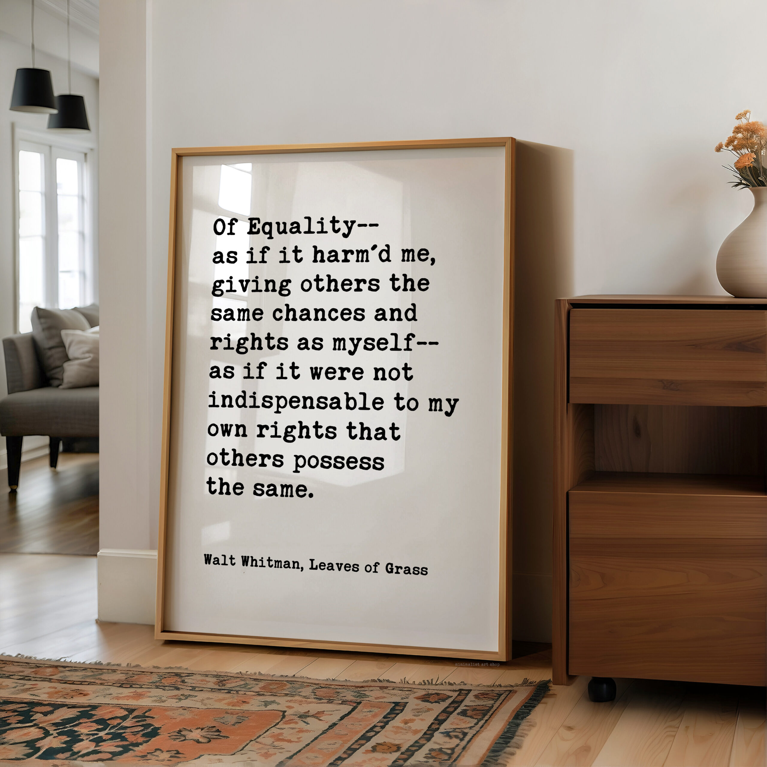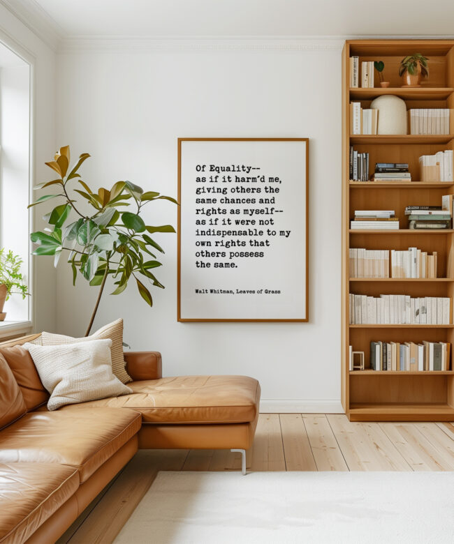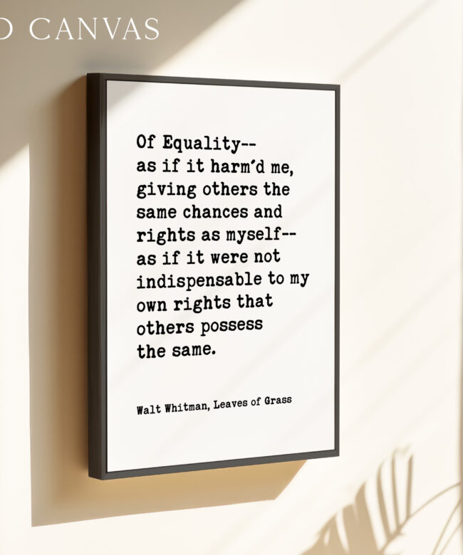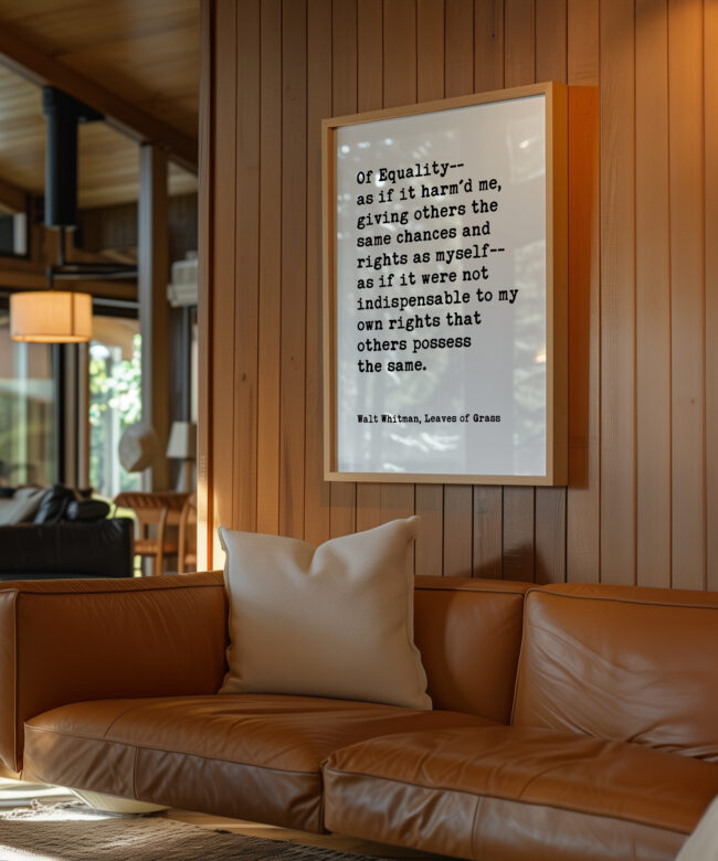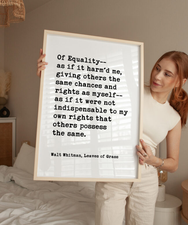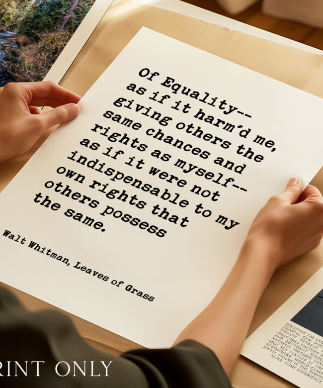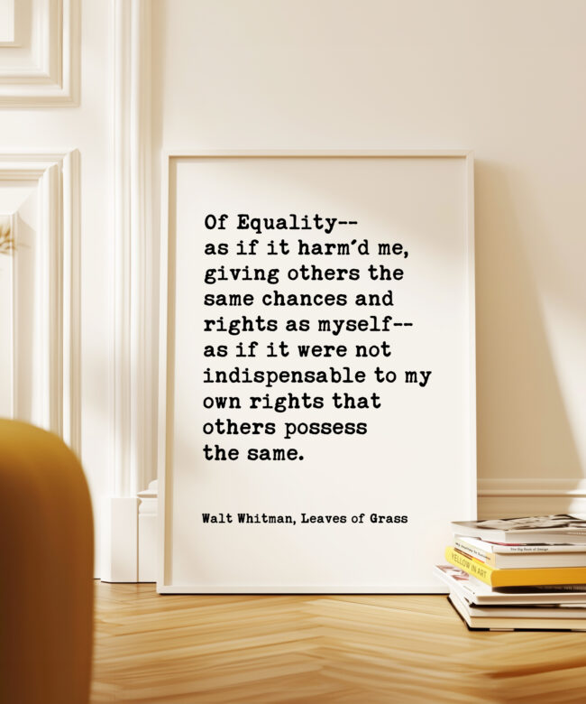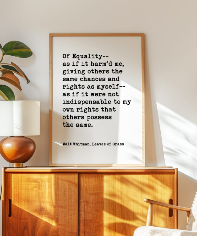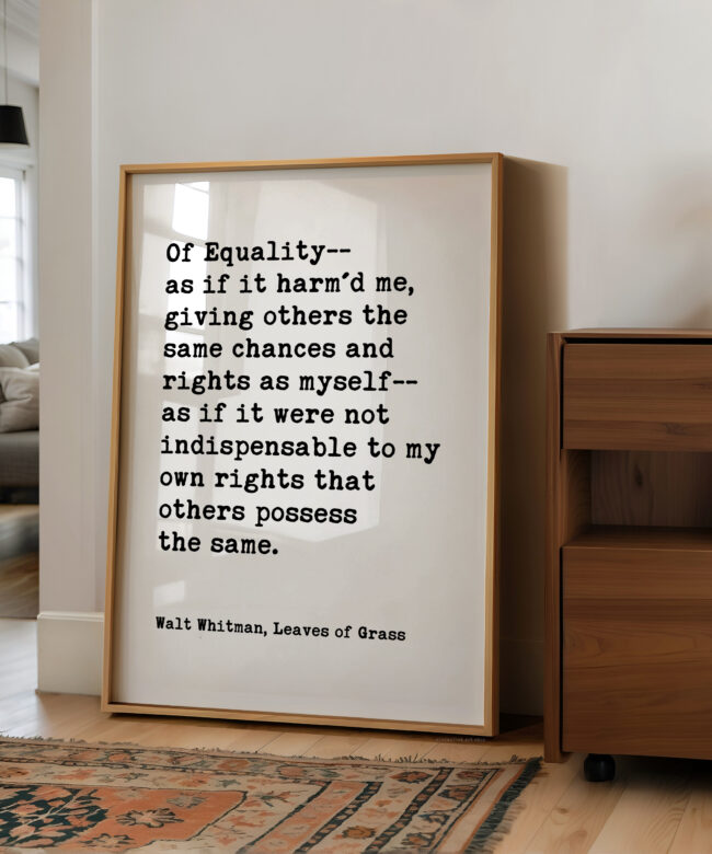 Celebrate equality and human dignity with this powerful Walt Whitman quote from Leaves of Grass. Designed in a clean, minimalist typography style, this print brings historic literary wisdom into modern spaces.