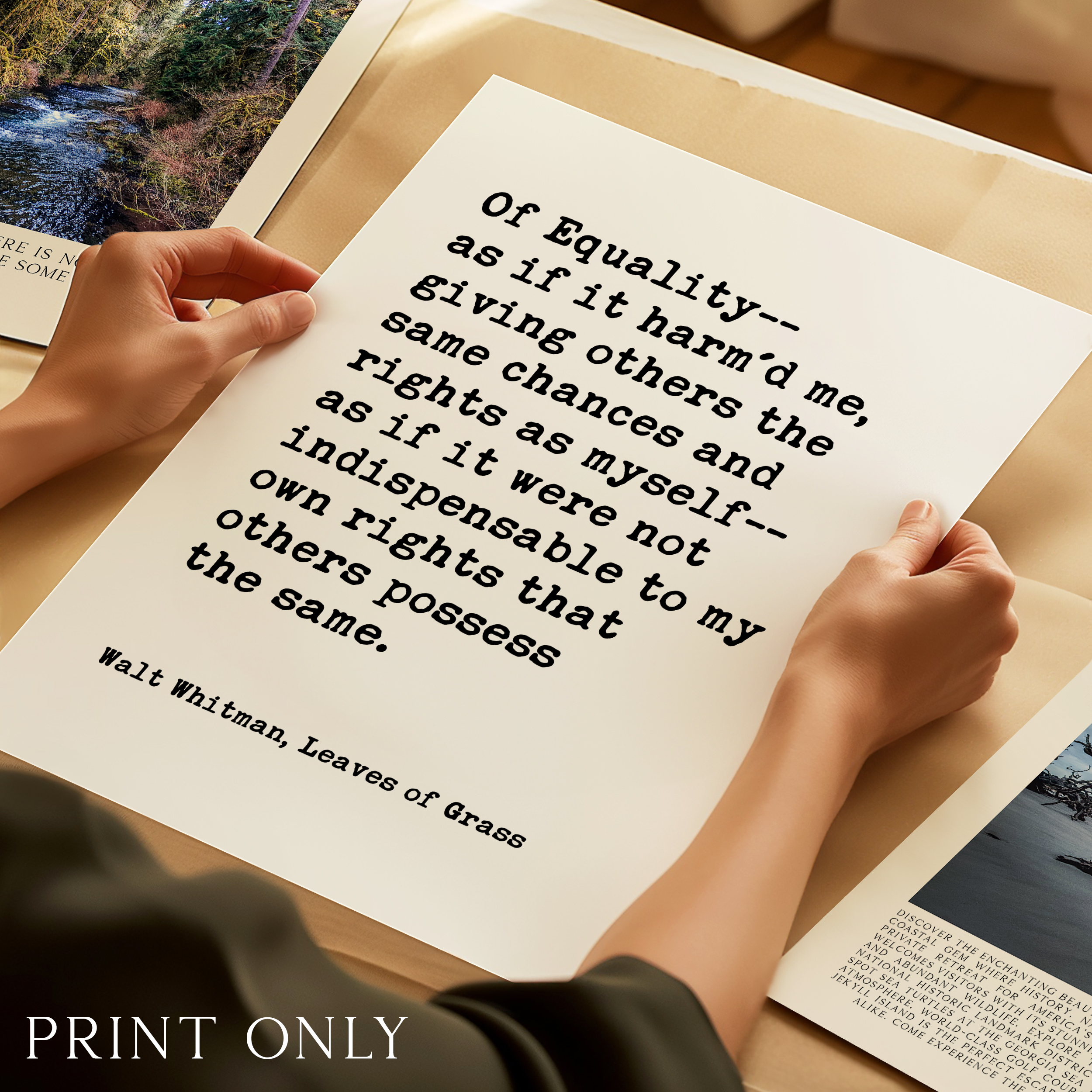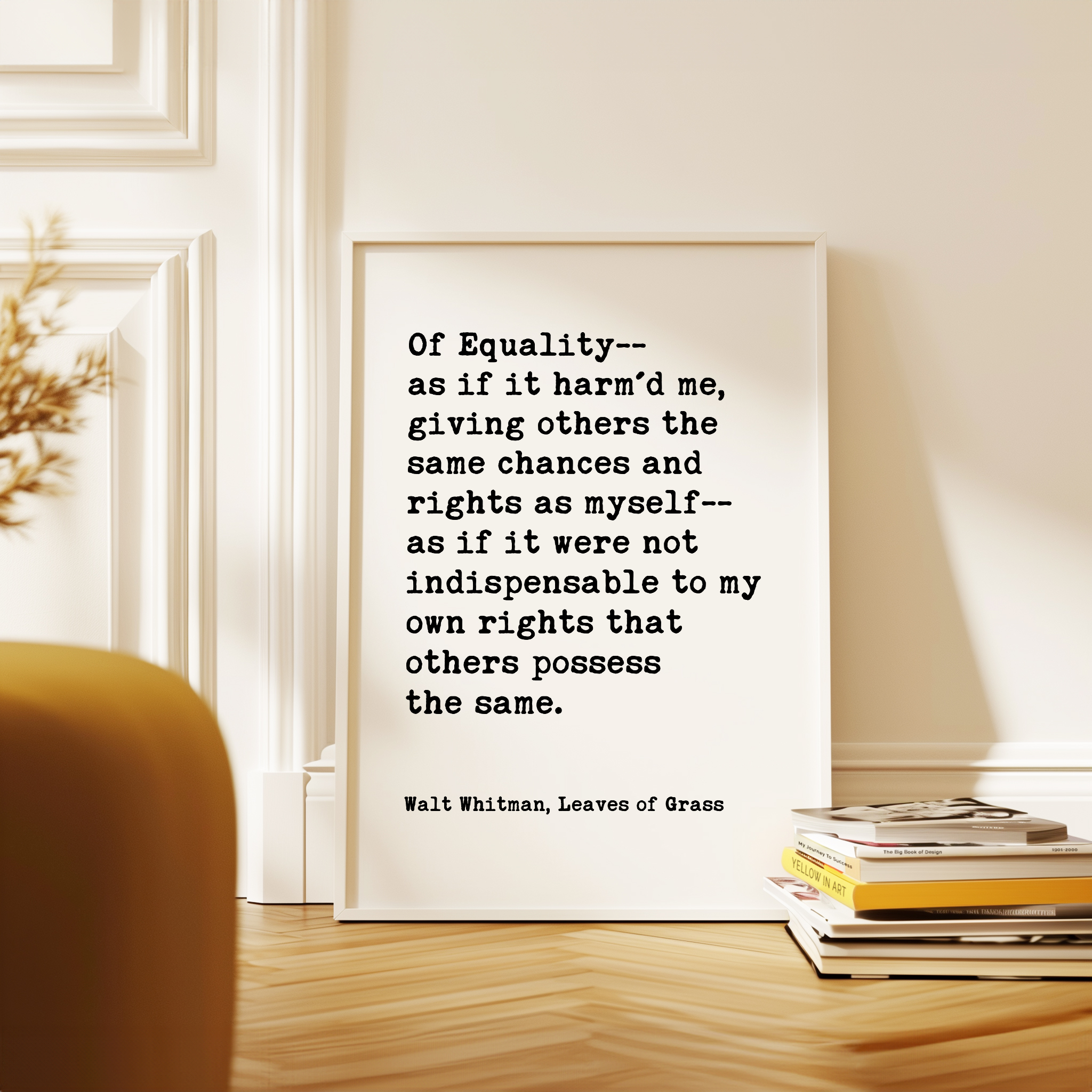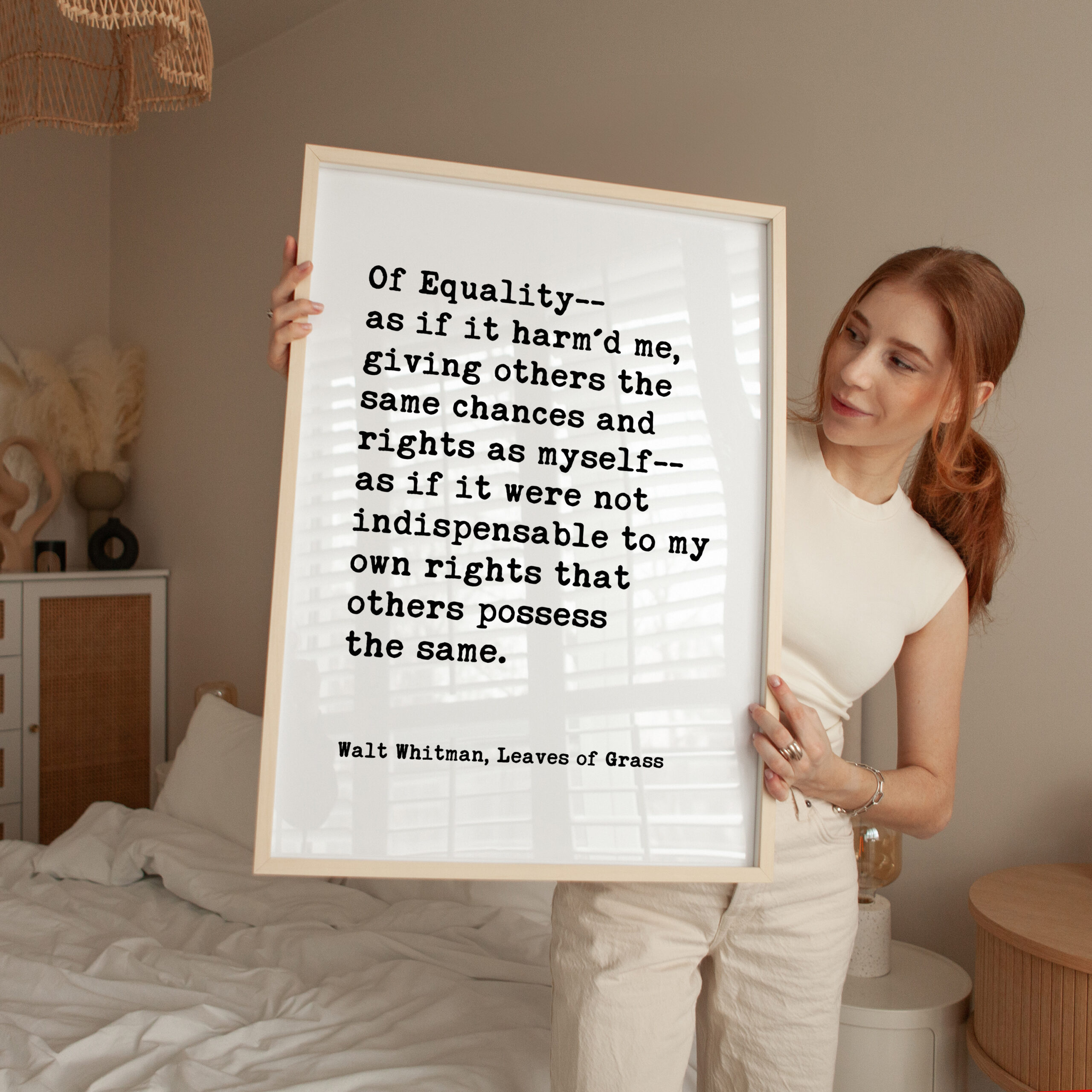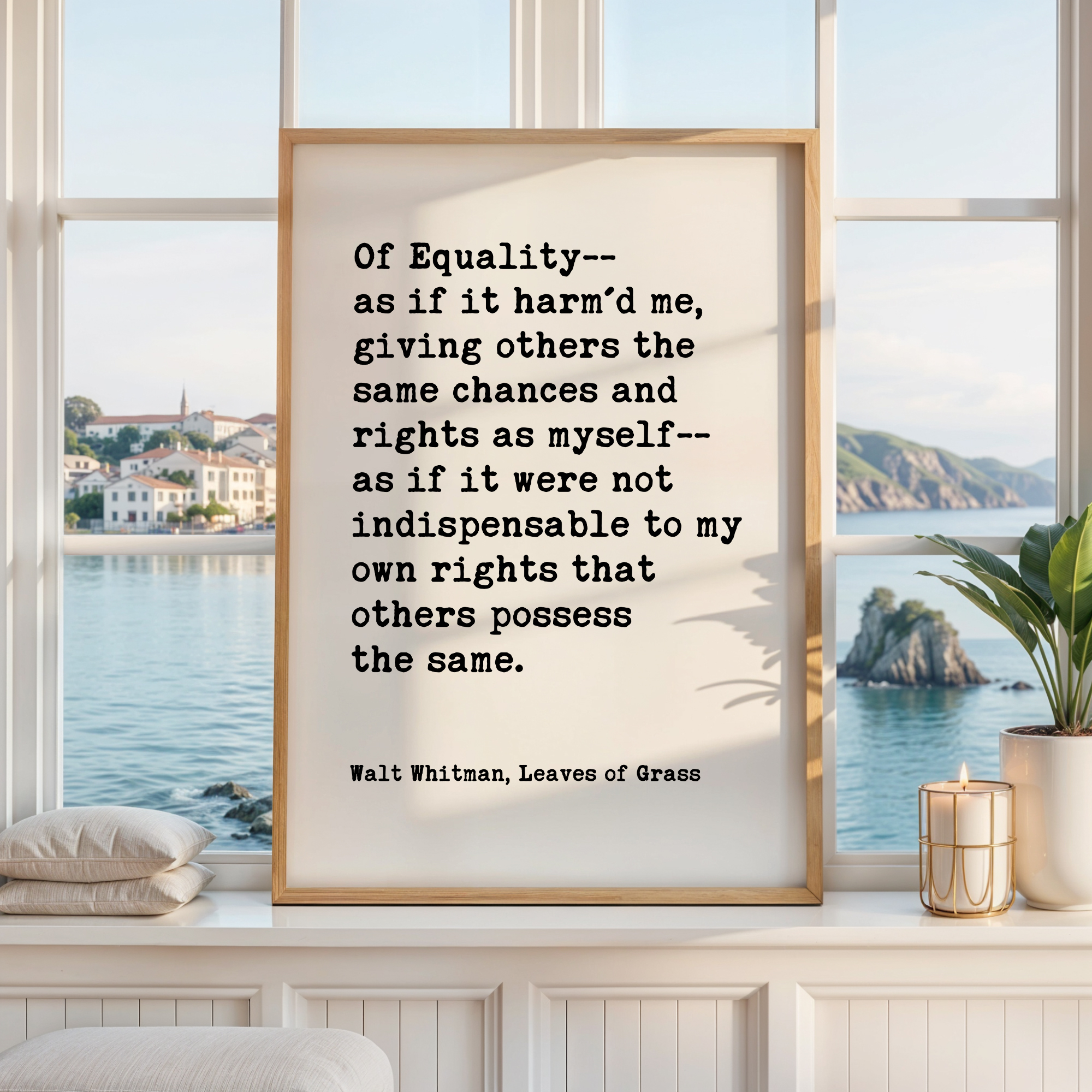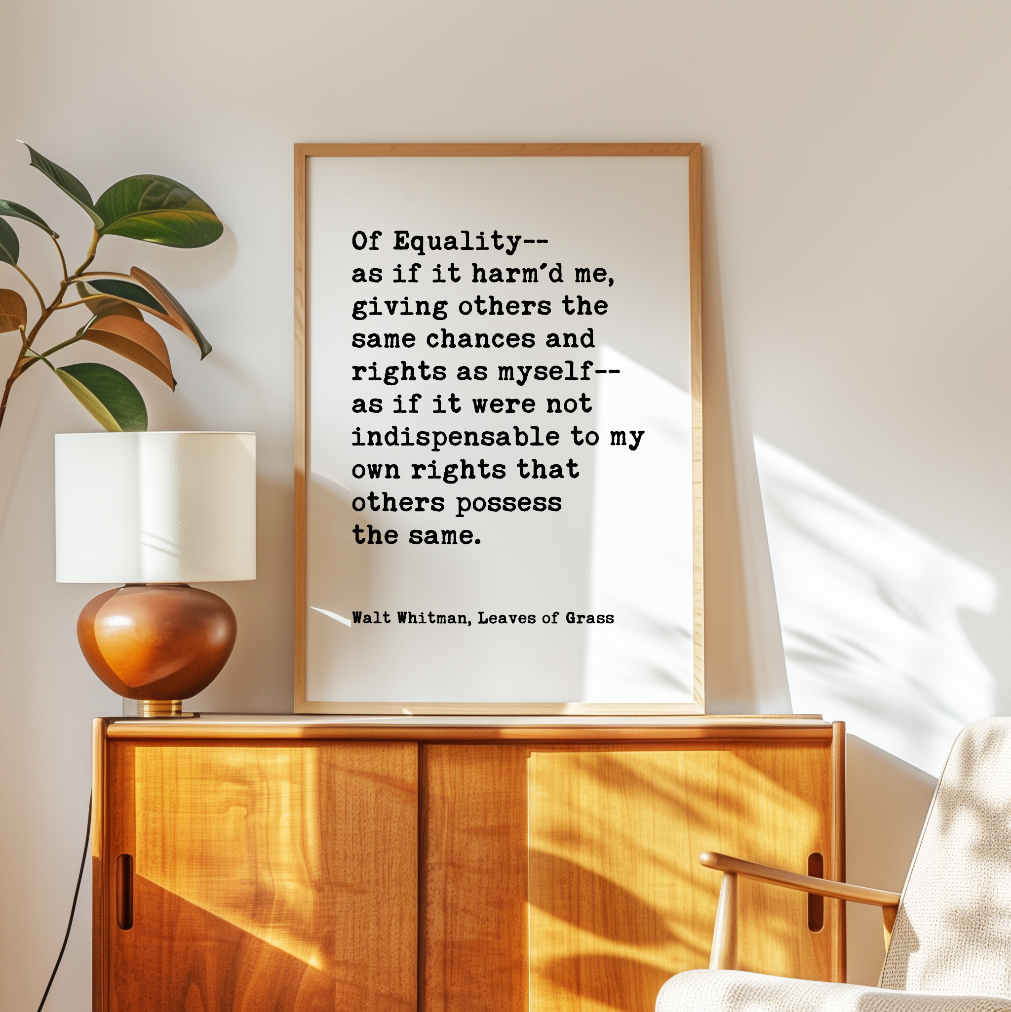 Celebrate equality and human dignity with this powerful Walt Whitman quote from Leaves of Grass. Designed in a clean, minimalist typography style, this print brings historic literary wisdom into modern spaces.