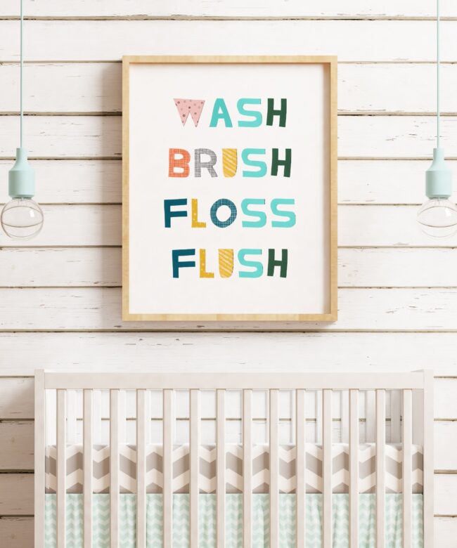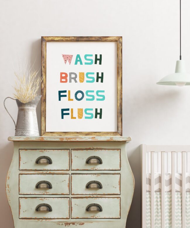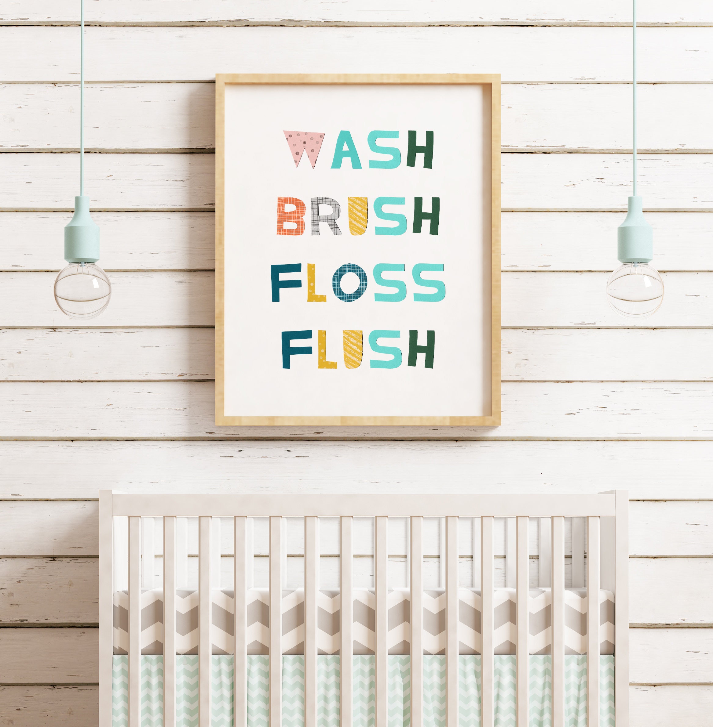Wash Brush Floss Flush Bathroom Wall Art, Childs Bathroom Art, Kids Bathroom Art, Children’s Bathroom Wall Art