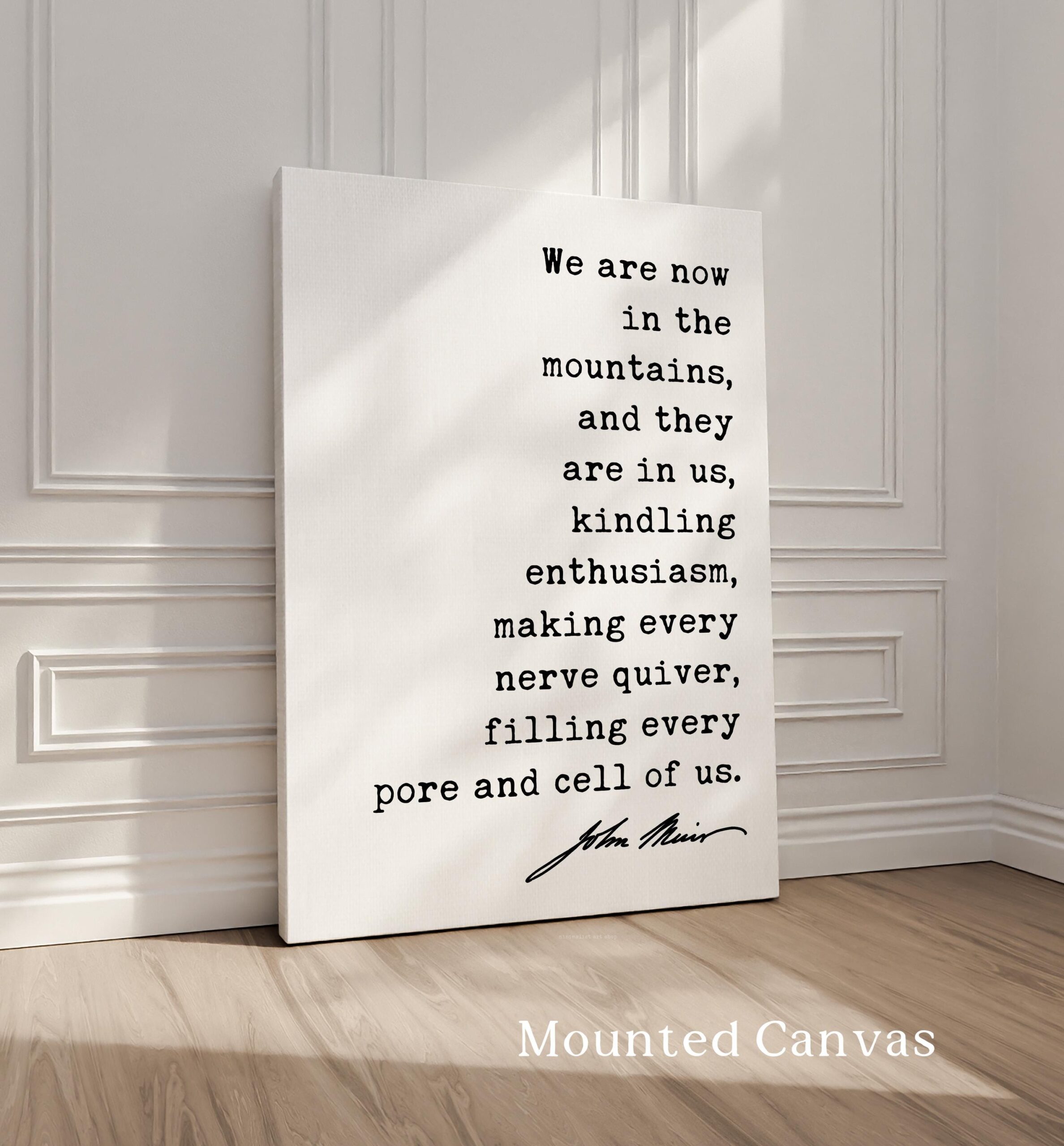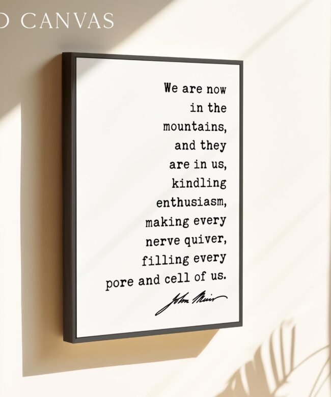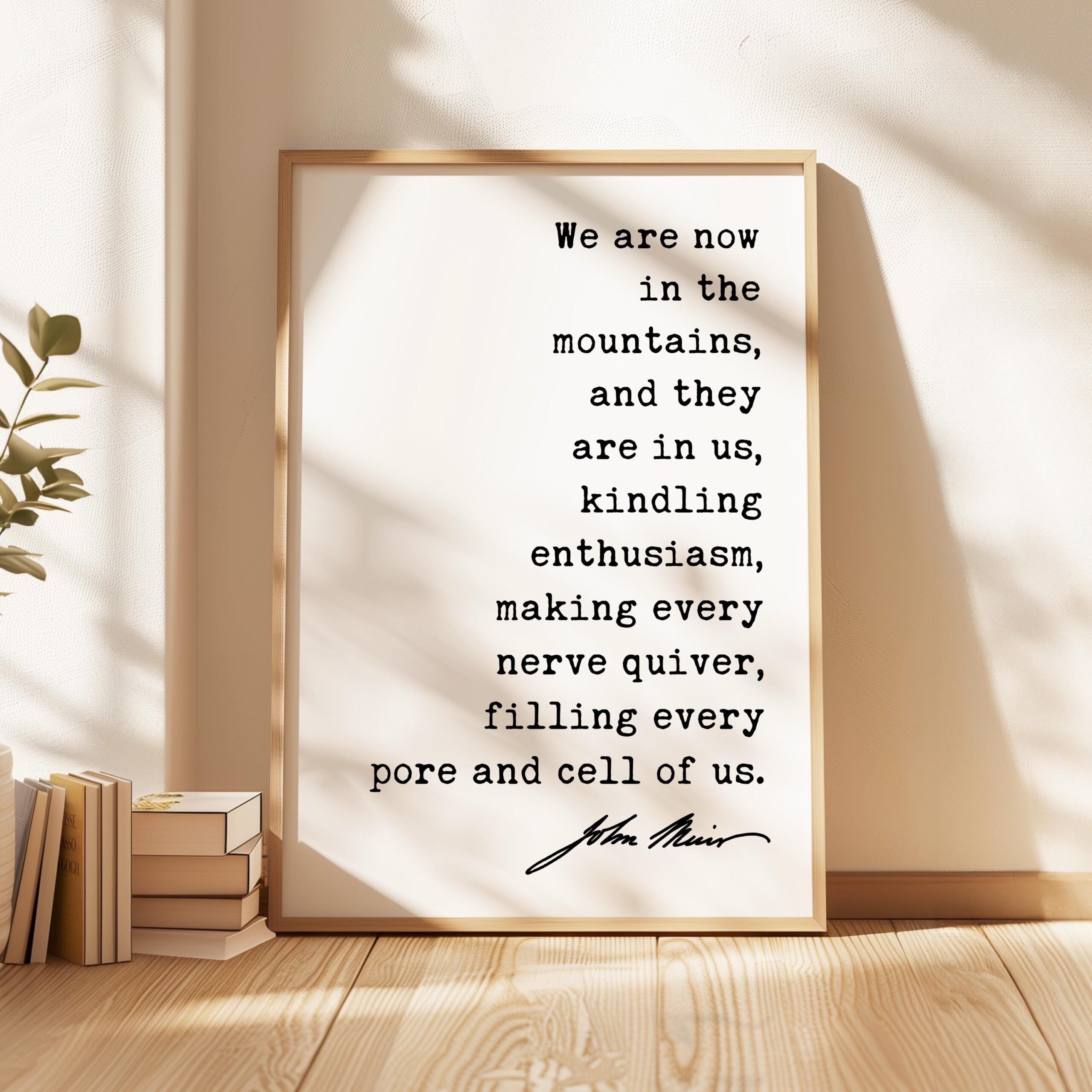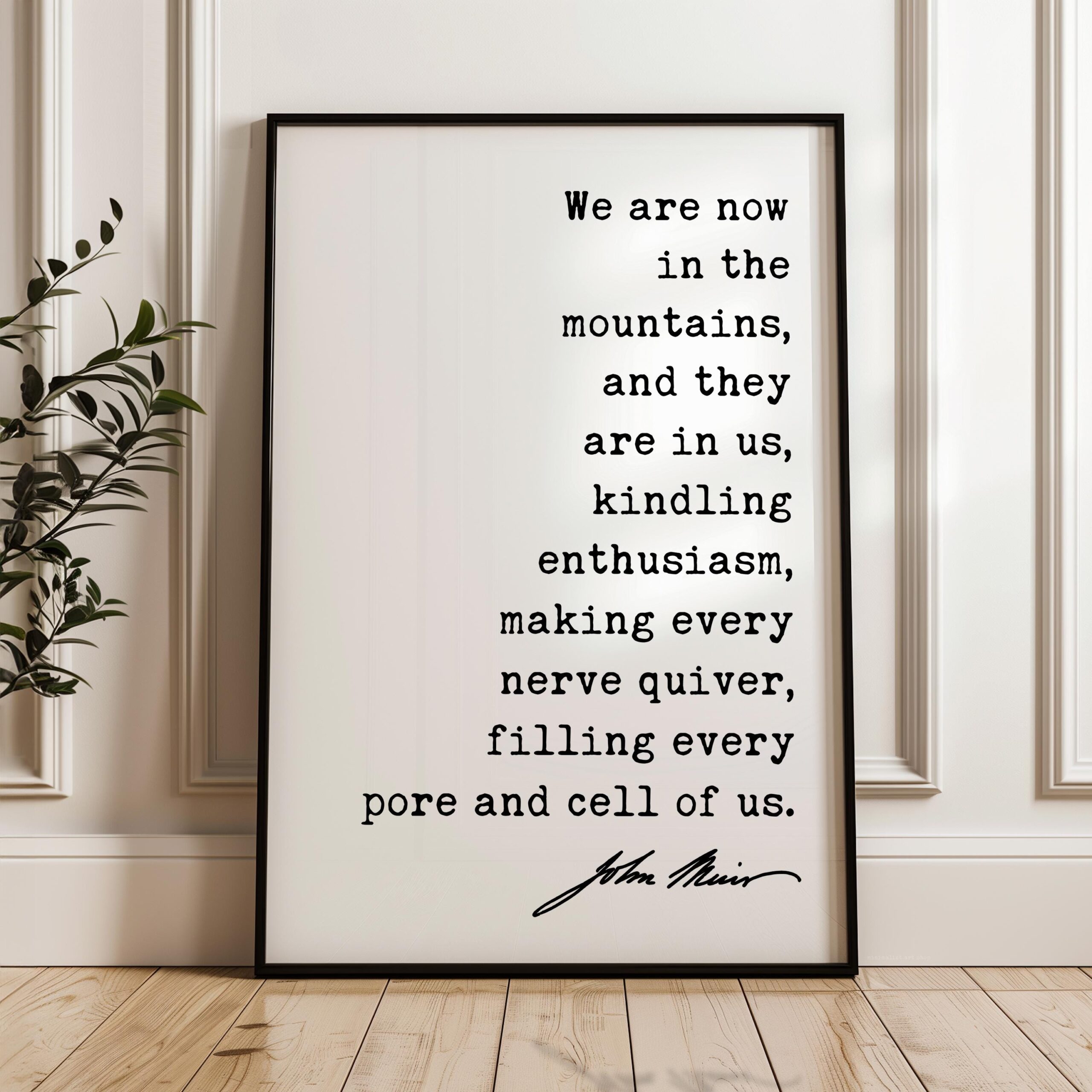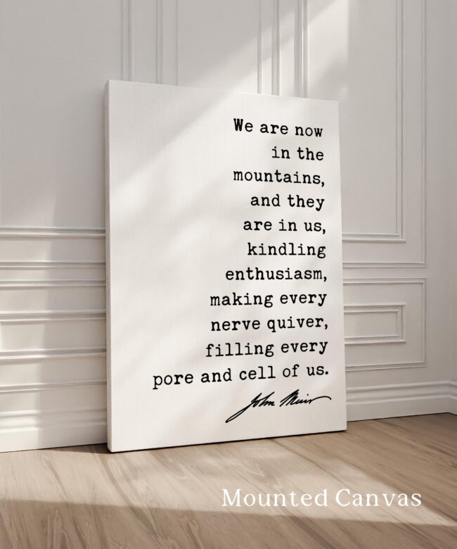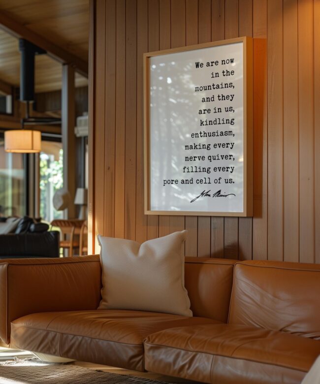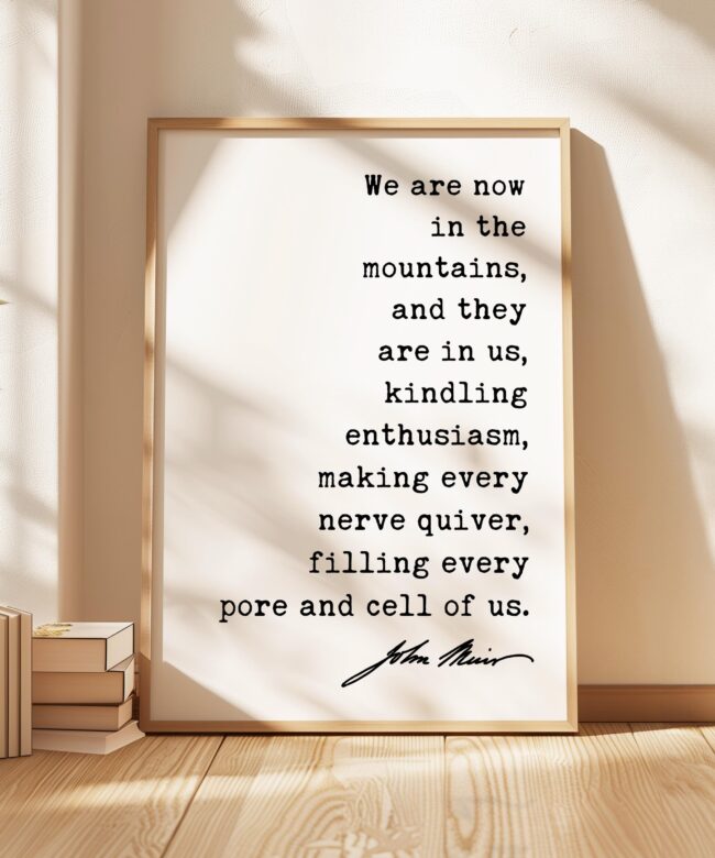 Bring the majesty of the wilderness into your home with this John Muir typography art print. Featuring a passage from My First Summer in the Sierra (1911), this quote captures the profound way nature awakens the soul: “We are now in the mountains, and they are in us, kindling enthusiasm, making every nerve quiver, filling every pore and cell of us.” A wonderful gift for hikers, mountain lovers, and anyone inspired by the beauty of God’s creation, this print adds meaning and serenity to any room.