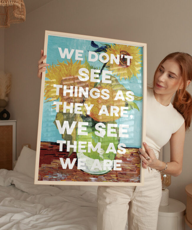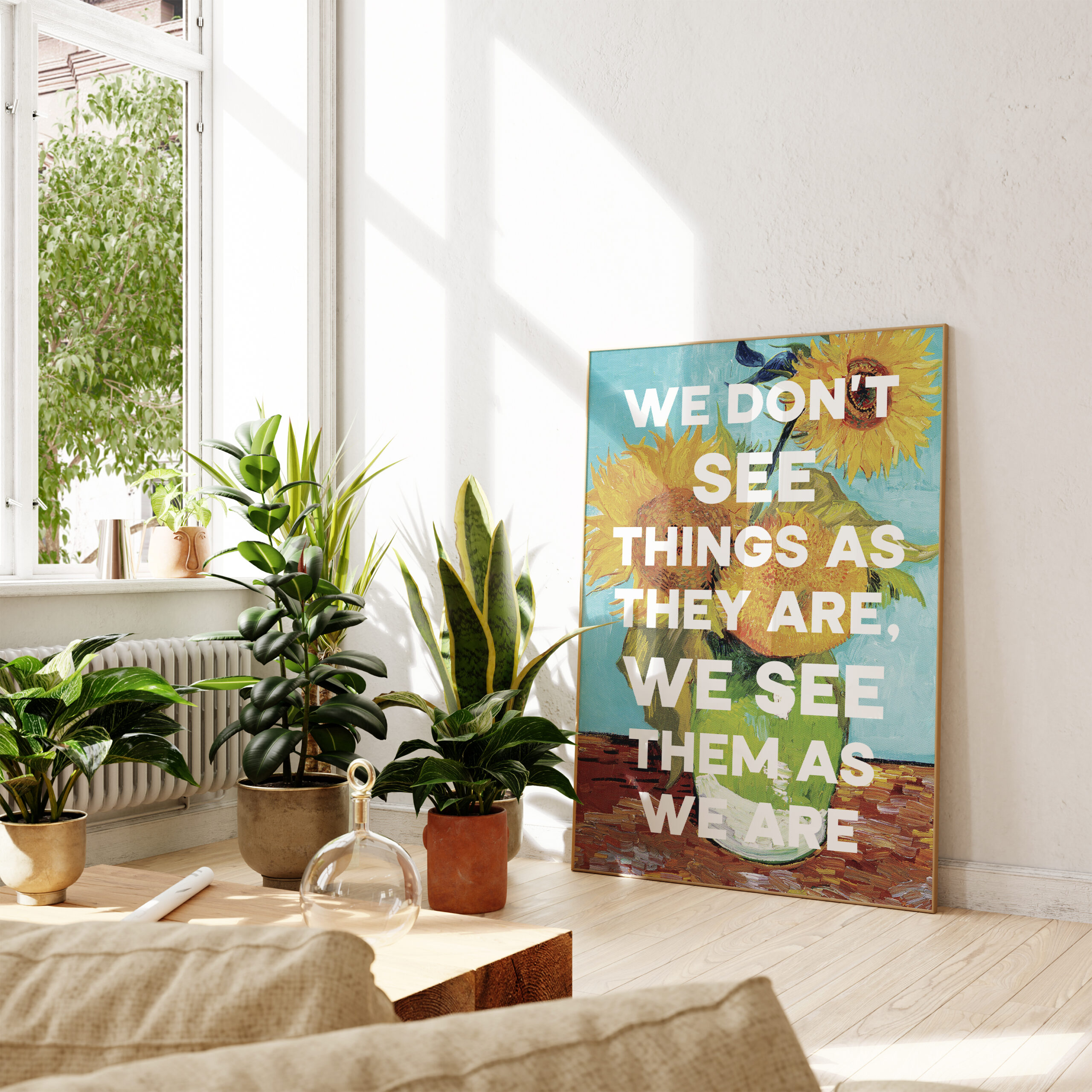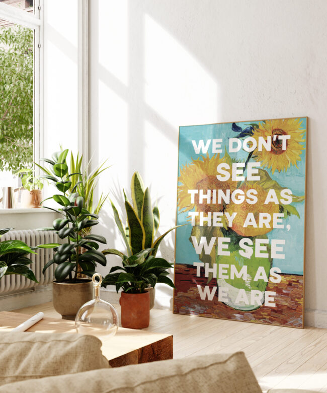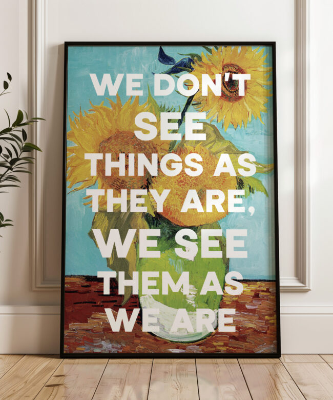 Vincent van Gogh’s vibrant Vase with Three Sunflowers stands as a testament to his unique perspective and bold artistic expression. Layered upon this masterpiece is the thought-provoking quote by Anaïs Nin: