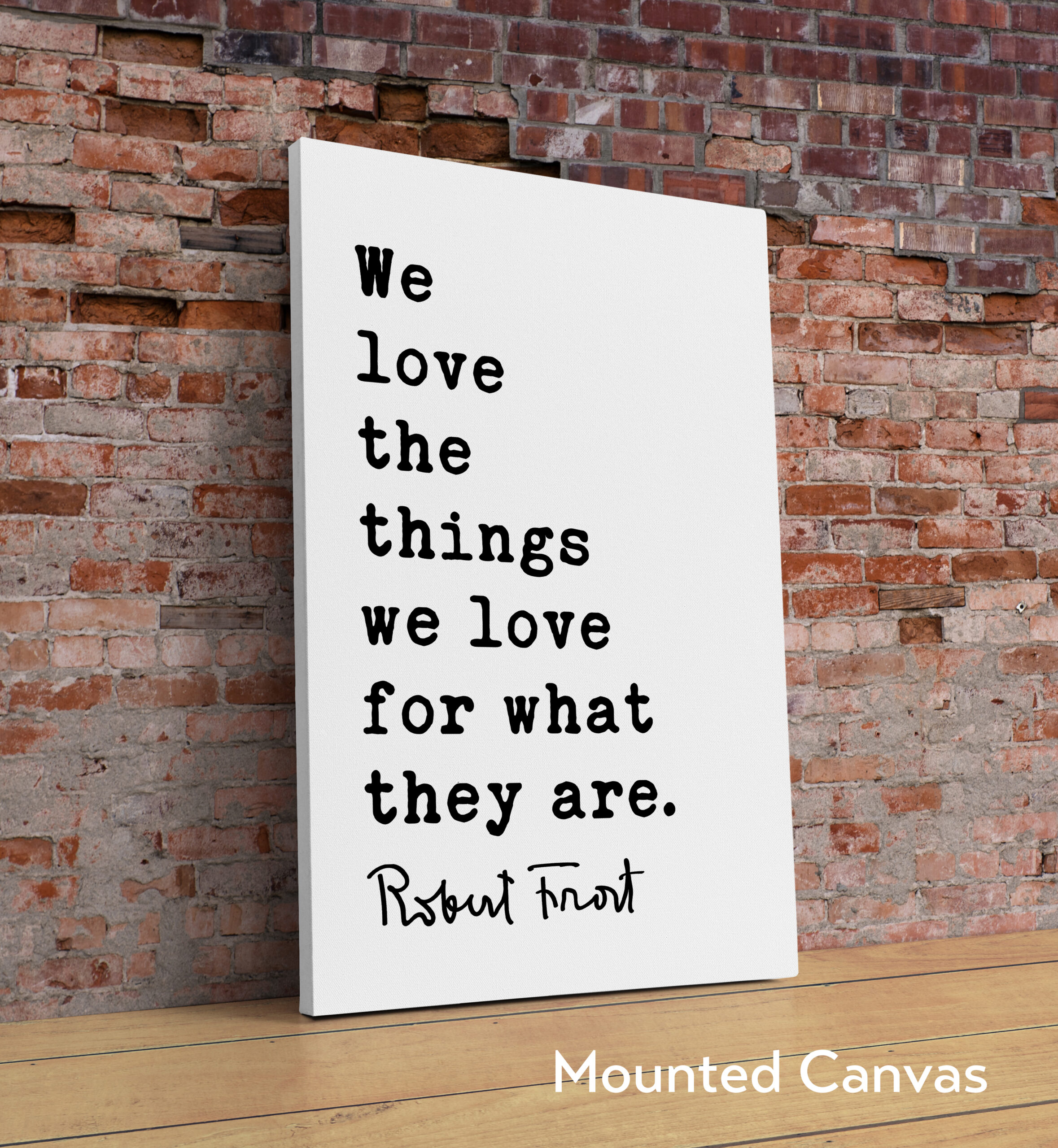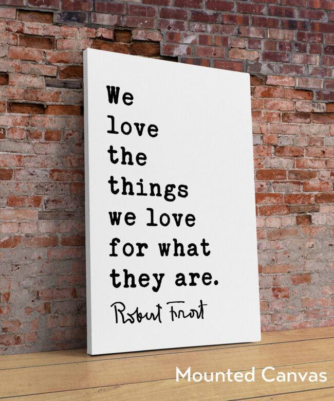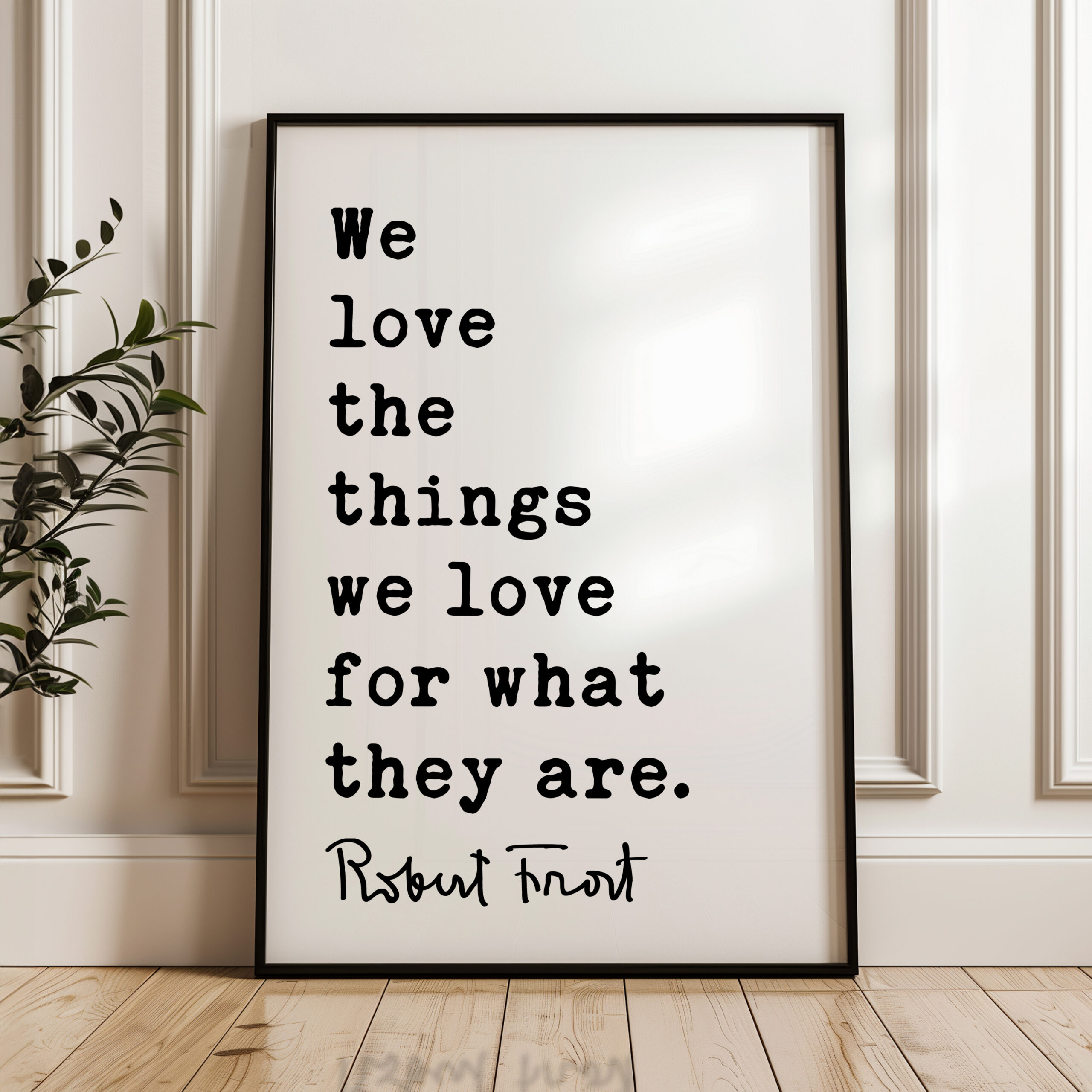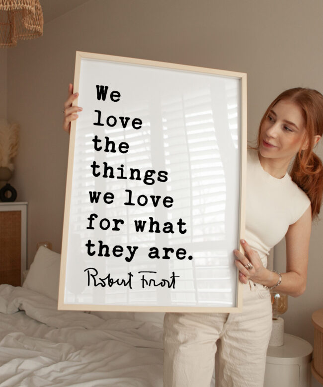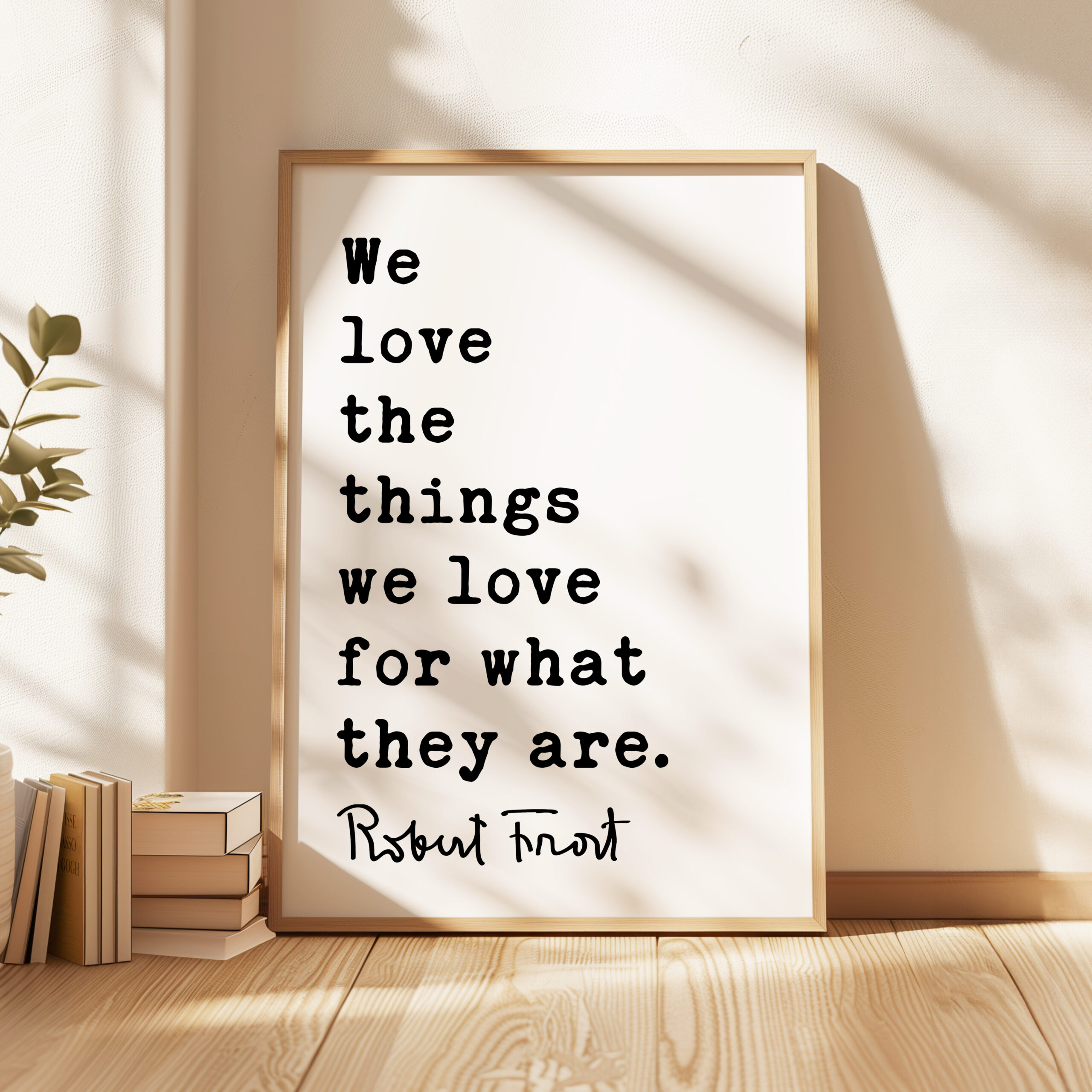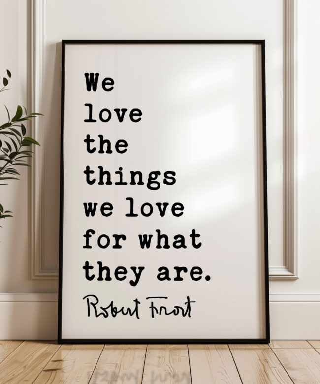 Embrace the simple beauty of appreciation with this elegant typography art print featuring Robert Frost’s timeless quote, “We love the things we love for what they are.” This artwork invites reflection on the true nature of love and connection.